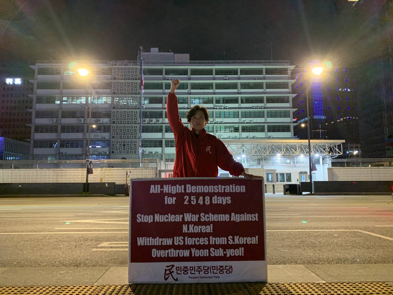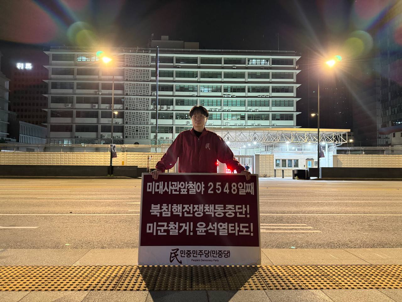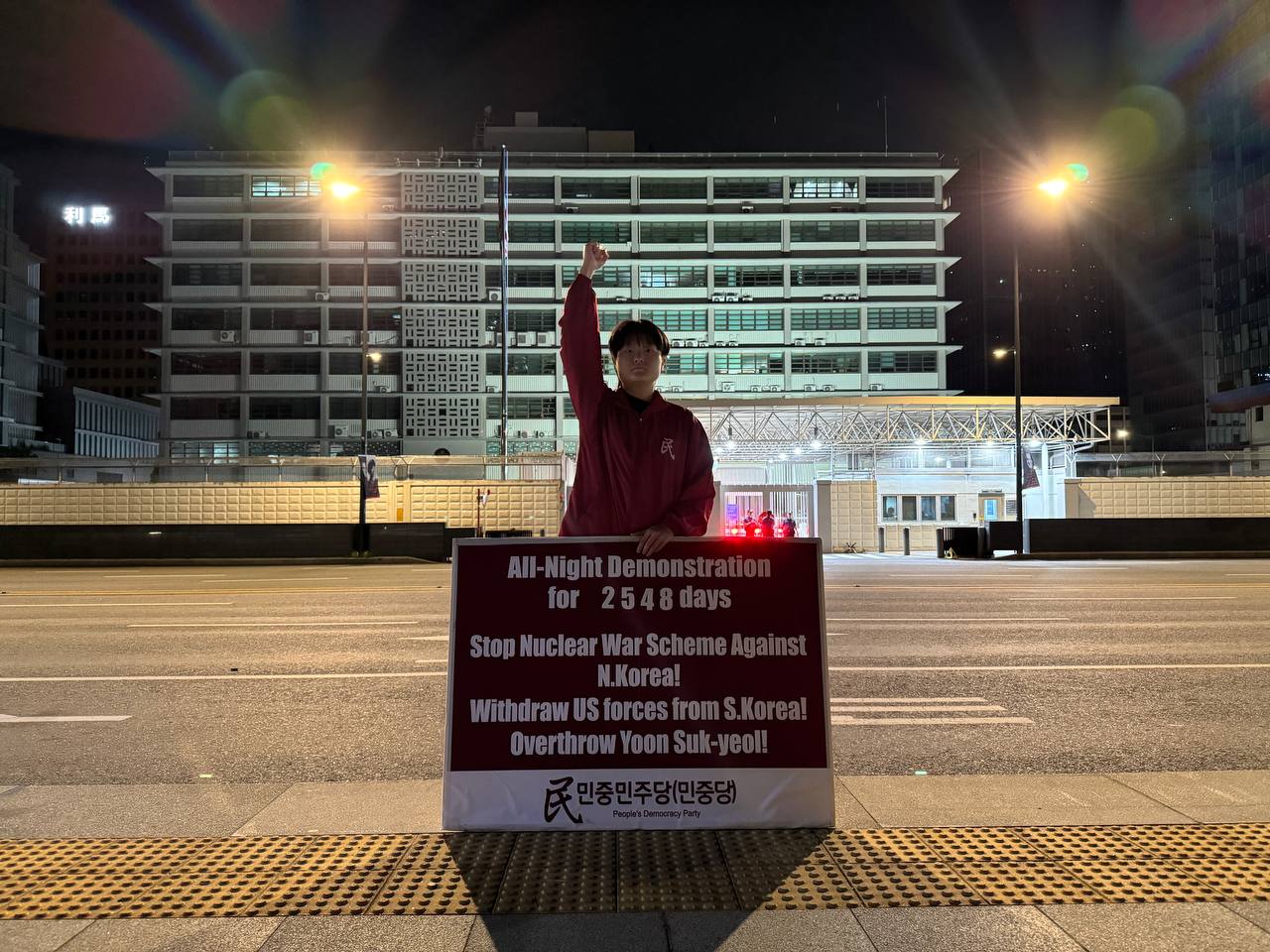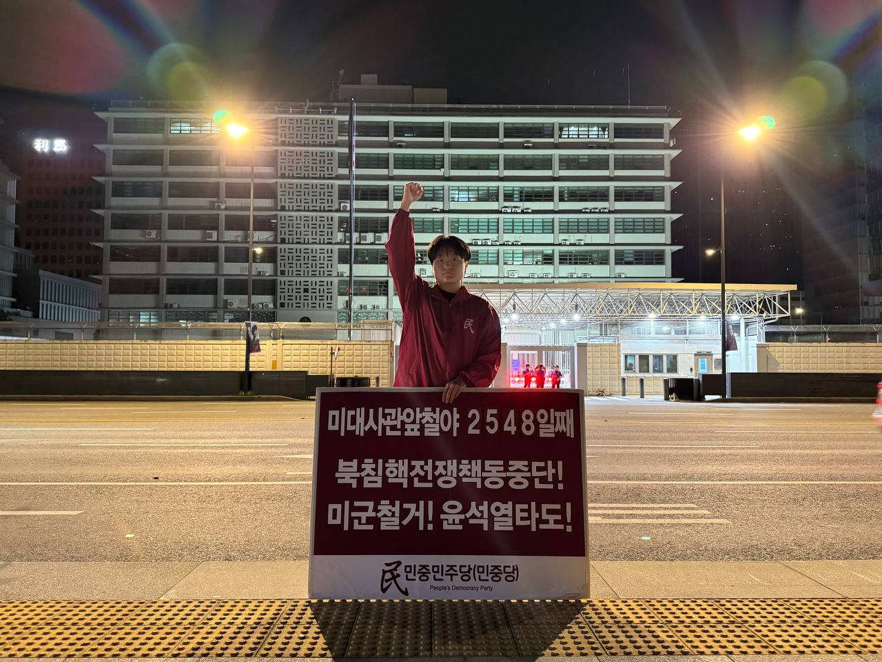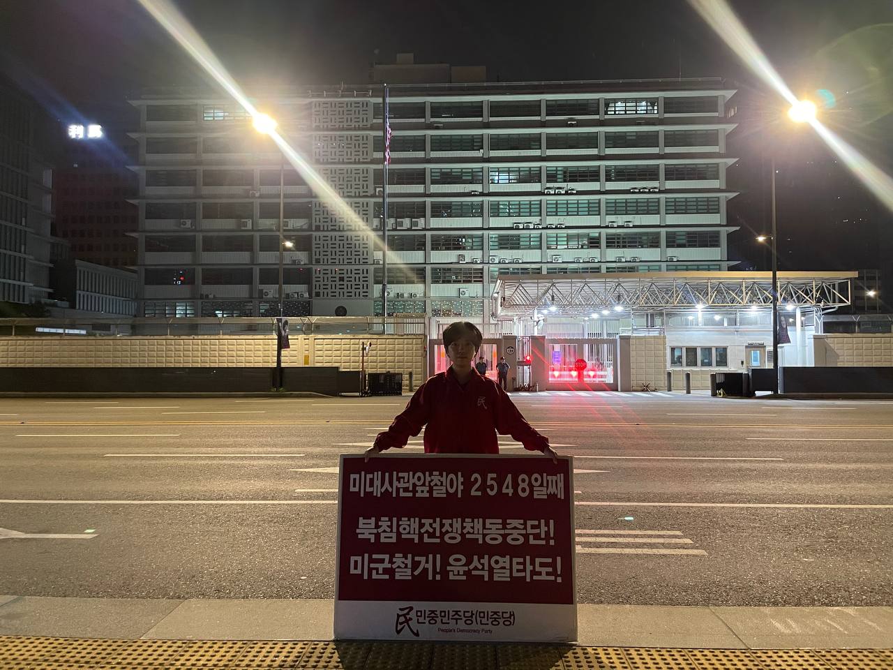 미대사관정문 맞은편에서는 우리말과 영어로 된 구호 <북침핵전쟁책동중단! 미군철거! 윤석열타도!>를 들고 <광화문미대사관앞철야시위>를 진행했다. <김병동석방! 윤석열타도!>, <검찰파쇼 정당탄압 전쟁계엄 윤석열타도!> 구호도 함께 들었다.