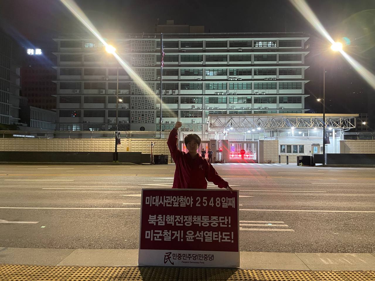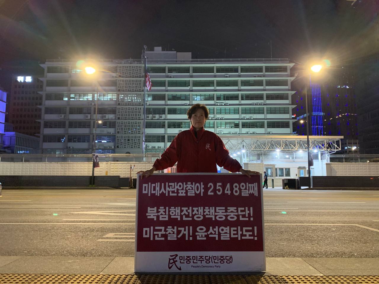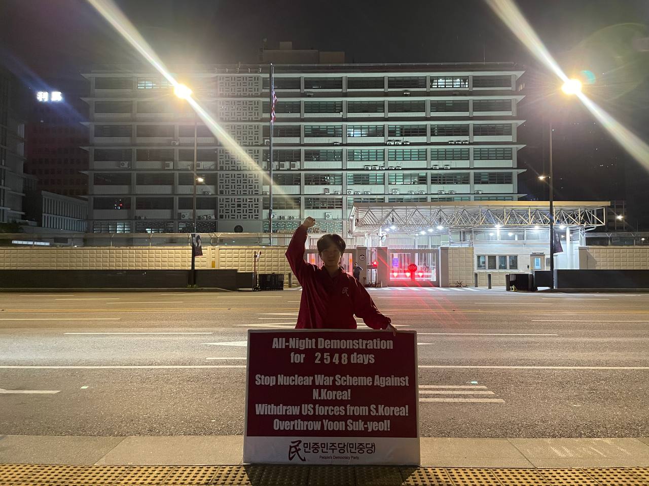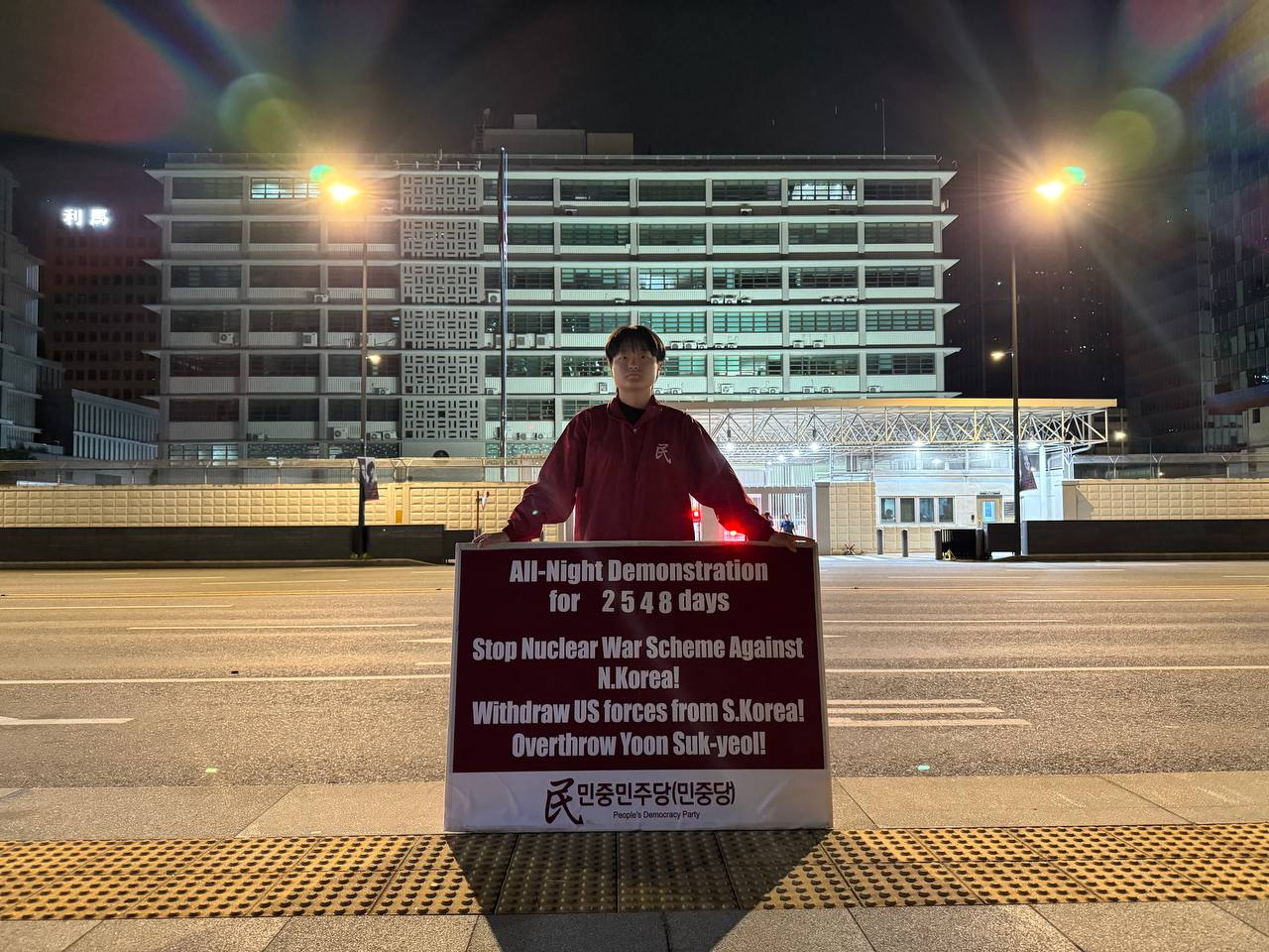 미대사관정문 맞은편에서는 우리말과 영어로 된 구호 <북침핵전쟁책동중단! 미군철거! 윤석열타도!>를 들고 <광화문미대사관앞철야시위>를 진행했다. <김병동석방! 윤석열타도!>, <검찰파쇼 정당탄압 전쟁계엄 윤석열타도!> 구호도 함께 들었다.