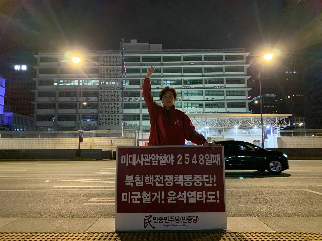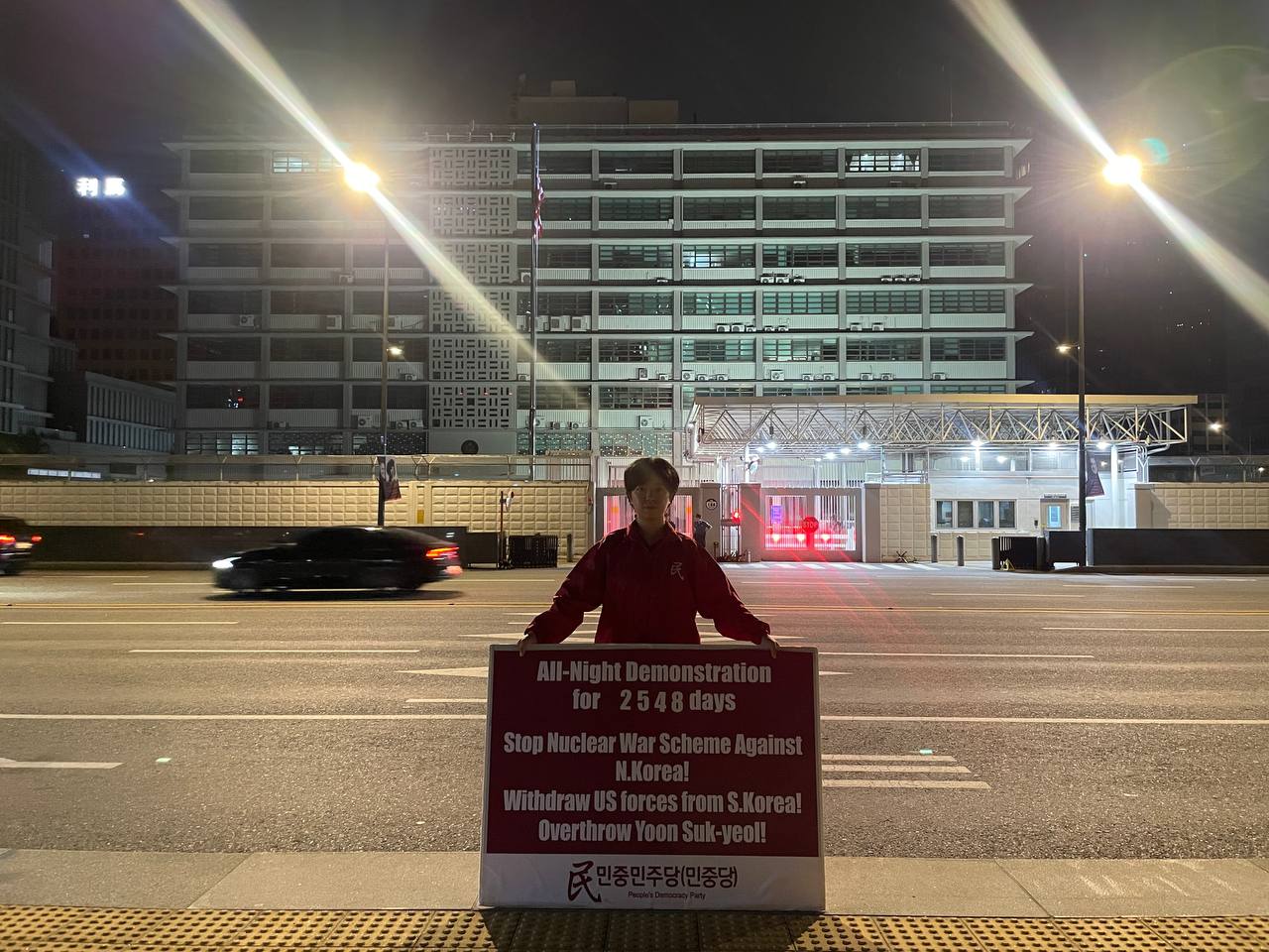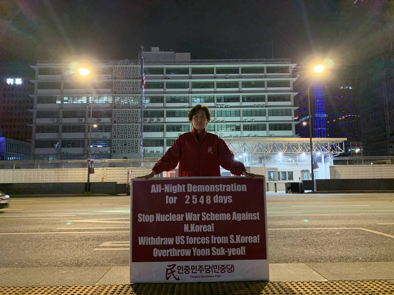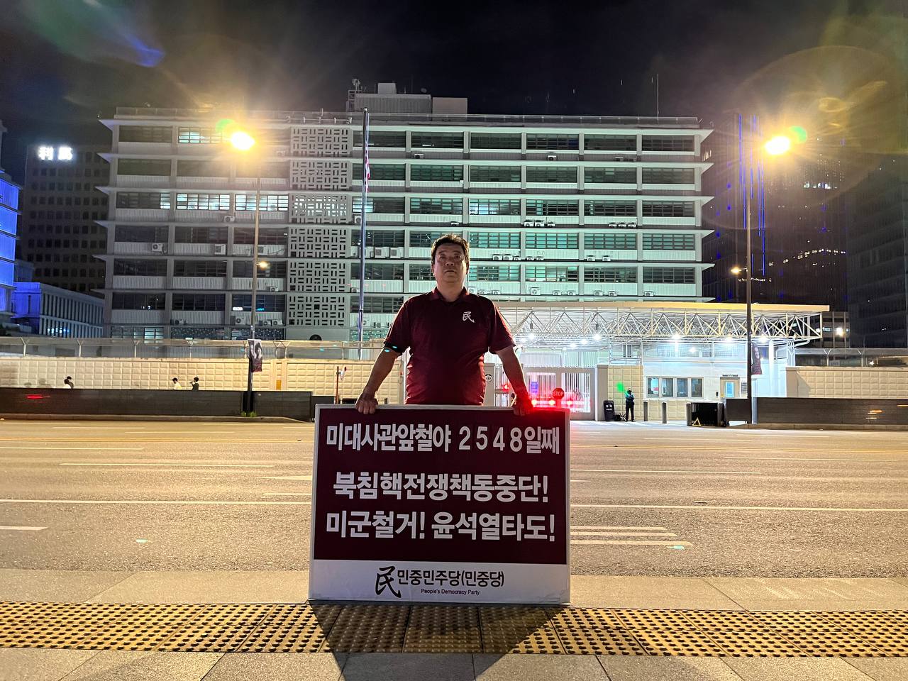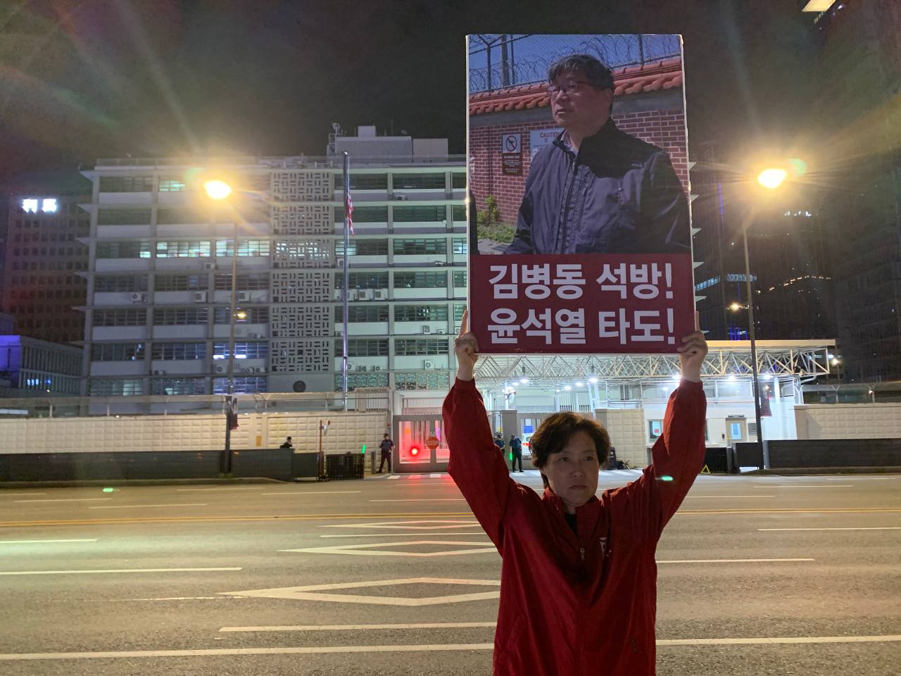 미대사관정문 맞은편에서는 우리말과 영어로 된 구호 <북침핵전쟁책동중단! 미군철거! 윤석열타도!>를 들고 <광화문미대사관앞철야시위>를 진행했다. <김병동석방! 윤석열타도!>, <검찰파쇼 정당탄압 전쟁계엄 윤석열타도!> 구호도 함께 들었다.
