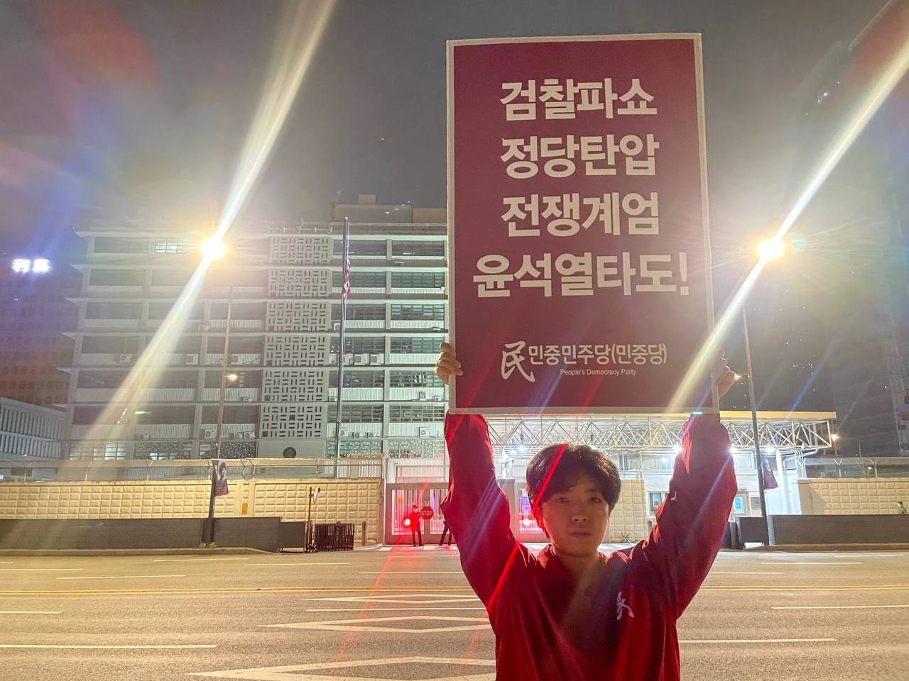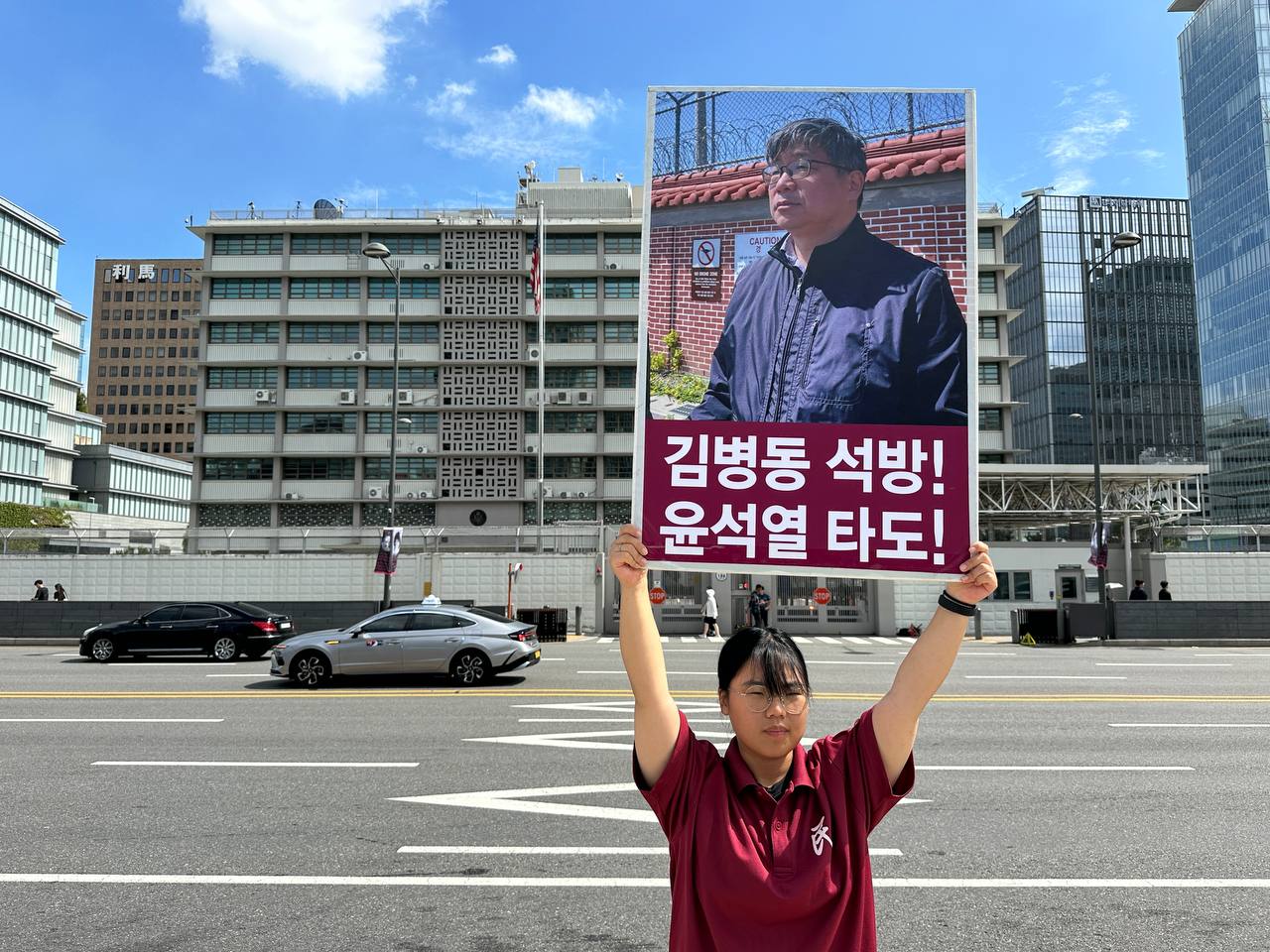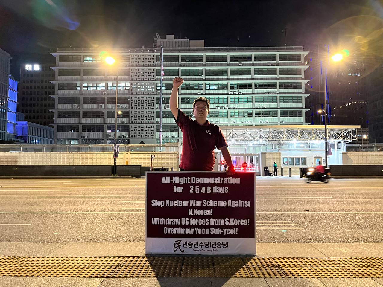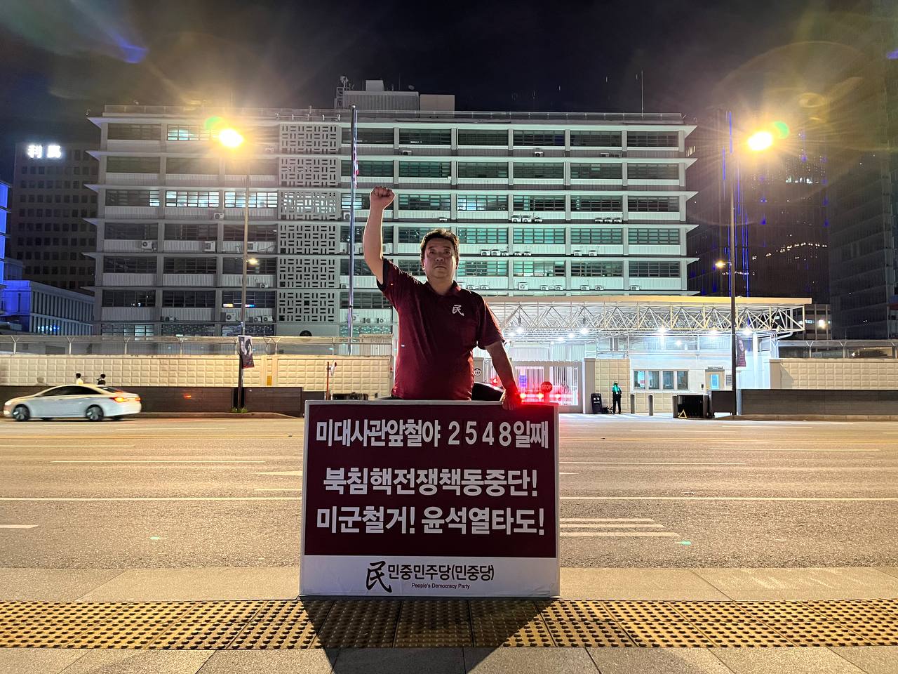 미대사관정문 맞은편에서는 우리말과 영어로 된 구호 <북침핵전쟁책동중단! 미군철거! 윤석열타도!>를 들고 <광화문미대사관앞철야시위>를 진행했다. <김병동석방! 윤석열타도!>, <검찰파쇼 정당탄압 전쟁계엄 윤석열타도!> 구호도 함께 들었다.