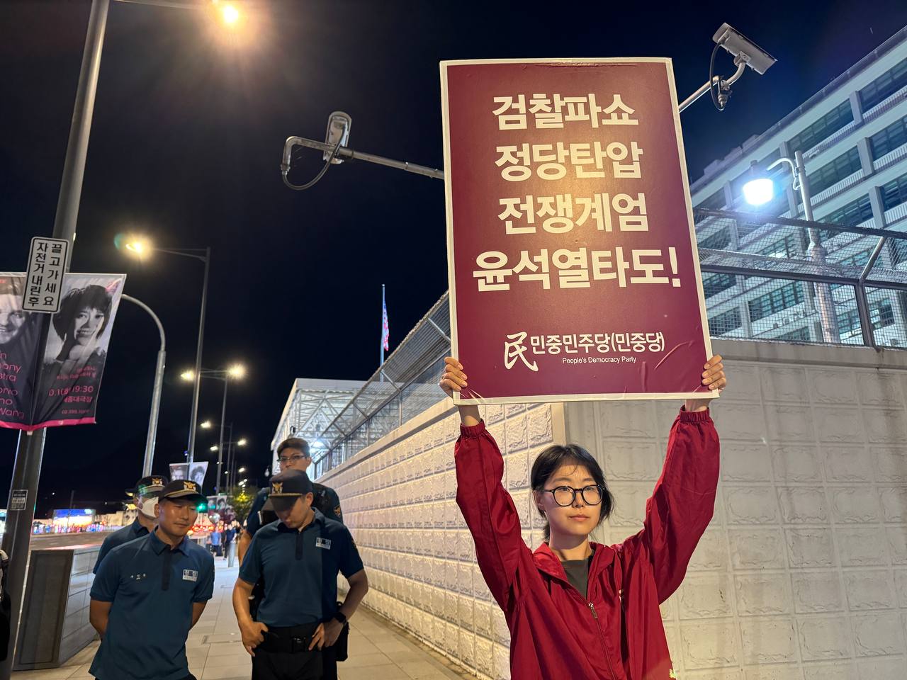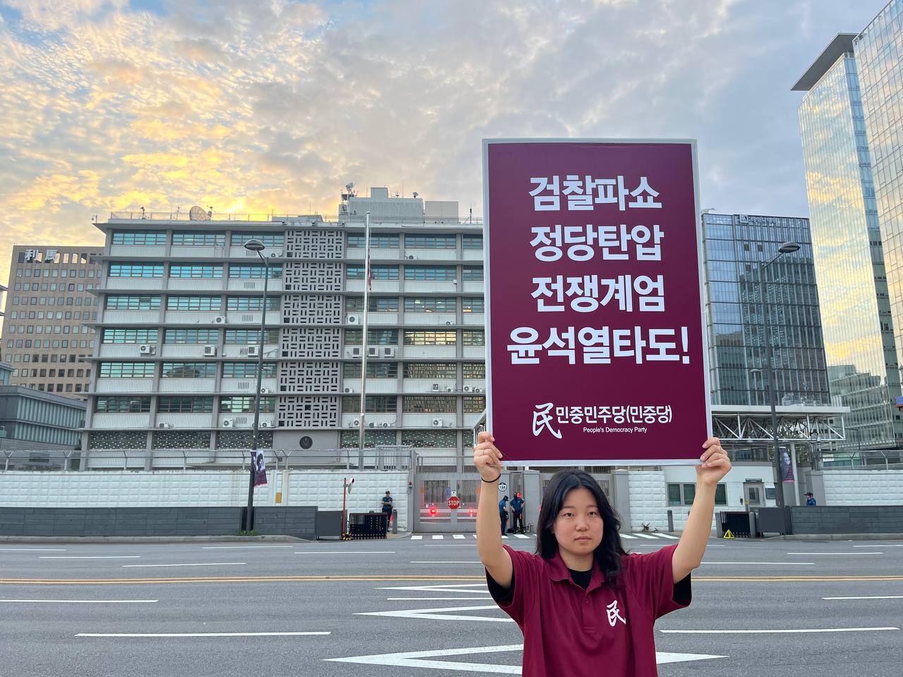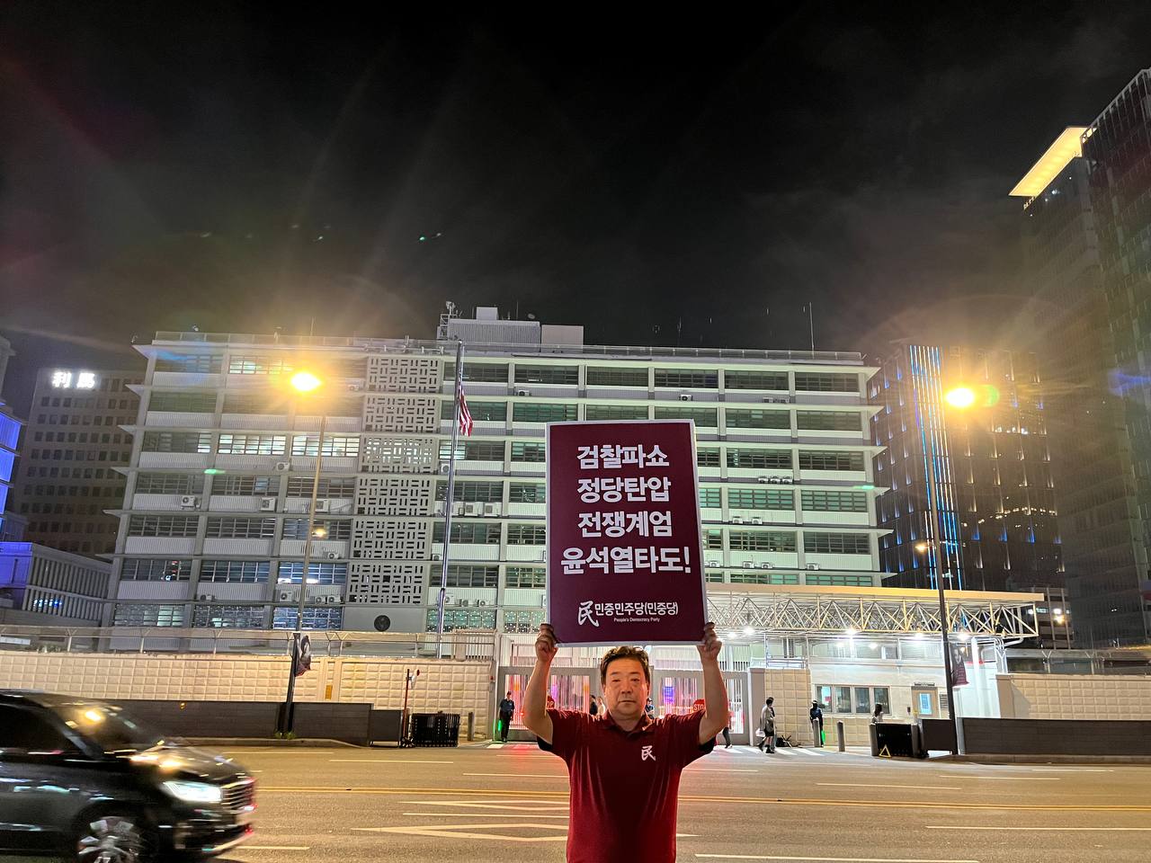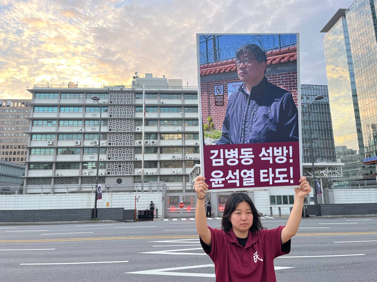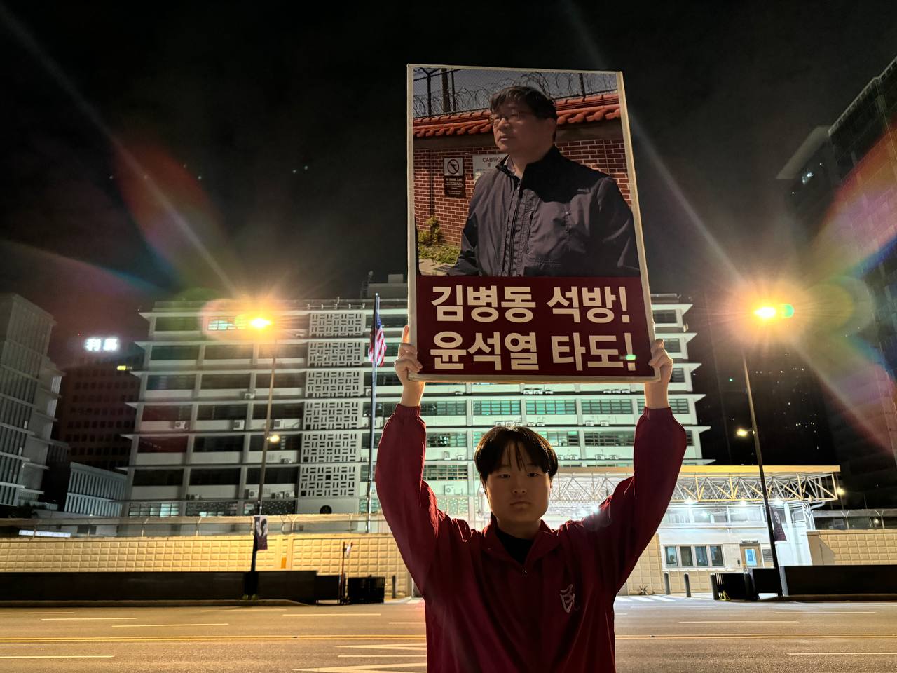 미대사관정문 맞은편에서는 우리말과 영어로 된 구호 <북침핵전쟁책동중단! 미군철거! 윤석열타도!>를 들고 <광화문미대사관앞철야시위>를 진행했다. <김병동석방! 윤석열타도!>, <검찰파쇼 정당탄압 전쟁계엄 윤석열타도!> 구호도 함께 들었다.