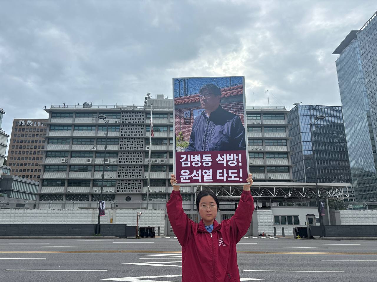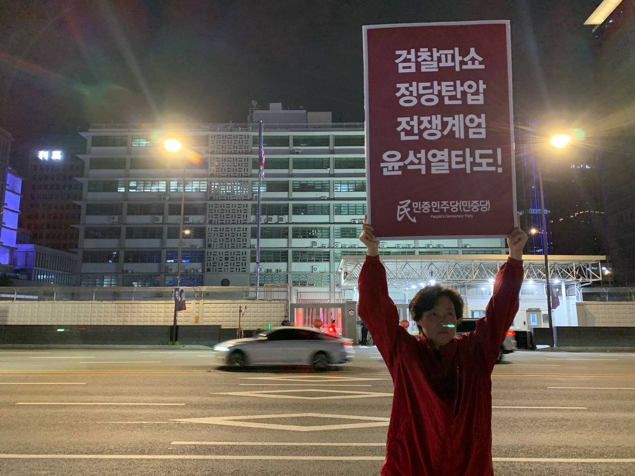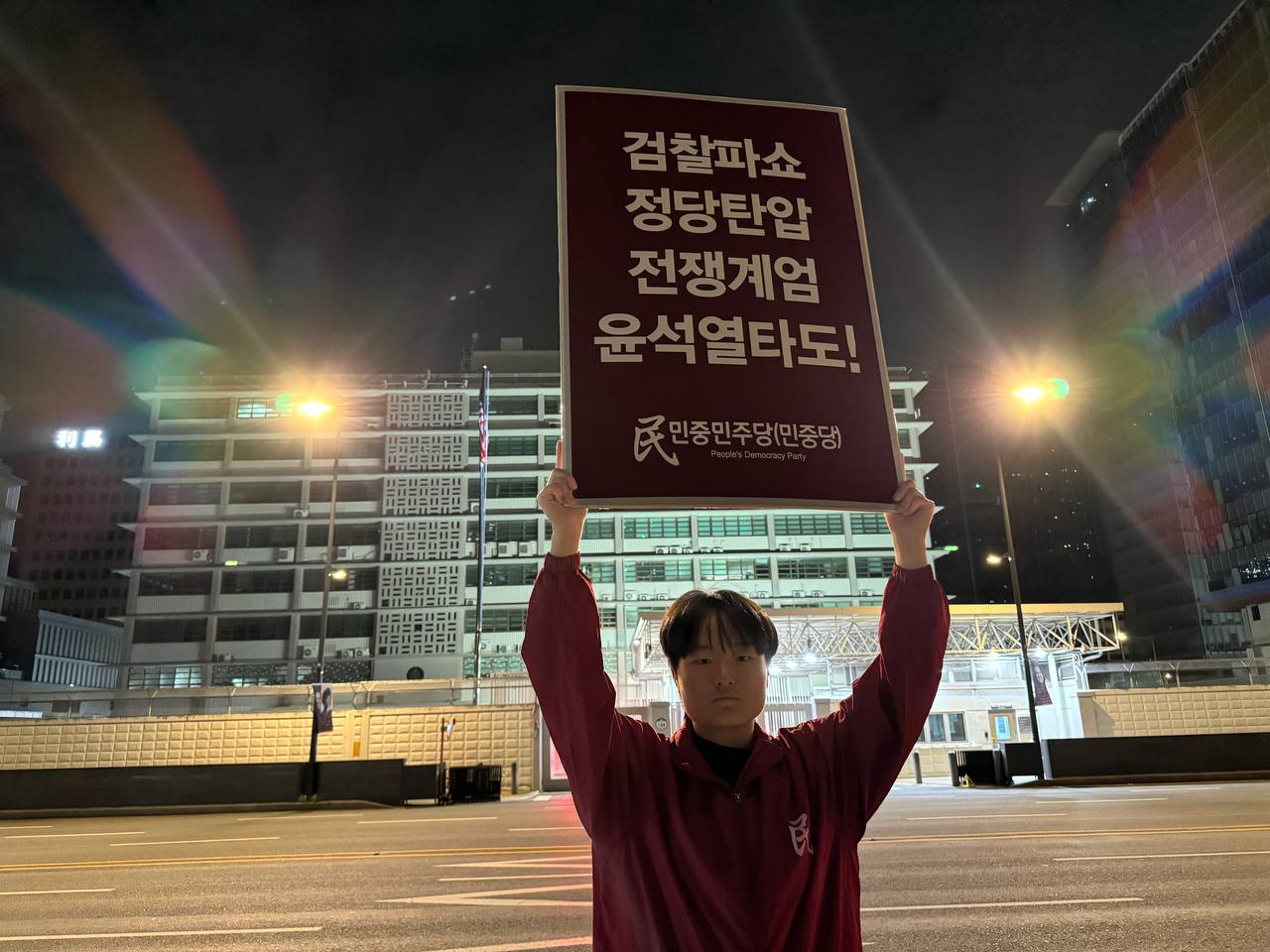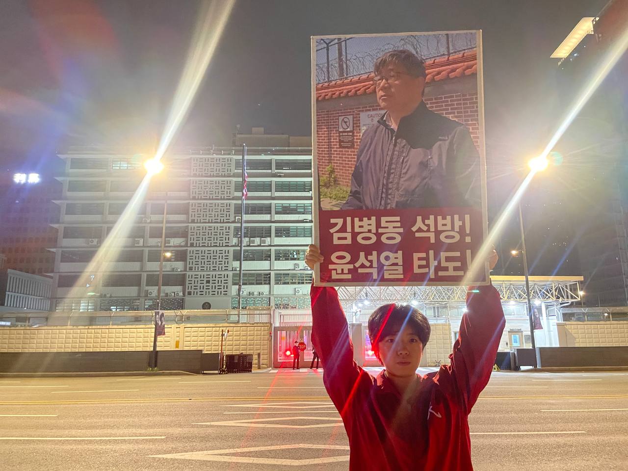 미대사관정문 맞은편에서는 우리말과 영어로 된 구호 <북침핵전쟁책동중단! 미군철거! 윤석열타도!>를 들고 <광화문미대사관앞철야시위>를 진행했다. <김병동석방! 윤석열타도!>, <검찰파쇼 정당탄압 전쟁계엄 윤석열타도!> 구호도 함께 들었다.