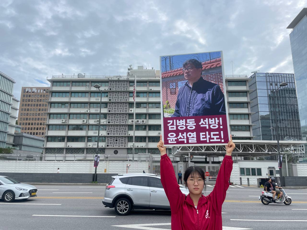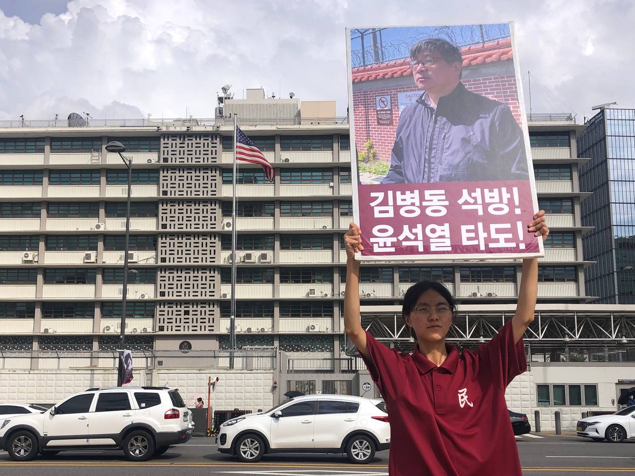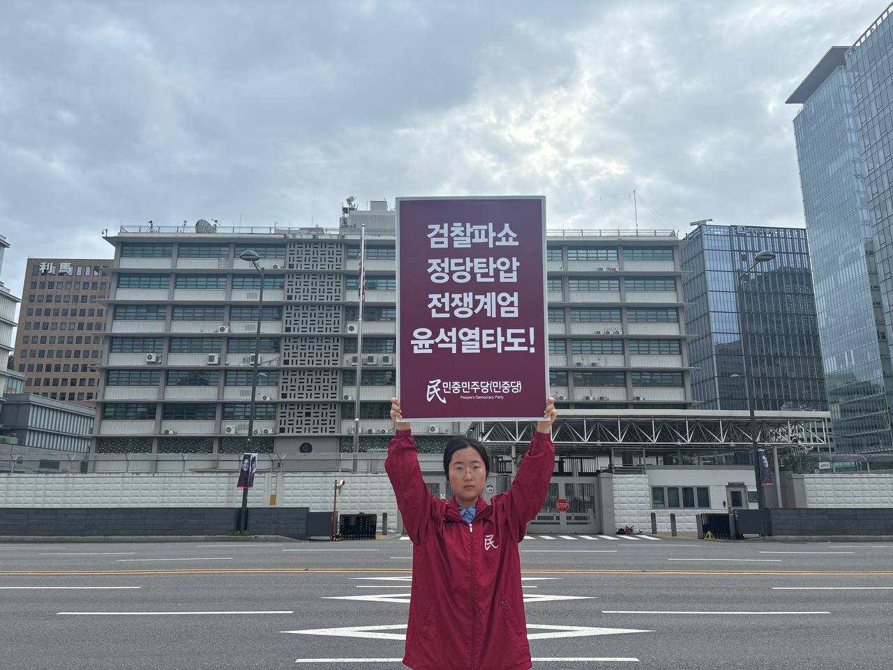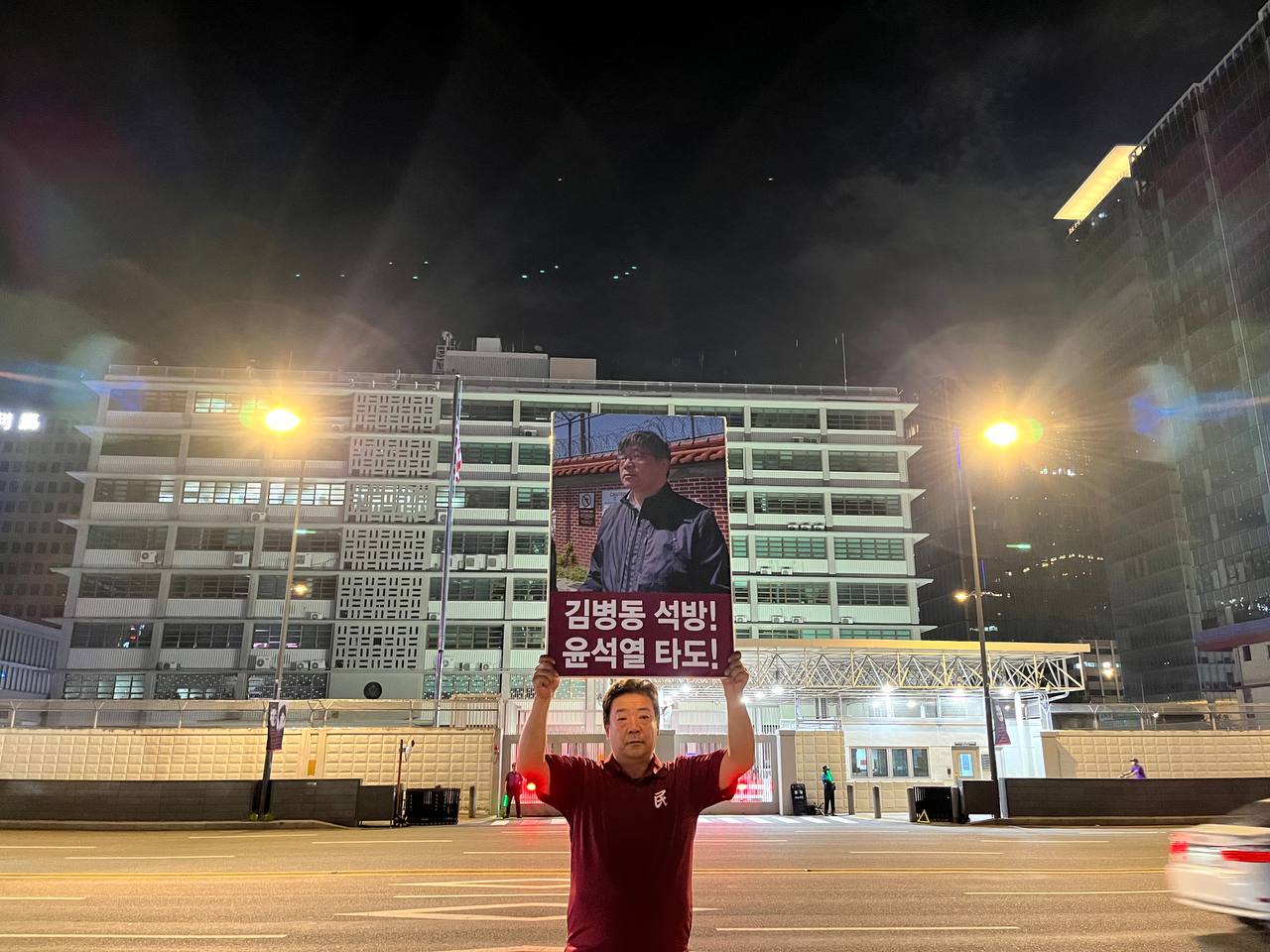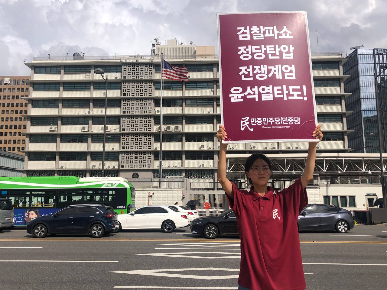 미대사관정문 맞은편에서는 우리말과 영어로 된 구호 <북침핵전쟁책동중단! 미군철거! 윤석열타도!>를 들고 <광화문미대사관앞철야시위>를 진행했다. <김병동석방! 윤석열타도!>, <검찰파쇼 정당탄압 전쟁계엄 윤석열타도!> 구호도 함께 들었다.