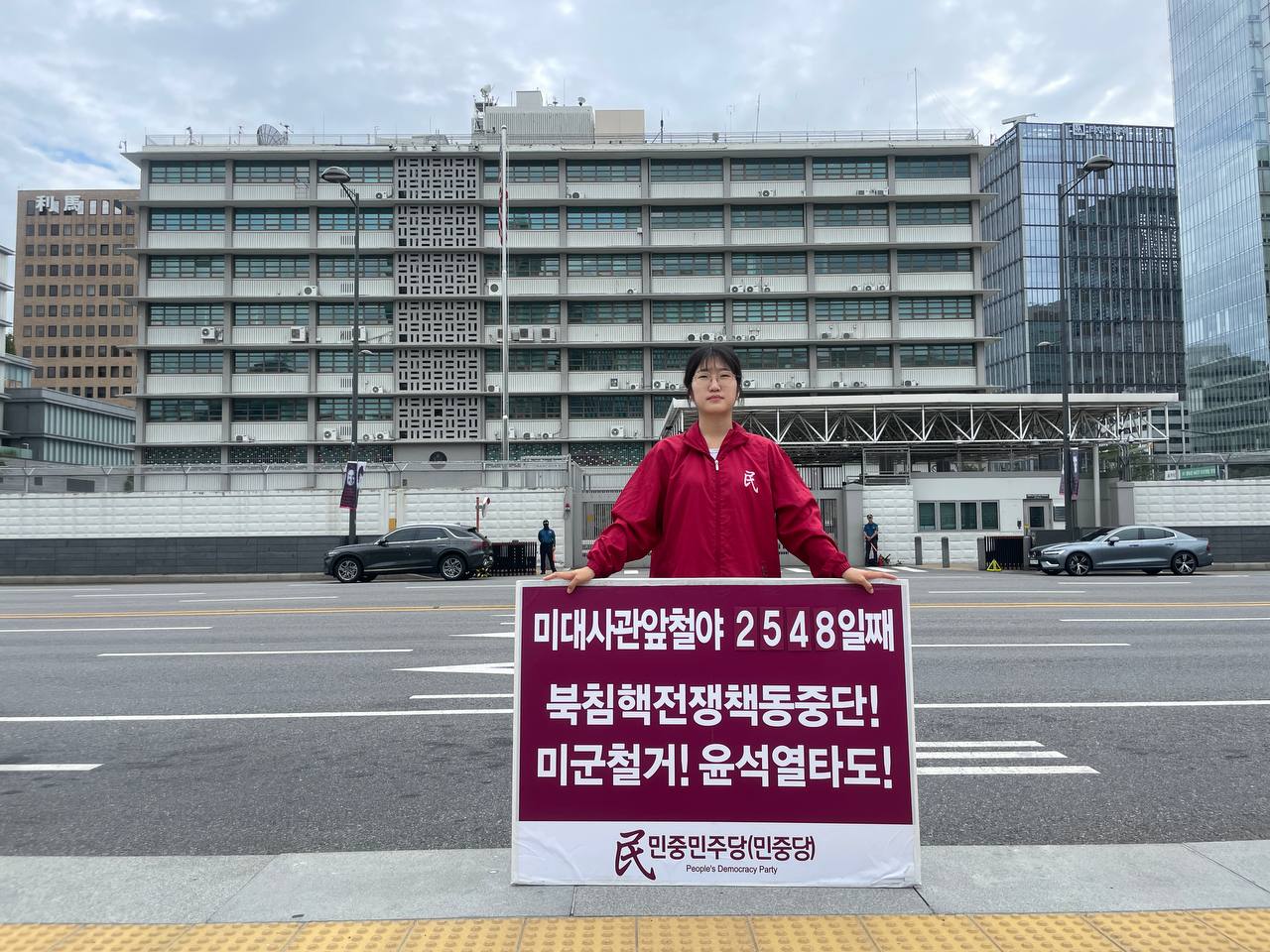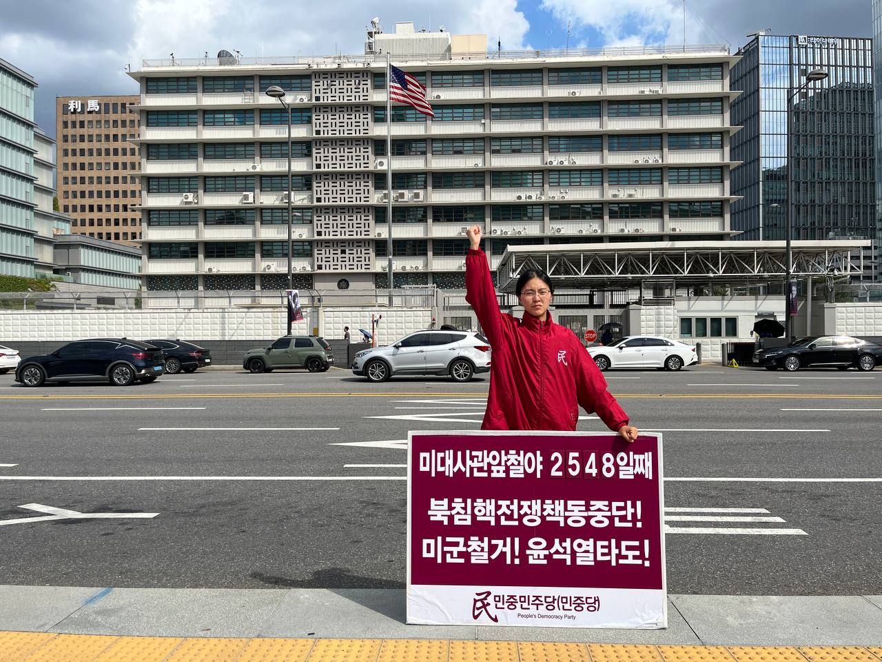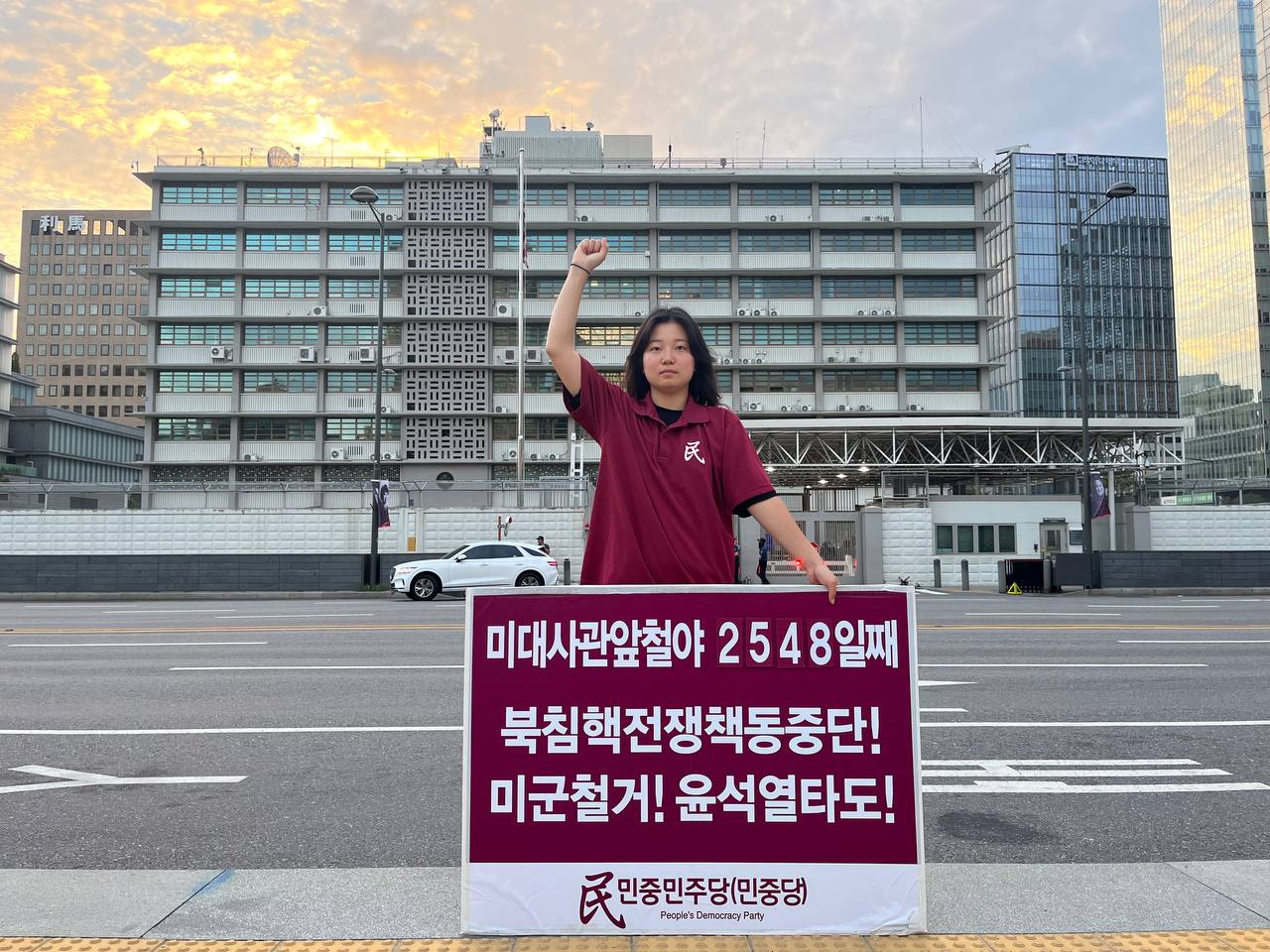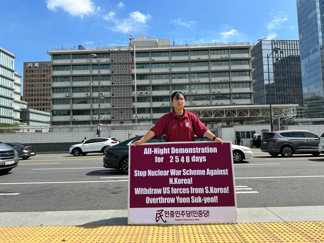 17일 민중민주당(민중당)은 미대사관앞에서 <친미호전윤석열타도! 북침핵전쟁책동중단! 핵전쟁화근 미군철거!> 구호를 들고 평화시위를 2981일째 전개했다.