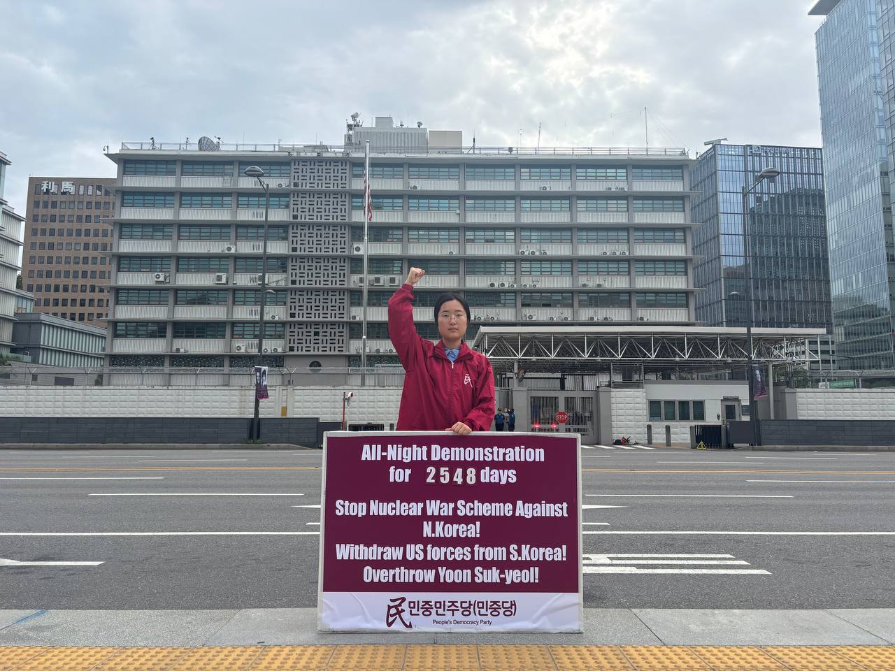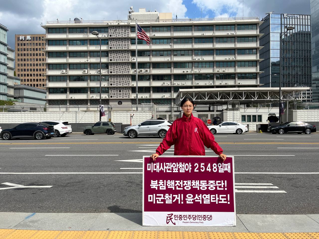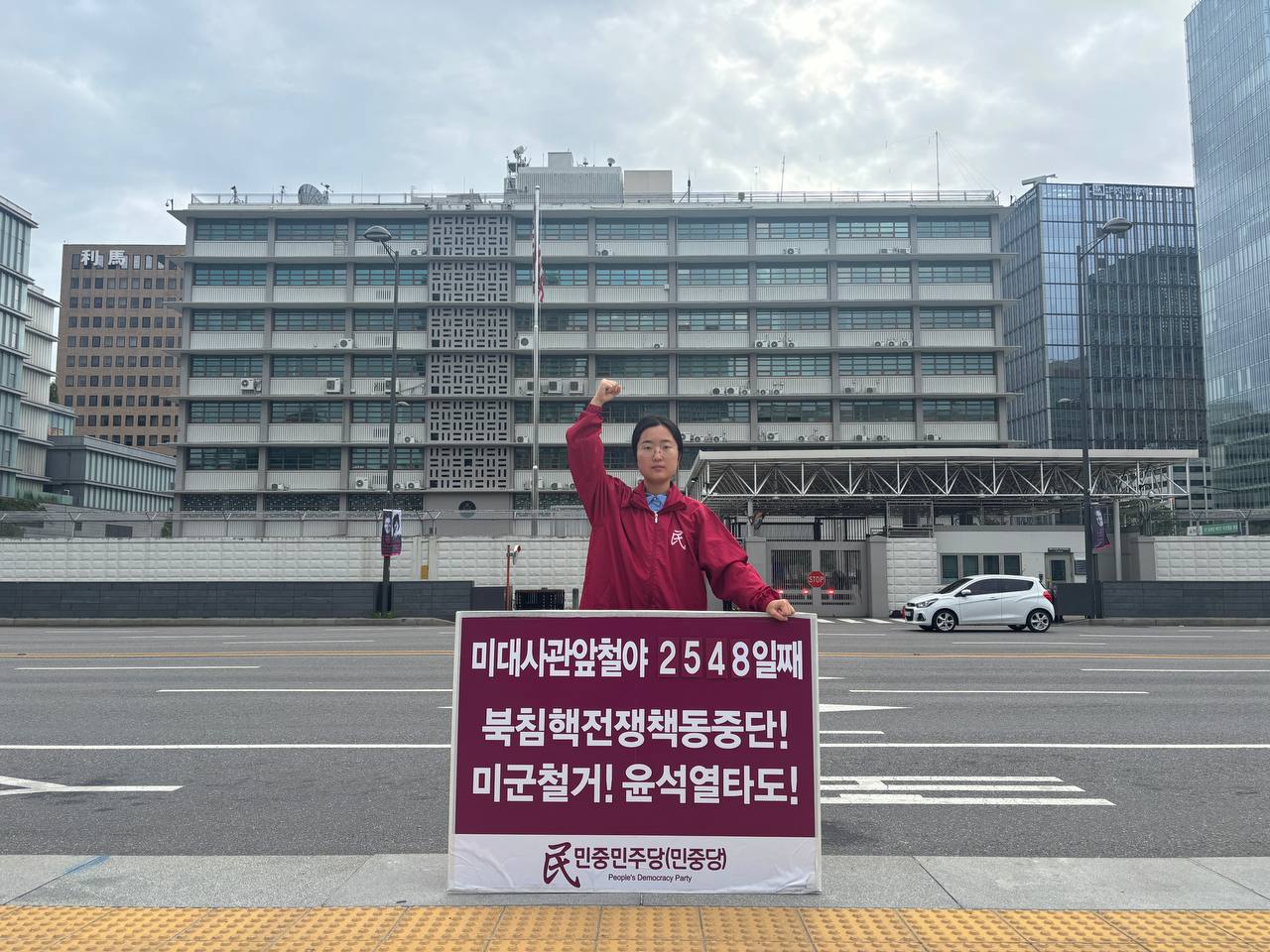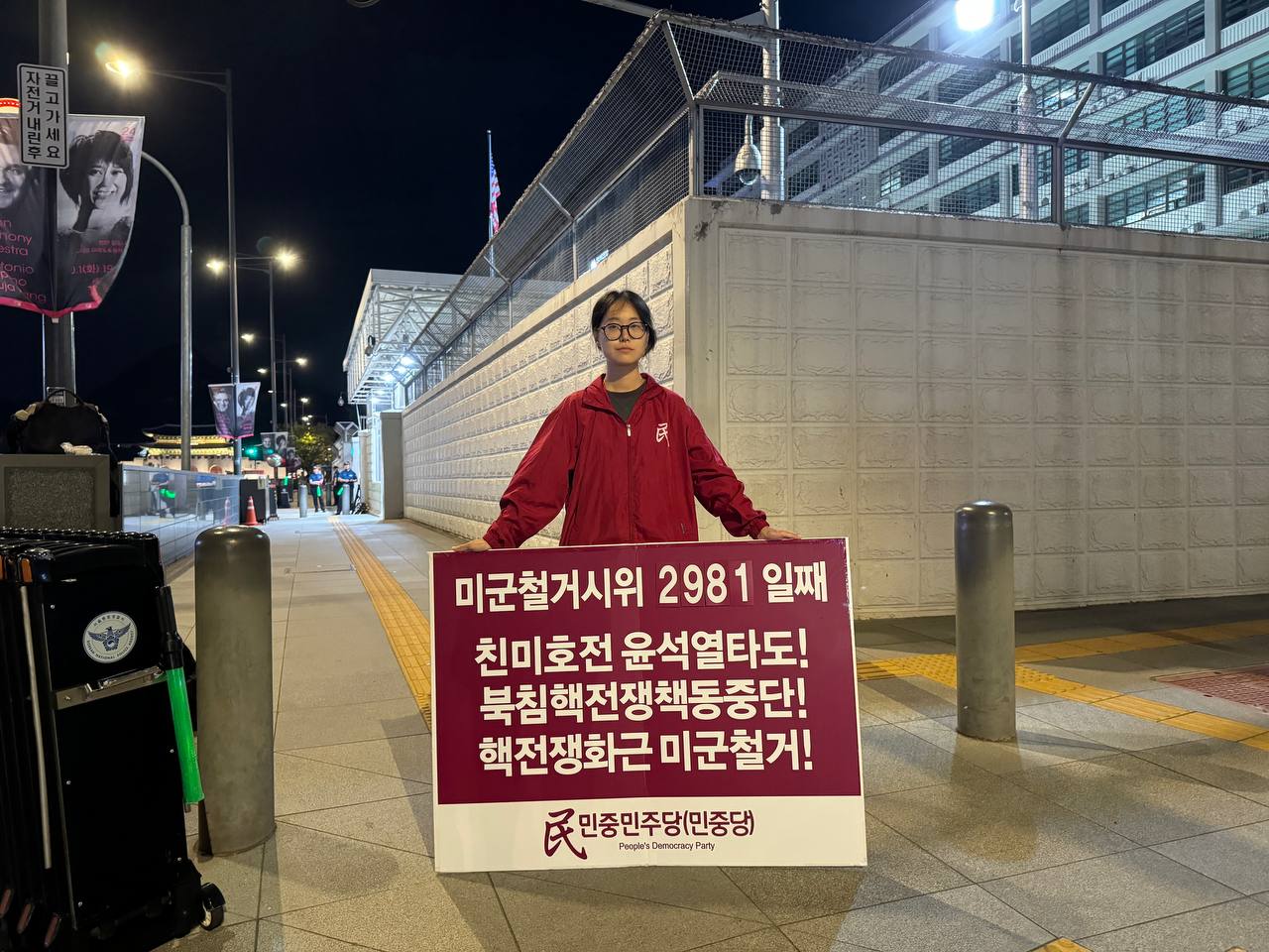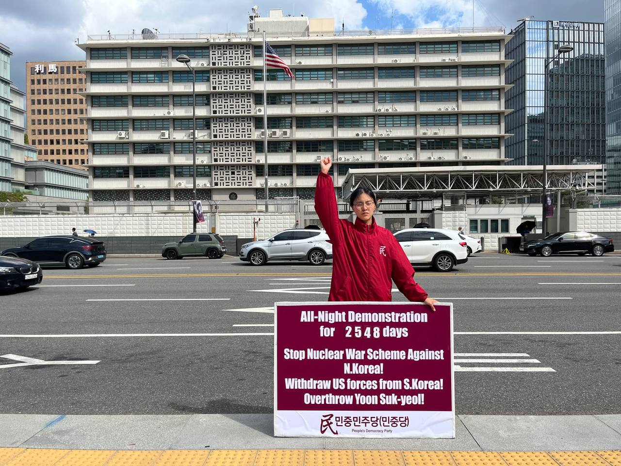 17일 민중민주당(민중당)은 미대사관앞에서 <친미호전윤석열타도! 북침핵전쟁책동중단! 핵전쟁화근 미군철거!> 구호를 들고 평화시위를 2981일째 전개했다.