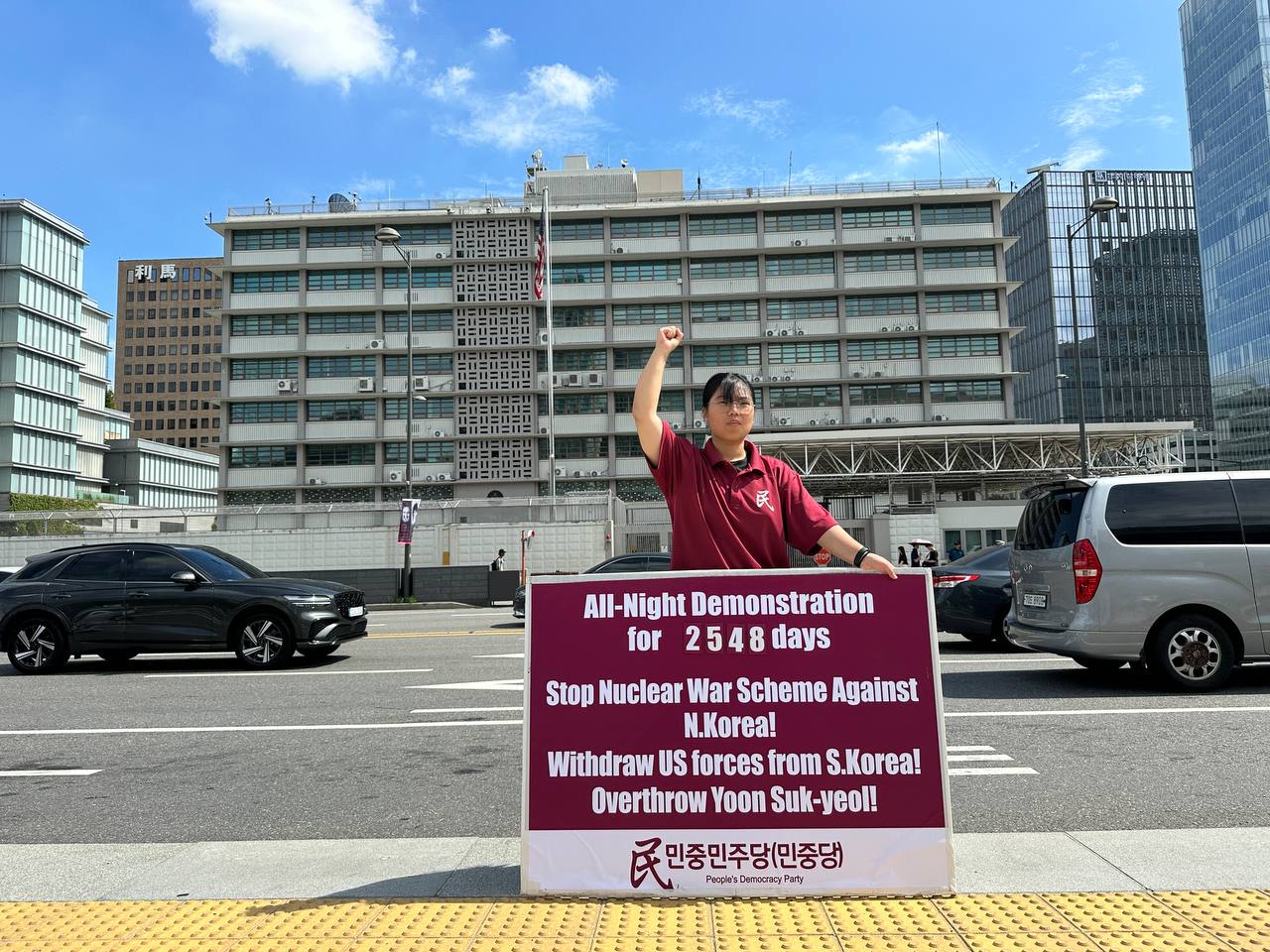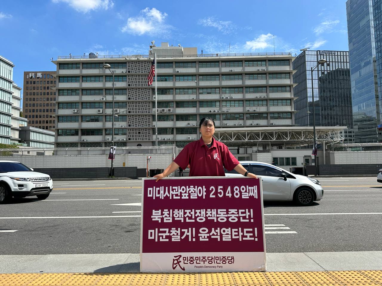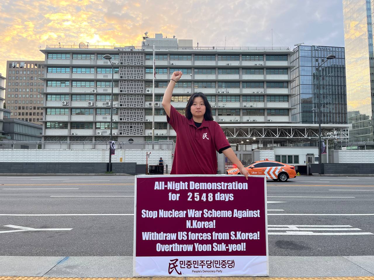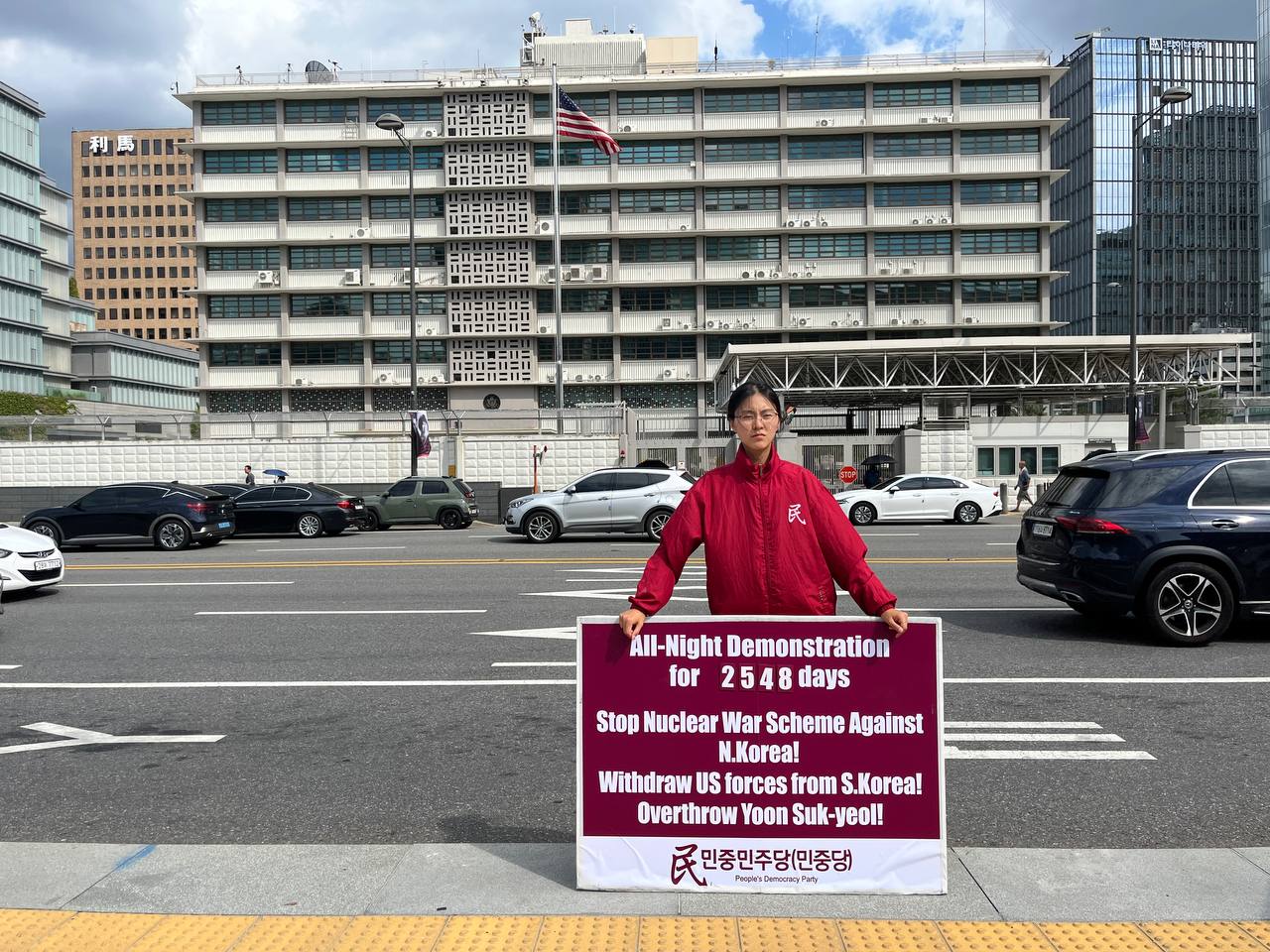 17일 민중민주당(민중당)은 미대사관앞에서 <친미호전윤석열타도! 북침핵전쟁책동중단! 핵전쟁화근 미군철거!> 구호를 들고 평화시위를 2981일째 전개했다.