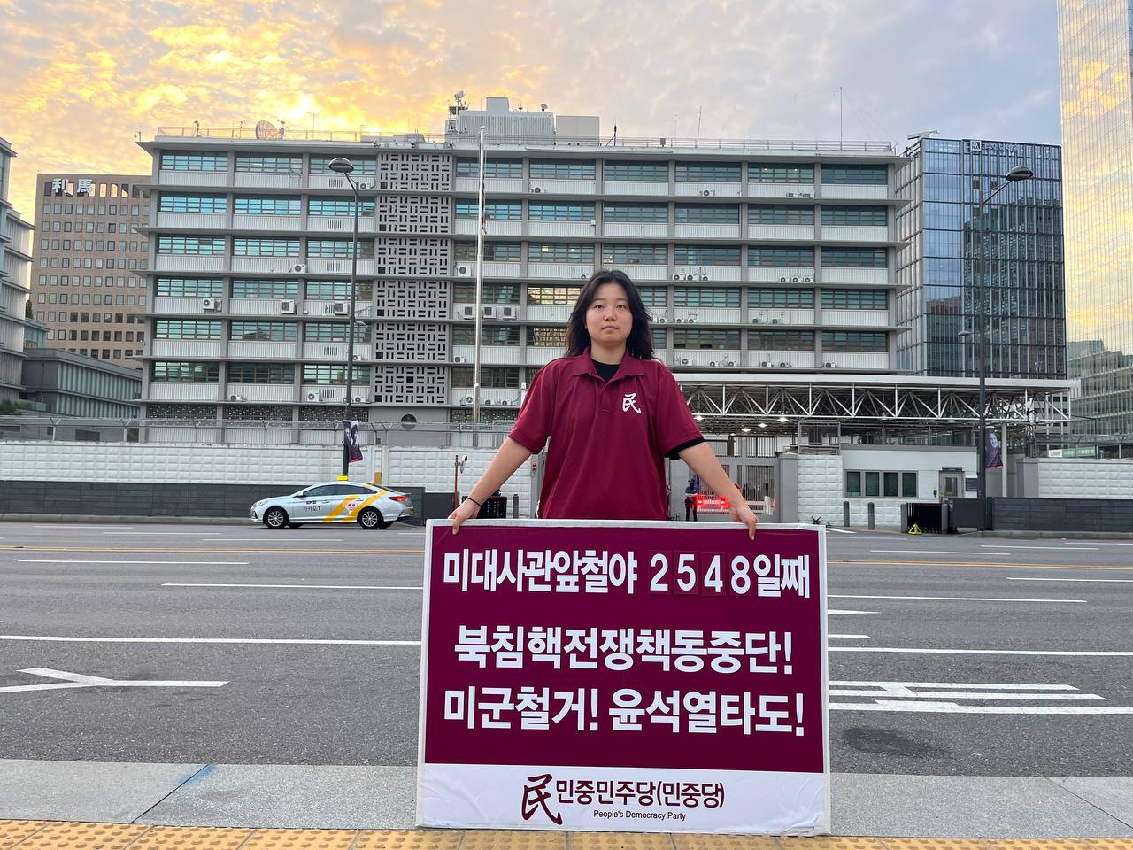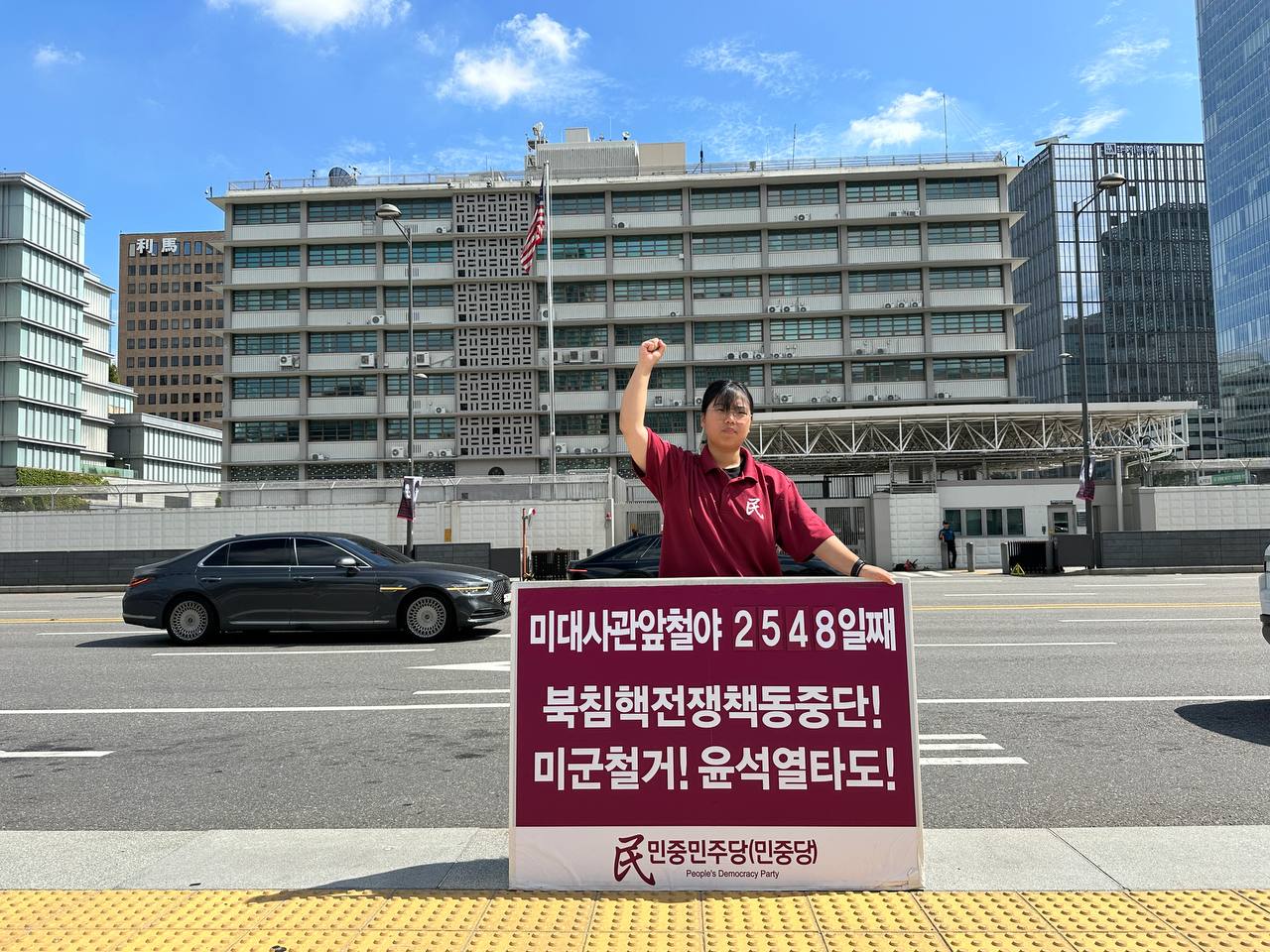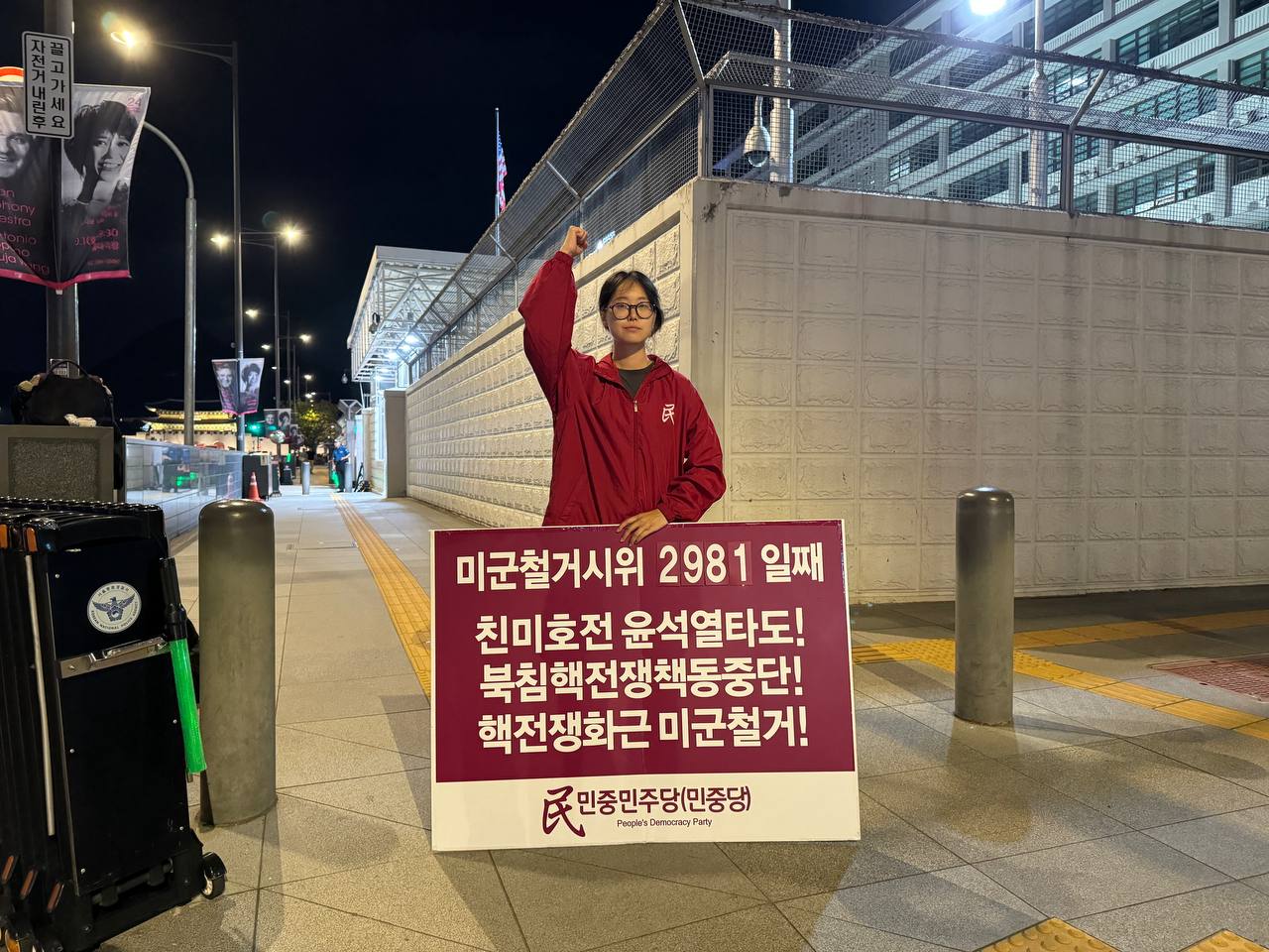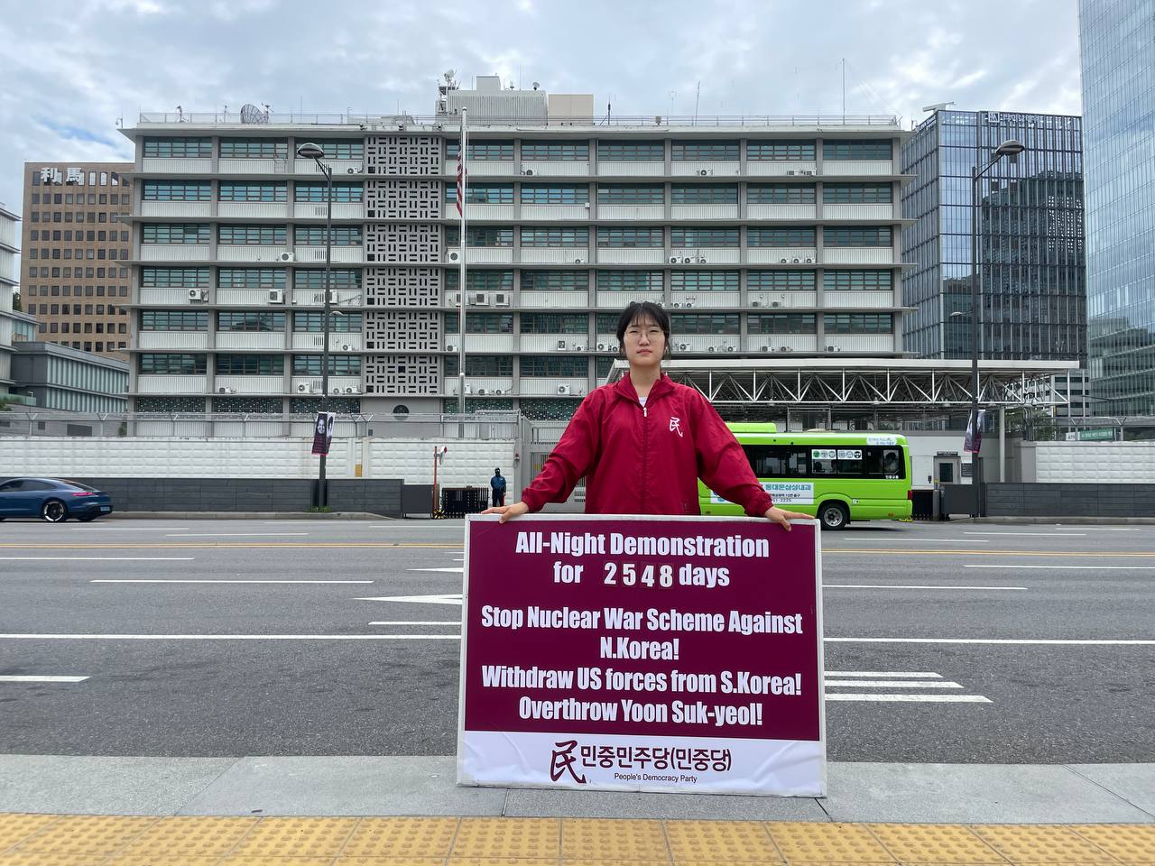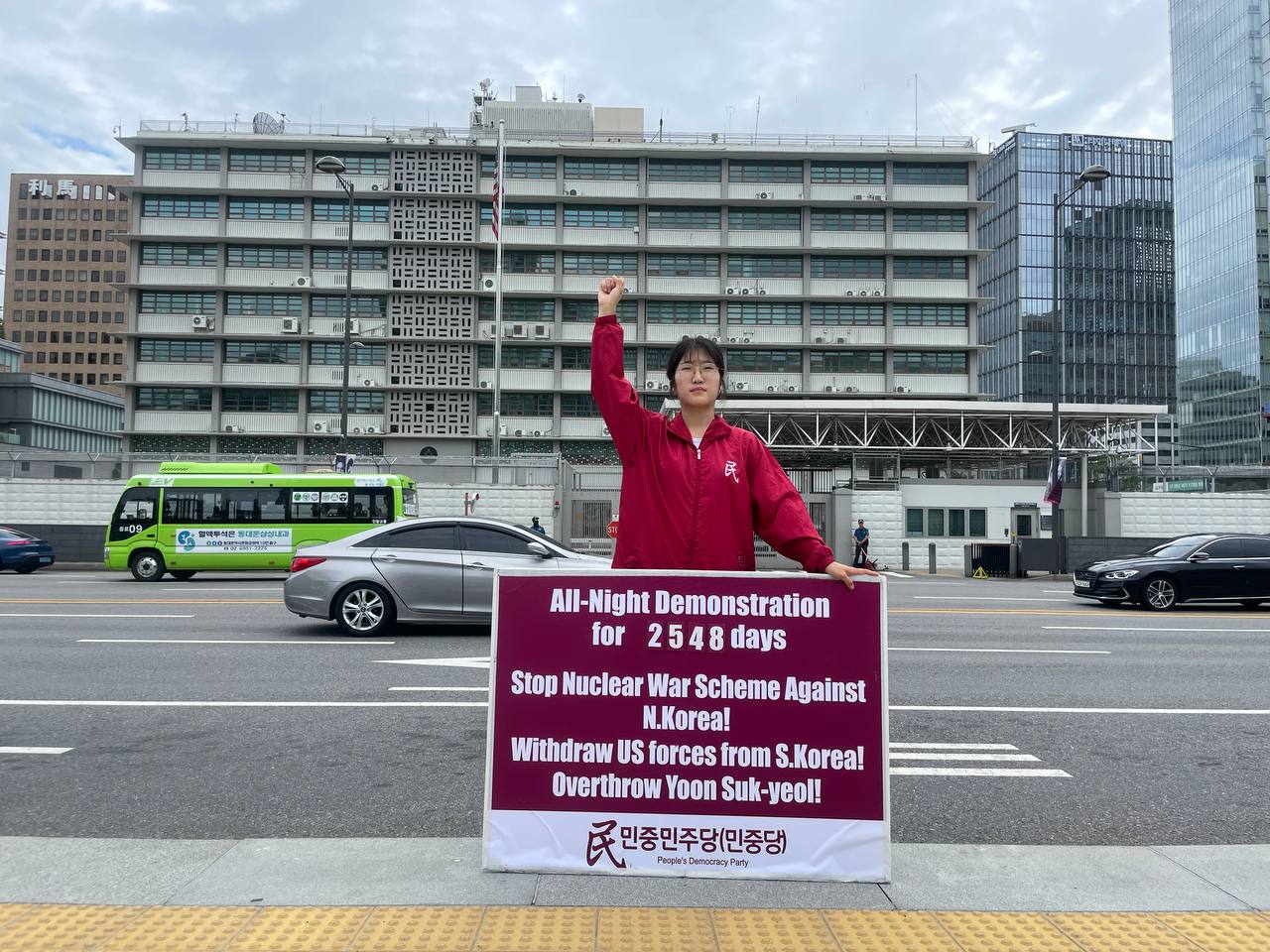 17일 민중민주당(민중당)은 미대사관앞에서 <친미호전윤석열타도! 북침핵전쟁책동중단! 핵전쟁화근 미군철거!> 구호를 들고 평화시위를 2981일째 전개했다.