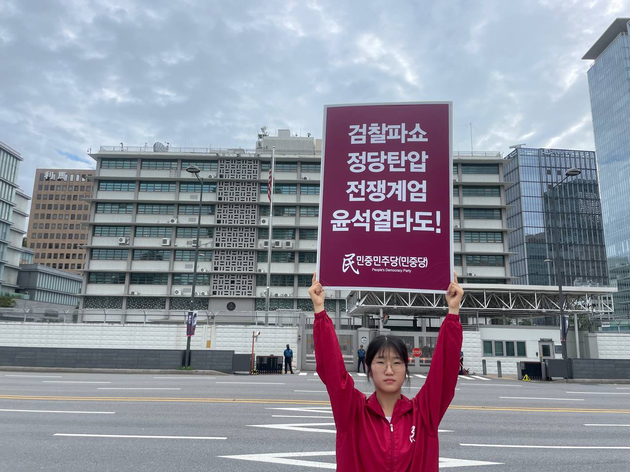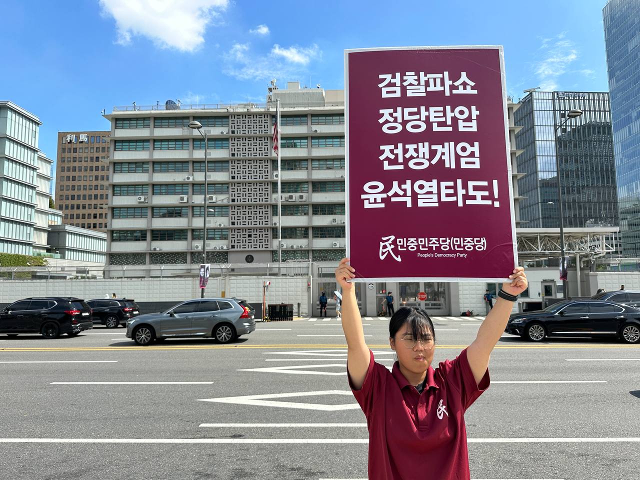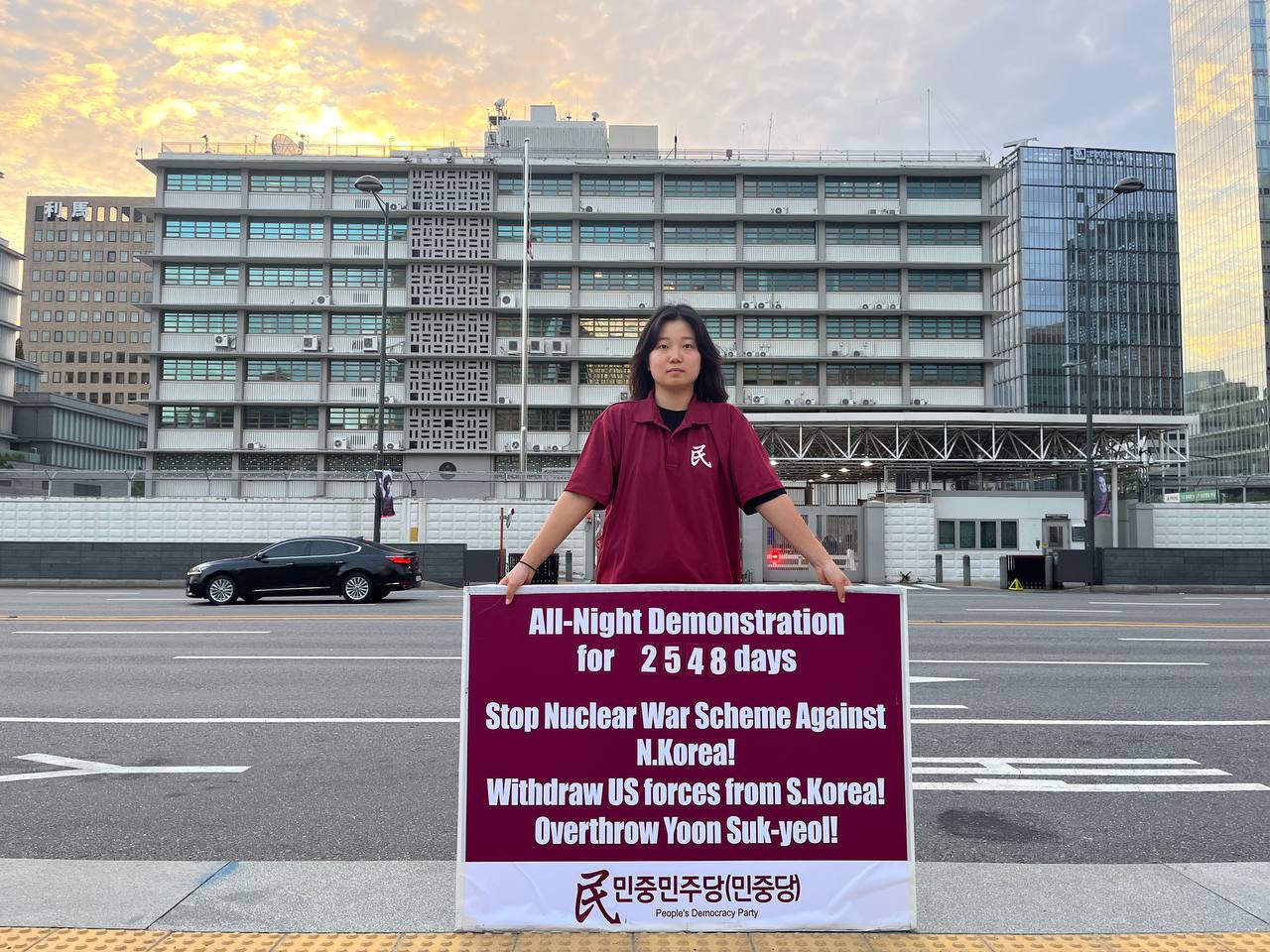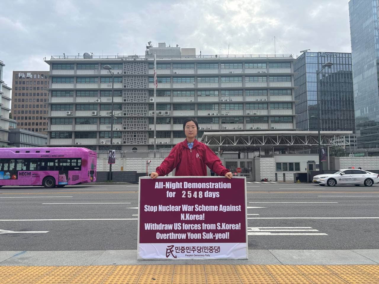 17일 민중민주당(민중당)은 미대사관앞에서 <친미호전윤석열타도! 북침핵전쟁책동중단! 핵전쟁화근 미군철거!> 구호를 들고 평화시위를 2981일째 전개했다.