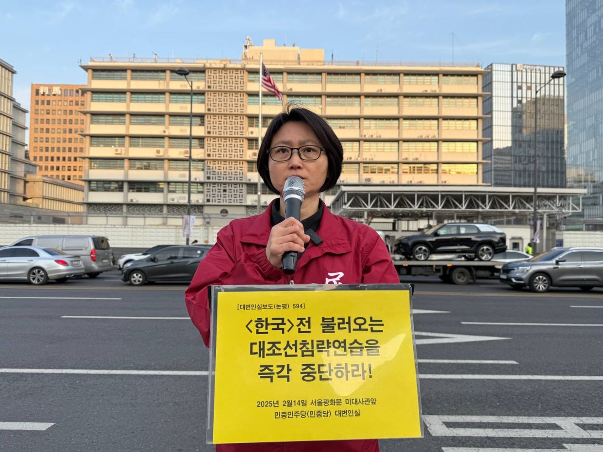 14일 민중민주당(민중당)은 미대사관앞에서 논평 <<한국>전 불러오는 대조선침략연습을 즉각 중단하라!>를 발표했다.