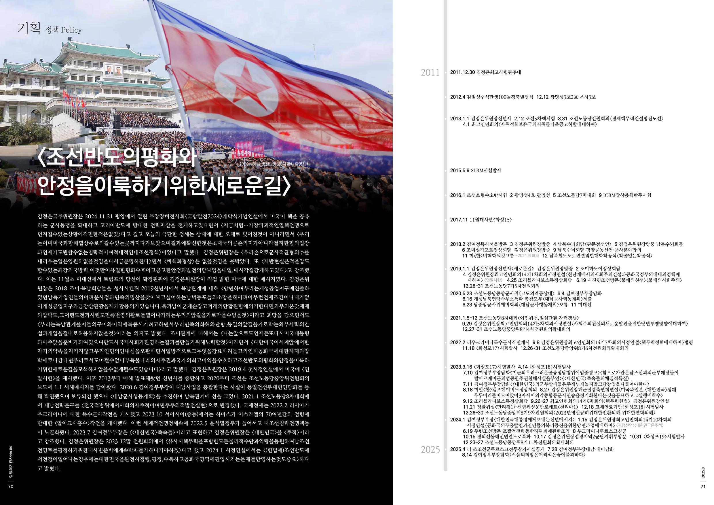 김정은국무위원장은 2024.11.21 평양에서 열린 무장장비전시회<국방발전2024>개막식기념연설에서 미국이 핵을 공유하는 군사동맹을 확대하고 코리아반도에 방대한 전략자산을 전개하고있다면서 <지금처럼…가장파괴적인열핵전쟁으로번져질수있는상황에직면한적은없었>다고 짚고 오늘의 극단한 정세는 상대에 대한 오해로 빚어진것이 아니라면서 <우리는이미미국과함께협상주로의갈수있는곳까지다가보았으며결과에확신한것은초대국의공존의지가아니라철저한힘의입장과언제가도변할수없는침략적이며적대적인대조선정책>이었다고 말했다. 김정은위원장은 <우리손으로군사적균형의추를내리우는일은영원히없을것임을다시금분명히한다>면서 <비핵화협상>은 없을것임을 못박았다. 또 <제반현실은적을압도할수있는최강의국방력,이것만이유일한평화수호이고공고한안정과발전의담보임을매일,매시각절감케하고있다>고 강조했다. 이는 11월초 미대선에서 트럼프의 당선이 확정된뒤에 김정은위원장이 직접 밝힌 미국에 대한 메시지였다. 김정은위원장은 2018 조미·북남회담들을 성사시킨뒤 2019신년사에서 북남관계에 대해 <당면하여우리는개성공업지구에진출하였던남측기업인들의어려운사정과민족의명산을찾아보고싶어하는남녘동포들의소망을헤아려아무런전제조건이나대가없이개성공업지구와금강산관광을재개할용의가있습니다.북과남이굳게손잡고겨레의단합된힘에의거한다면외부의온갖제재와압박도,그어떤도전과시련도민족번영의활로를열어나가려는우리의앞길을가로막을수없을것>이라고 희망을 담으면서도 <우리는북남관계를저들의구미와이익에복종시키려고하면서우리민족의화해와단합,통일의앞길을가로막는외부세력의간섭과개입을절대로허용하지않을것>이라는 의지도 밝혔다. 조미관계에 대해서는 <나는앞으로도언제든또다시미국대통령과마주앉을준비가되여있으며반드시국제사회가환영하는결과를만들기위해노력할것>이라면서 <다만미국이세계앞에서한자기의약속을지키지않고우리인민의인내심을오판하면서일방적으로그무엇을강요하려들고의연히공화국에대한제재와압박에로나간다면우리로서도어쩔수없이부득불나라의자주권과국가의최고이익을수호하고조선반도의평화와안정을이룩하기위한새로운길을모색하지않을수없게될수도있습니다>라고 말했다. 김정은위원장은 2019.4 첫시정연설에서 미국에 <연말시한>을 제시했다. 이후 2013부터 매해 발표해왔던 신년사를 중단하고 2020부터 조선은 조선노동당중앙위전원회의보도에 1.1 새해메시지를 담아왔다. 2020.6 김여정부부장이 대남사업을 총괄한다는 사실이 통일전선부대변인담화를 통해 확인됐으며 보류되긴 했으나 <대남군사행동계획>을 추진하며 남북관계에 선을 그었다. 2021.1 조선노동당8차대회에서 대남전략문구를 <전국적범위에서사회의자주적이며민주주의적발전실현>으로 변경했다. 국제정세는 2022.2 러시아가 우크라이나에 대한 특수군사작전을 개시했고 2023.10 서아시아(중동)에서는 하마스가 이스라엘의 70여년간의 점령에 반대한 <알아크사홍수>작전을 개시했다. 이런 세계적전쟁정세속에 2022.5 윤석열정부가 들어서고 대조선침략전쟁책동이 노골화됐다. 2023.7 김여정부부장은 <<대한민국>족속들>이라고 표현하고 김정은위원장은 <대한민국>을 <주적>이라고 강조했다. 김정은위원장은 2023.12말 전원회의에서 <유사시핵무력을포함한모든물리적수단과역량을동원하여남조선전영토를평정하기위한대사변준비에계속박차를가해나가야하겠>다고 했고 2024.1 시정연설에서는 <(헌법에)조선반도에서전쟁이일어나는경우에는대한민국을완전히점령,평정,수복하고공화국영역에편입시키는문제를반영하는것도중요>하다고 밝혔다.