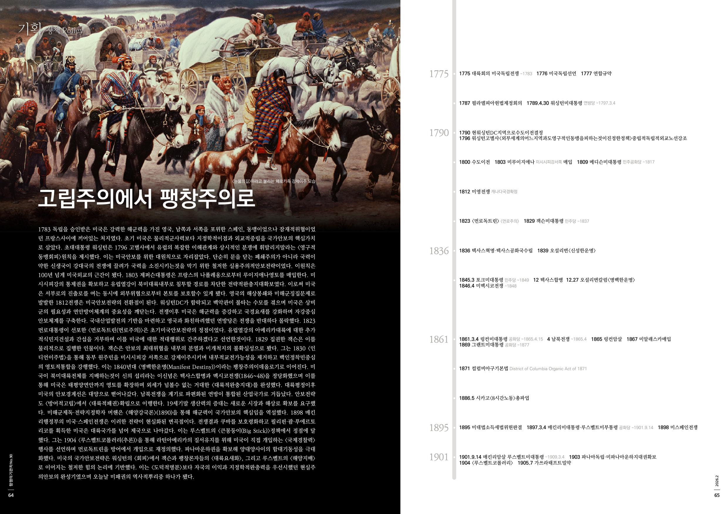 1783 독립을 승인받은 미국은 강력한 해군력을 가진 영국, 남쪽과 서쪽을 포위한 스페인, 동맹이었으나 잠재적위협이었던 프랑스사이에 끼어있는 처지였다. 초기 미국은 물리적군사력보다 지정학적이점과 외교적중립을 국가안보의 핵심가치로 삼았다. 초대대통령 워싱턴은 1796 고별사에서 유럽의 복잡한 이해관계와 상시적인 분쟁에 휘말리지말라는 <영구적동맹회피>원칙을 제시했다. 이는 미국안보를 위한 대원칙으로 자리잡았다. 단순히 문을 닫는 폐쇄주의가 아니라 국력이 약한 신생국이 강대국의 전쟁에 끌려가 국력을 소진시키는것을 막기 위한 철저한 실용주의적안보전략이었다. 이원칙은 100년 넘게 미국외교의 근간이 됐다. 1803 제퍼슨대통령은 프랑스의 나폴레옹으로부터 루이지애나영토를 매입한다. 미시시피강의 통제권을 확보하고 유럽열강이 북미대륙내부로 침투할 경로를 차단한 전략적완충지대확보였다. 이로써 미국은 서부로의 진출로를 여는 동시에 외부위협으로부터 본토를 보호할수 있게 됐다. 영국의 해상봉쇄와 미해군징집문제로 발발한 1812전쟁은 미국안보전략의 전환점이 된다. 워싱턴DC가 함락되고 백악관이 불타는 수모를 겪으며 미국은 상비군의 필요성과 연안방어체계의 중요성을 깨닫는다. 전쟁이후 미국은 해군력을 증강하고 국경요새를 강화하며 자강중심안보체계를 구축한다. 국내산업발전의 기반을 마련하고 영국과 화친하려했던 연방당은 전쟁을 반대하다 몰락했다. 1823 먼로대통령이 선포한 <먼로독트린(먼로주의)>은 초기미국안보전략의 정점이었다. 유럽열강의 아메리카대륙에 대한 추가적식민지건설과 간섭을 거부하며 이를 미국에 대한 적대행위로 간주하겠다고 선언한것이다. 1829 집권한 잭슨은 이를 물리적으로 집행한 인물이다. 잭슨은 안보의 최대위협을 내부의 분열과 미개척지의 불확실성으로 봤다. 그는 1830 <인디언이주법>을 통해 동부 원주민을 미시시피강 서쪽으로 강제이주시키며 내부적교전가능성을 제거하고 백인정착민중심의 영토적통합을 강행했다. 이는 1840년대 <명백한운명(Manifest Destiny)>이라는 팽창주의이데올로기로 이어진다. 미국이 북미대륙전체를 지배하는것이 신의 섭리라는 이신념은 텍사스합병과 멕시코전쟁(1846~48)을 정당화했으며 이를 통해 미국은 태평양연안까지 영토를 확장하며 외세가 넘볼수 없는 거대한 <대륙적완충지대>를 완성했다. 대륙평정이후 미국의 안보경계선은 대양으로 뻗어나갔다. 남북전쟁을 계기로 파편화된 연방이 통합된 산업국가로 거듭났다. 안보전략도 <방어적고립>에서 <대륙적패권>확립으로 이행한다. 19세기말 생산력의 증대는 새로운 시장과 해상로 확보를 요구했다. 미해군제독·전략지정학자 머핸은 <해양강국론>(1890)을 통해 해군력이 국가안보의 핵심임을 역설했다. 1898 매킨리행정부의 미국·스페인전쟁은 이러한 전략이 현실화된 변곡점이다. 전쟁결과 쿠바를 보호령화하고 필리핀·괌·푸에르토리코를 획득한 미국은 대륙국가를 넘어 제국으로 나아갔다. 이는 루스벨트의 <큰몽둥이(Big Stick)>정책에서 정점에 달했다. 그는 1904 <루스벨트코롤러리(추론)>을 통해 라틴아메리카의 질서유지를 위해 미국이 직접 개입하는 <국제경찰력>행사를 선언하며 먼로독트린을 방어에서 개입으로 재정의했다. 파나마운하권을 확보해 양대양사이의 함대기동성을 극대화했다. 미국의 국가안보전략은 워싱턴의 <회피>에서 잭슨과 팽창론자들의 <대륙요새화>, 그리고 루스벨트의 <해양지배>로 이어지는 철저한 힘의 논리에 기반했다. 이는 <도덕적명분>보다 자국의 이익과 지정학적완충력을 우선시했던 현실주의안보의 완성기였으며 오늘날 미패권의 역사적뿌리중 하나가 됐다.