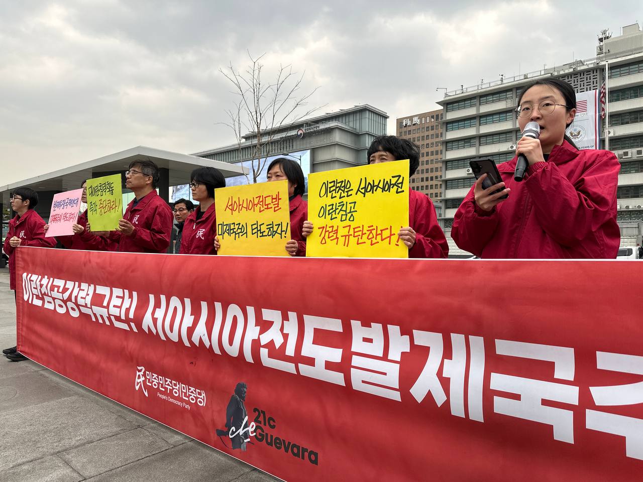 5일 민중민주당(민중당)은 미대사관앞에서 <이란침공강력규탄! 서아시아전도발제국주의타도!> 14차정당연설회를 진행했다.