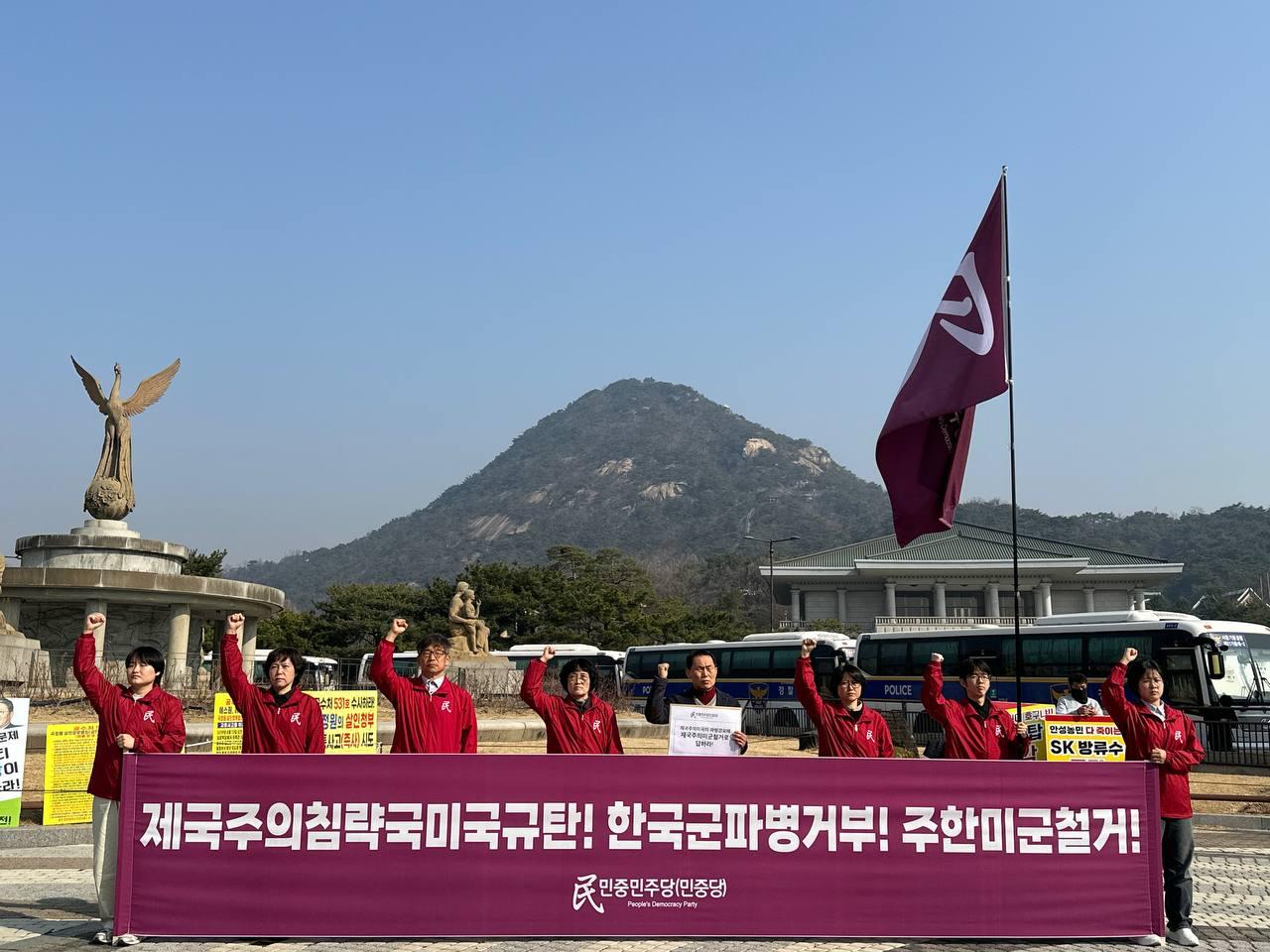 17일 민중민주당(민중당)은 청와대앞에서 <제국주의침략국미국규탄 <한국>군파병거부 주<한>미군철거!> 기자회견을 진행했다.
