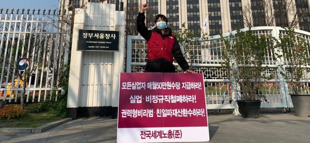 민생・사회 전총 〈모든실업자에게 매월50만원수당지급!〉 … 정부서울청사앞 일인시위11일째 2020-04-16 Facebook 전국세계노총준비위원회는 16일 서울정부종합청사앞에서 <모든실업자매월50만원수당지급!><실업·비정규직철폐!><권력형비리범·친일파재산환수!> 일인시위를 11일째 진행했다.