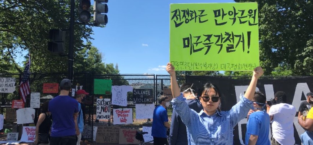 민중민주당(환수복지당) 미국평화원정단은 7일(현지시간) 워싱턴D.C백악관앞에서 <전쟁화근 만악근원 미군즉각철거!>, <미군유지비증액 트럼프정부규탄!>, <북침전쟁연습 트럼프정부규탄!>, <미제국주의 아래에서 우리는 숨쉴수없다>, <미제국주의는 전세계 민중의 생명위협을 그만두라> 등을 촉구하는 평화시위를 총1127일째 진행했다.