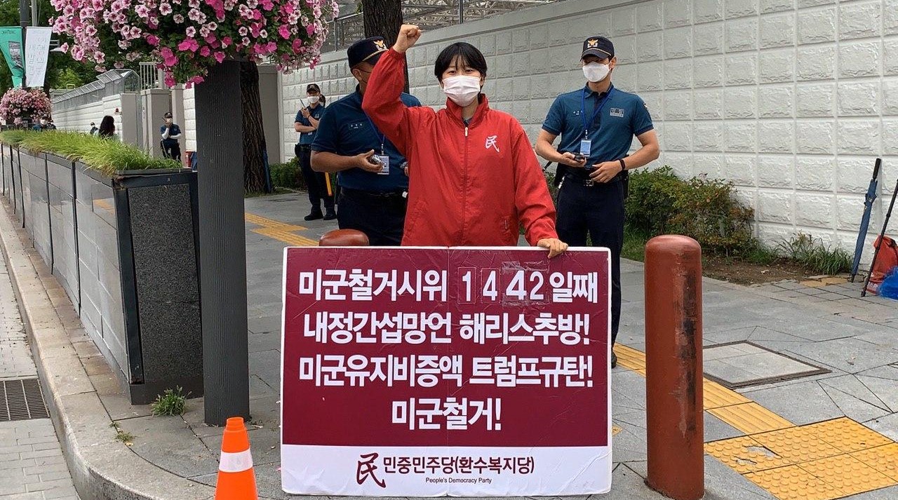 민중민주당(환수복지당)은 30일 미대사관앞에서 <내정간섭망언 해리스추방! 미군유지비증액! 트럼프규탄! 미군철거!>촉구 평화시위를 1442일째 진행했다.