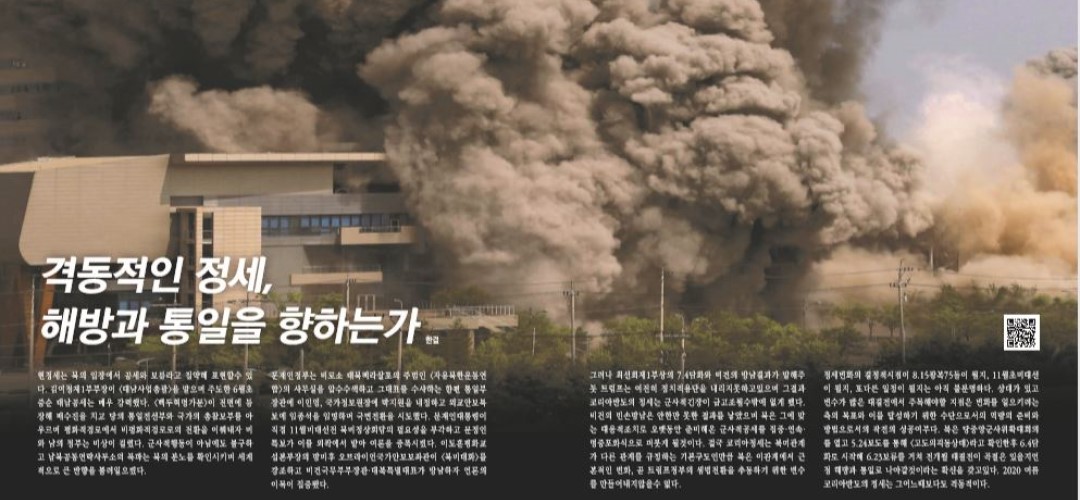 현정세는 북의 입장에서 공세와 보류라고 집약해 표현할수 있다. 김여정제1부부장이 <대남사업총괄>을 맡으며 주도한 6월초중순 대남공세는 매우 강력했다. <백두혁명가문>이 전면에 등장해 배수진을 치고 당의 통일전선부와 국가의 총참모부를 아 우르며 평화적경로에서 비평화적경로로의 전환을 이뤄내자 미와 남의 정부는 비상이 걸렸다. 군사적행동이 아님에도 불구하고 남북공동연락사무소의 폭파는 북의 분노를 확인시키며 세계적으로 큰 반향을 불러일으켰다.
