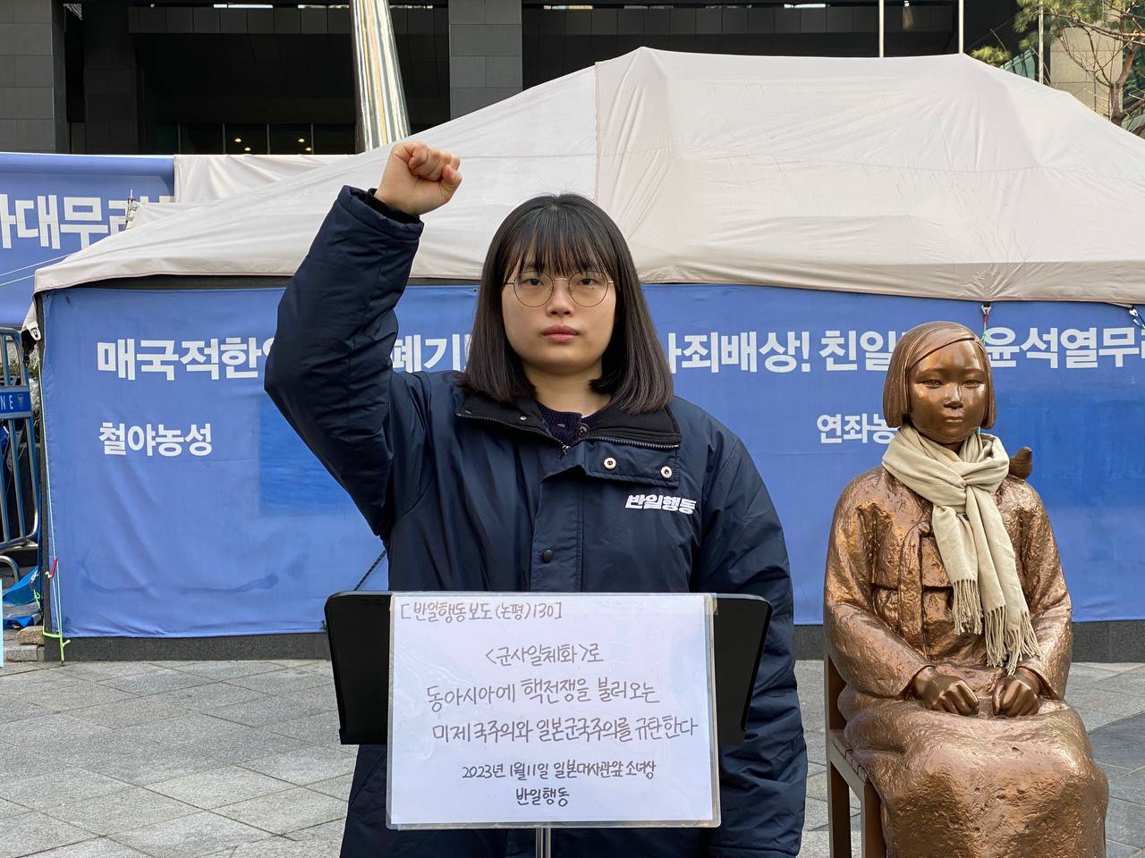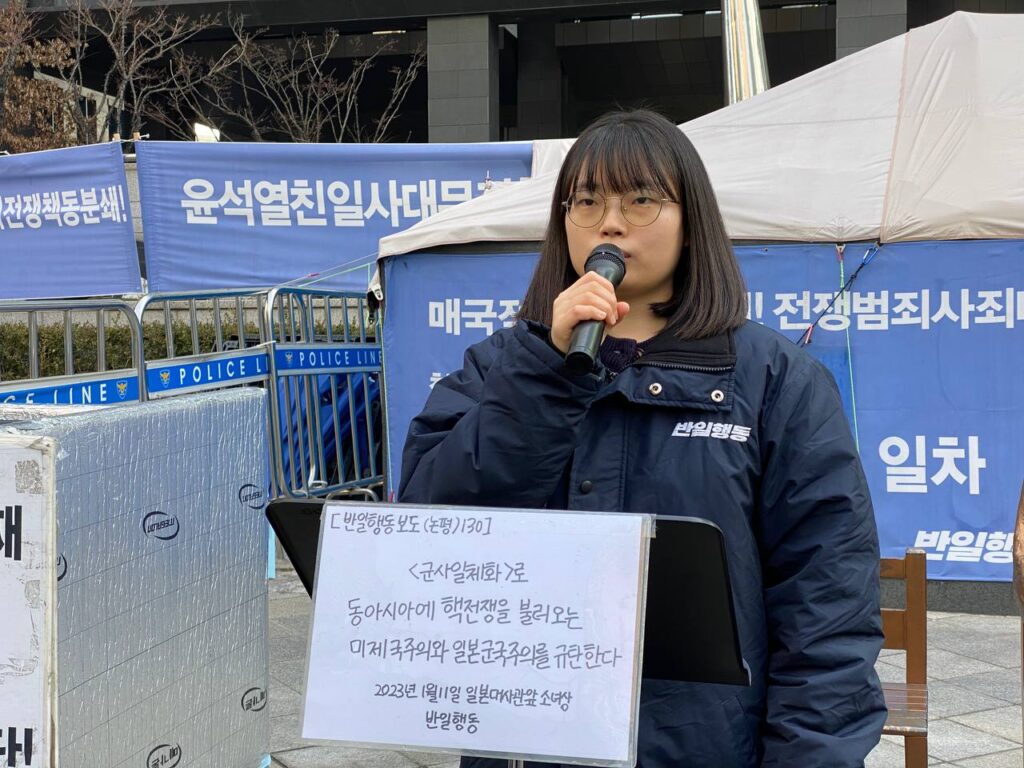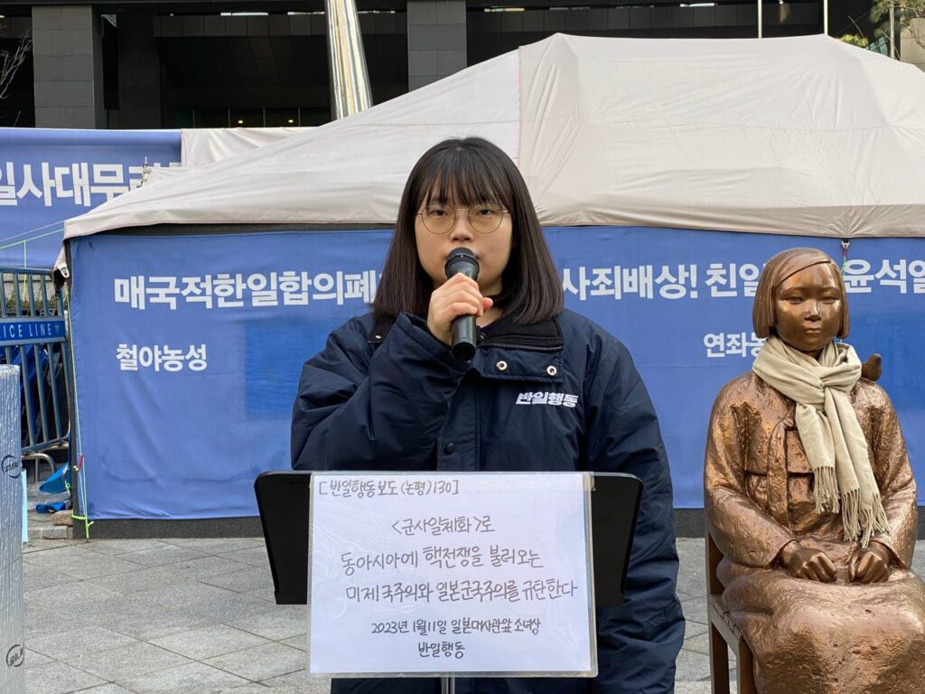 11일 반일행동은 일대사관앞에서 논평 <<군사일체화>로 동아시아에 핵전쟁을 불러오는 미제국주의와 일본군국주의를 규탄한다>를 발표했다.