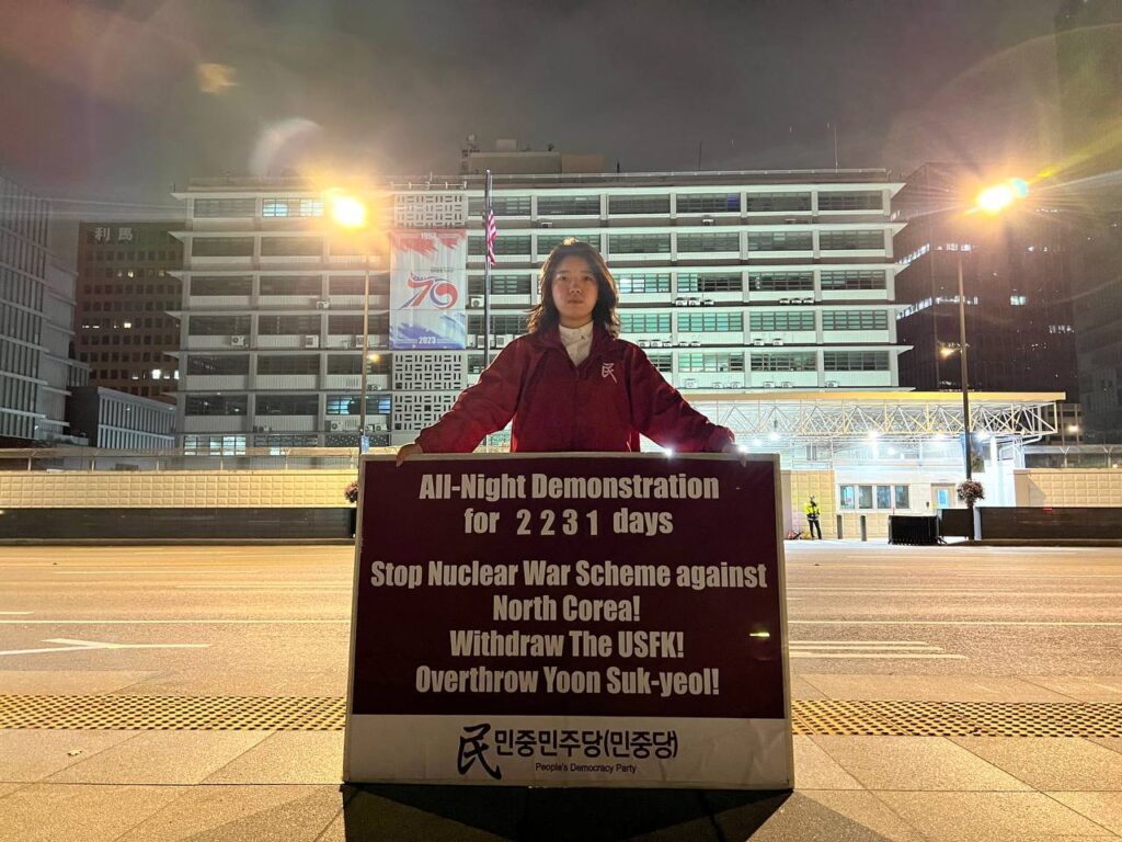 5일 민중민주당(민중당)은 미대사관앞에서 <친미호전윤석열타도! 북침핵전쟁책동중단! 핵전쟁화근 미군철거!> 구호를 들고 평화시위를 2665일째 전개했다.