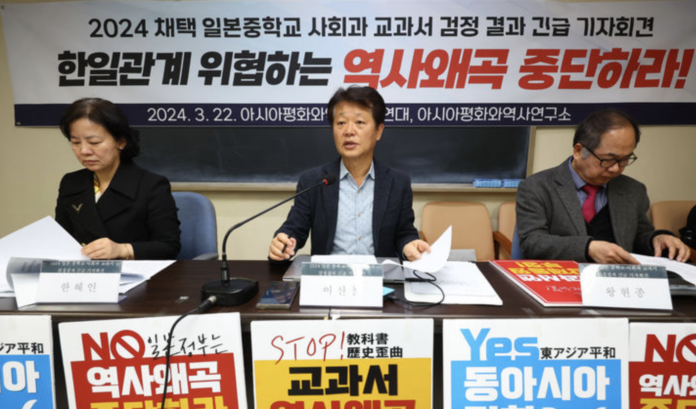 아시아평화와역사교육연대와 아시아평화와역사연구소는 22일 종로구 경주이씨화수회관에서 기자회견을 열었다. 문부과학성 검정을 통과한 사회과교과서를 검토한 결과 문제가 된 교과서들은 자유사(自由社)와 육붕사(育鵬社)에서 발행한 것으로, 극우적 성향을 가진 저자들이 참여했다.