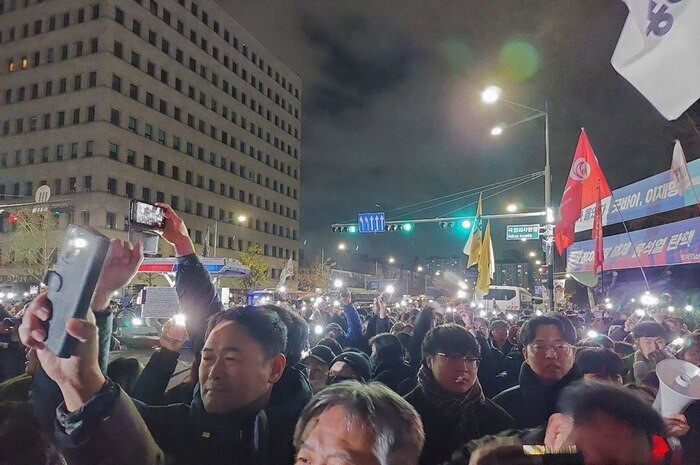Home정치비상계엄 새벽 국회점거시위 ... 국회 비상대기 정치 비상계엄 새벽 국회점거시위 … 국회 비상대기 2024-12-04 4일 01시 국회가 비상계엄해제안을 통과시킨 가운데 비상계엄선포이후 모여든 시민들은 윤석열대통령의 비상계엄해제선언을 촉구하며 국회앞을 지키고 있다. 02시 기준 윤석열대통령은 국회의 계엄해제의결을 받아들이지 않고 있다. 이에 국회 본회의장에 있는 국회의원들은 윤대통령이 계엄해제를 거부할 경우를 대비해 비상대기 중이다. 시민들은 <윤석열탄핵>, <윤석열체포>를 외치며 국회를 향해 곧바로 탄핵소추안통과에 나설 것을 강하게 요구하고 있다. Previous article[민중민주당성명] 윤석열내란범을 즉각 타도하자!Next article윤석열의 비상계엄선포는 〈한국〉변혁을 앞당기는 파쇼적발악 관련기사 조현 〈호르무즈파병요청〉 질의 회피 2026-03-19 부승찬, 민간단체의 계룡대 활주로 사용 지적 2026-03-19 이재명 〈전쟁추경 신속히 편성 … 차5부제 등 에너지대책수립해야〉 2026-03-19 최신기사 이란 미·이스라엘에 대해 미사용무기배치 예정 국제 2026-03-19 이란외무장관, 휴전이 아닌 종전을 원한다 국제 2026-03-19 이란, 이스라엘4개도시와 서아시아미군기지 공습 최신기사 2026-03-19 이란, 이스라엘에 의한 고위직 사망 확인 국제 2026-03-19 사설 제국주의미국의 총알받이가 되기를 거부해야한다 2026-03-16 대미투자는 제국주의난파선에 올라타는 것 2026-03-14 위험한 시기에 벌이는 무모한 침략전쟁연습 2026-03-09 3차세계대전의 본격화를 불러오는 대이란전면전도발 2026-03-01 글 〈왝더독〉 영화와 현실 2026-03-18 발악하는 트럼프, 지상군 투입하나 2026-03-16 불 좋아하다가 그불에 타죽는다 2026-03-12 비호전에서 호전을 넘어 호전광으로 2026-03-10 검색 - Advertisement -