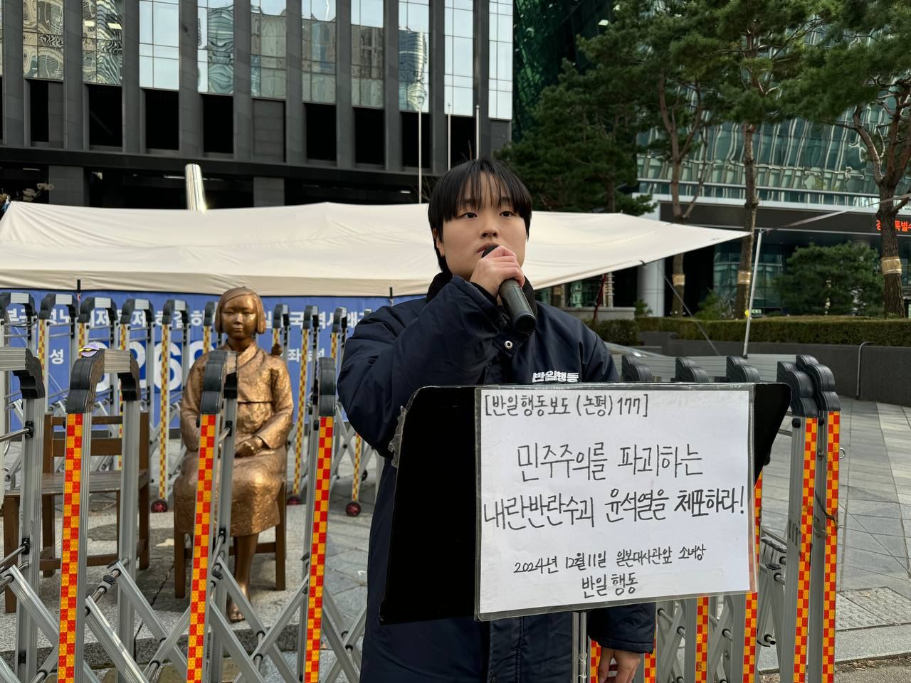 3. 윤석열무리는 국지전을 통한 계엄선포 즉, <전쟁계엄>에 골몰하고 있다. 김용현은 10월 평양상공에 무인기테러를 지시했고 12.3계엄선포 5일전 북에서 날아오는 오물풍선의 원점을 타격하라고 지시했다. 특히 원점타격과 관련해 합참의장이 <국지전가능성>을 언급하며 불복하자 김용현은 폭언을 퍼부으며 <쟤 빼>라고 했다. 이는 합참의장이 아닌 육군대장이 계엄사령관을 한 배경으로 추정된다. 일본군국주의가 부활하고 제국주의세력이 3차세계대전을 끊임없이 도발하는 현정세에서, 한반도에서의 국지전은 <한국>전으로, <한국>전은 동아시아전으로 즉시 확대될 수 있다는 사실은 윤석열·군부호전무리들이 얼마나 위험천만한 야수무리들인지를 보여준다. 가결될때까지 탄핵을 추진하면서 윤석열의 권한을 중지시키고 윤석열과 내란·반란범죄자들을 즉각 체포해야만 현재의 위기에서 조금은 벗어날 수 있다. 민주주의실현을 위해 피 흘려 싸운 선배청년학생의 뜻을 계승한 우리청년학생은 반윤석열항쟁의 앞장에 서서 내란반란수괴 윤석열을 반드시 끝장내고 민주주의를 사수하며 나아가 민중이 주인이 되는 참된 민주주의를 앞당길 것이다.