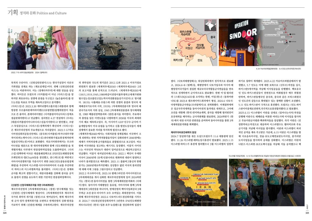2024.7 암살위기를 겪은 도널드트럼프가 11.6 대통령에 당선됐다. 11.26 이스라엘·레바논임시휴전이 발효됐다. 2025.1.15 이스라엘·하마스가 휴전에 합의했으나 3월 이스라엘의 일방적파기로 침략이 재개됐다. 2025.4.22 카슈미르파할감테러가 발생했고, 5.7 인도는 이에 대한 보복으로 <신두르>작전을 실시, 파키스탄9개지역을 겨냥해 미사일공습을 단행했다. 핵보유국인 인도·파키스탄갈등이 전면전으로 비화될경우 매우 위험천만하며, 파키스탄동맹국인 중국과, 중국과 같은 브릭스회원국인 인도간의 갈등으로 확대될수 있는 첨예한 상황이 조성됐다. 5.11 인도·파키스탄이 극적으로 휴전했다. 트럼프는 <인도·파키스탄이미중재로전면적,즉각적으로휴전합의했다>고 발표했다.