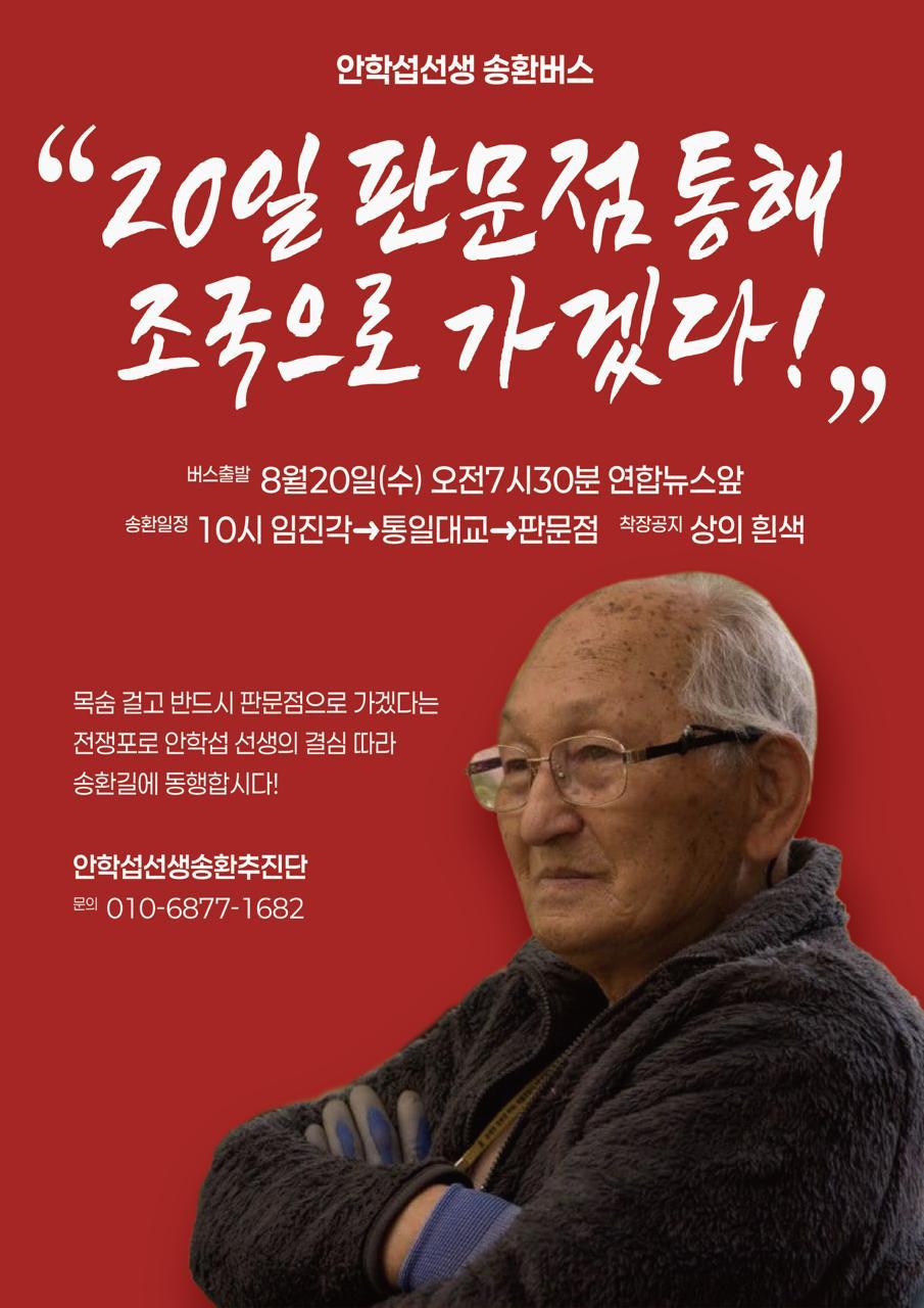 안학섭선생송환추진단(송환추진단)이 오는 20일 판문점을 통한 송환을 추진하며 <송환버스> 참가자를 모집한다.