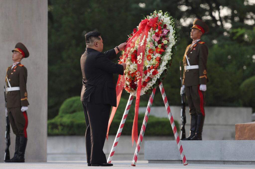 김정은동지께서는 조선의 해방을 위한 성전에 참전하여 용감히 싸운 쏘련군렬사들에게 숭고한 경의를 표하시였다.