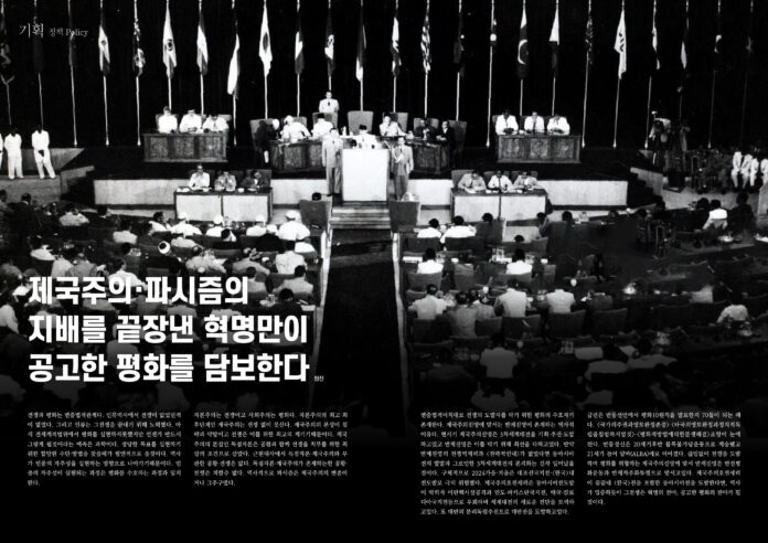 금년은 반둥선언에서 평화10원칙을 발표한지 70돌이 되는 해다. <국가의주권과영토완정존중>·<타국의영토완정과정치적독립을침범하지말것>·<평화적방법에의한분쟁해결>조항이 눈에 띈다. 반둥정신은 20세기후반 블록불가담운동으로 계승됐고 21세기 들어 알바(ALBA)에로 이어졌다. 끊임없이 전쟁을 도발하며 평화를 위협하는 제국주의진영에 맞서 반제진영은 반전평화운동과 반제자주화투쟁으로 맞서고있다. 제국주의호전세력이 끝끝내 <한국>전을 포함한 동아시아전을 도발한다면, 역사가 입증하듯이 그전쟁은 혁명의 전야, 공고한 평화의 전야가 될것이다.