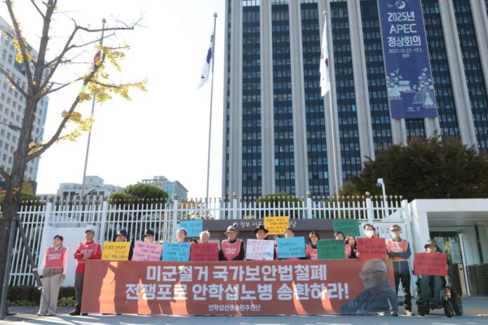 1일 안학섭선생송환추진단은 서울정부청사앞에서 <미군철거 국가보안법철폐 전쟁포로 안학섭노병 송환> 15차집회를 전개했다.