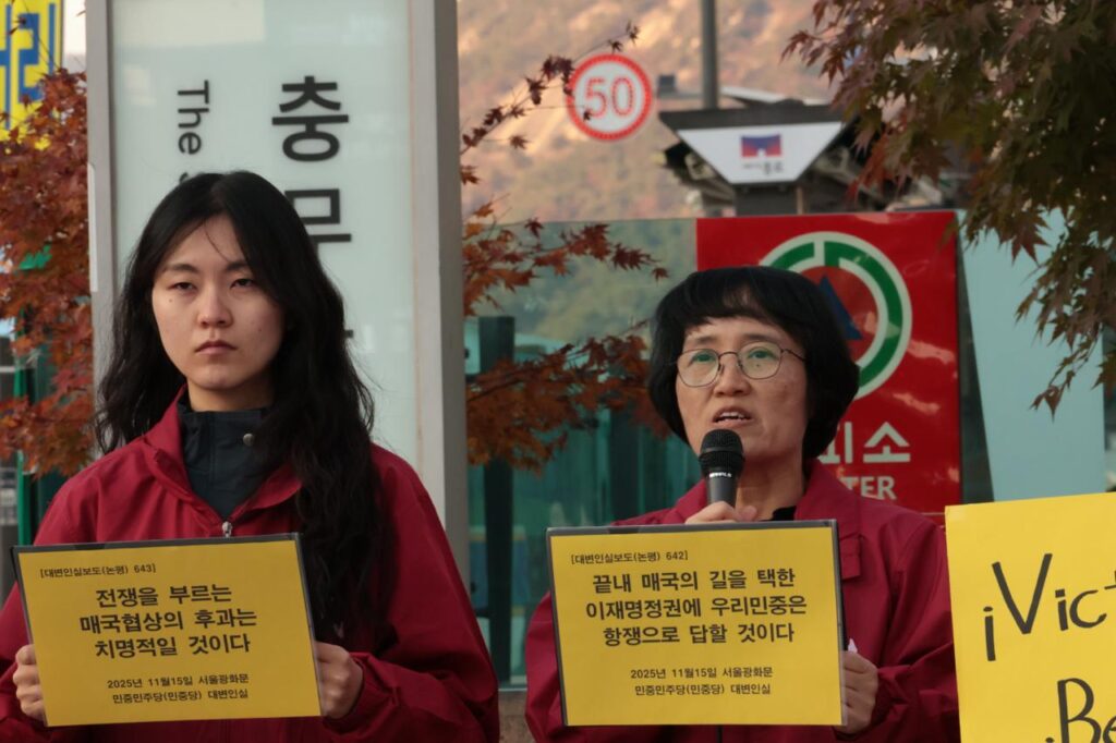 15일 민중민주당(민중당)은 미대사관앞에서 논평 <미대사관앞에서 논평 끝내 매국의 길을 택한 이재명정권에 우리민중은 항쟁으로 답할 것이다>를 발표했다.
