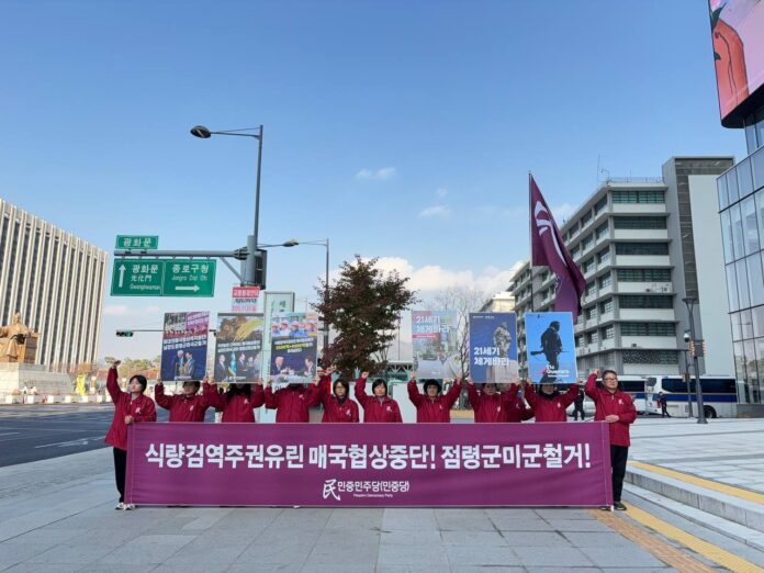 더해 <이재명과 <동맹파>는 가장 짧은 시간에 가장 큰 규모의 상납을 결정하고도 <국익>이니 <자주>니 망발하며 자화자찬을 일삼고 있다. 아무리 국민들을 속이며 매국협상을 성과로 포장해도 국민들은 피부로 경제위기와 민생파탄의 참담한 현실을 직면하며 절대로 서명하지 말아야 한다고 강력하게 요구하고 있다>면서 <이재명정부가 사인하면 민중의 선택은 항쟁뿐이라는 것을 경고한다. 우리민중이 원하는 것은 파쇼정권도 매국정권도 아니다. 이 땅에 노동자, 농민, 민중이 주인되는 민중정권을 건설하는 것이다. 민중민주당은 민중의 힘을 믿고 민중과 함께 반드시 민중이 주인인 민중민주의 새사회를 만들어낼 것이다.>라고 힘줘 말했다.