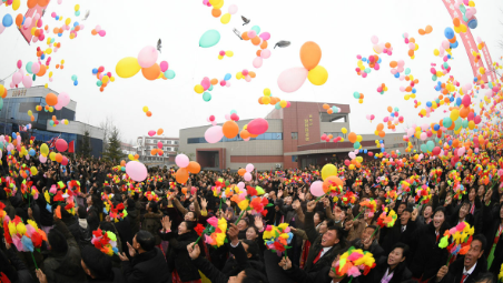 각양각색의 고무풍선들이 날아오르는 속에 총리동지가 새 공장의 주인들과 함께 준공테프를 끊었다.