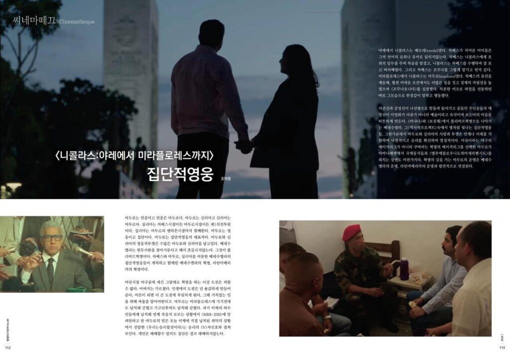 영화는 넌픽션과 픽션이 따로 가다가 픽션이 넌픽션에 들어가더니 마지막에는 아예 하나가 돼버린다. 다큐영화가 예술영화고 예술영화가 다큐영화다. 사실주의의 전형화기법에 충실하면서 동시에 다큐와 예술의 경계를 허물어버린다. 제작진이 구현한 변증법은 역사와 현실, 사회와 가족, 집단과 개인, 투쟁과 사랑을 하나로 엮어 예술만이 이 어려운 일을 가능하게 만드는 고도의 숭고한 노동이라고 웅변한다. <니콜라스>에서도 영화의 요소들이 각각의 특성을 유지하면서도 동시에 유기적조합을 이루며 오늘 집단적영웅을 대표하는 마두로의 어제와 오늘, 그리고 내일을 생생히 그려내보인다.