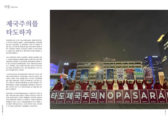 100년전에 외친 이구호가 오늘 광장에 울린다. 일제치하 만주에서 든 이기치가 미제치하 서울에서, 그한복판 광화문광장, 미대사관앞에서 높이 추켜올려졌다. 당, 반미반제의 기치를 들고 투쟁하는 유일한 정당, 코리아전이래 있어본적이 없는 워커스파티가 힘차게 외친다. 우리민족은 살아있다, 우리민중은 승리한다, 우리당이 앞장선다, 100돌이 되는 올해를 반드시 제국주의타도의 해로 만들겠다, 승리의 해로 빛내겠다고.