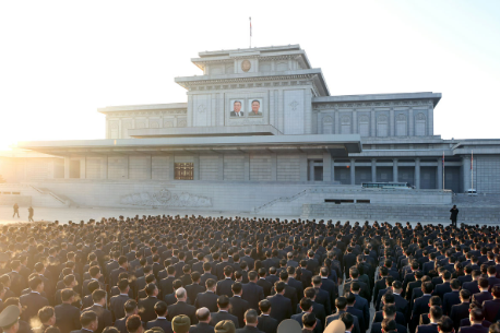 한없이 경건한 마음 안고 금수산태양궁전광장에 들어선 군중들은 한평생 혁명의 붉은기를 높이 드시고 시대와 혁명, 조국과 인민앞에 영구불멸할 업적을 쌓아올리신 위대한 수령 김일성동지와 위대한 령도자 김정일동지의 성스러운 혁명생애를 경건히 돌이켜보았다.