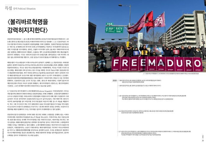 베네수엘라 마두로대통령이 미제국주의로부터 납치된지 1달째인 2.3 민중민주당은 미대사관앞에서 <반제투사민중지도자마두로석방!타도제국주의!>정당연설회를 2차례 진행했다. 한명희민중민주당대표는 미국은 당장 마두로대통령부부를 석방해야한다, 미국을 비롯한 각국의 정당·단체들, 베네수엘라·쿠바·온두라스·영국·미국을 비롯한 각국의 주요도시에서 침공규탄시위가 광범위하게 벌어졌다, 특히 미국내 전역의 도시들에서도 80건이상의 시위가 전개되며 미국의 베네수엘라침공과 주권국가에 대한 테러행위에 규탄의 목소리가 터져나왔다고 강조했다. 민중민주당반미반전특별위원회위원장은 베네수엘라가 미제국주의의 <마당>이 되길 거부하며 반제자주, 민중민주의 길을 굳건히 가고있는 현재, <한국>과 베네수엘라는 다를바 없으며 반제반미전선에서 똑같은 하나의 운명에 처해있다, 제국주의폭압에 고통받는곳, 제국주의침략이 극심한곳, 그곳이 반제반미전선에서 최전선이라고 목소리를 높였다.