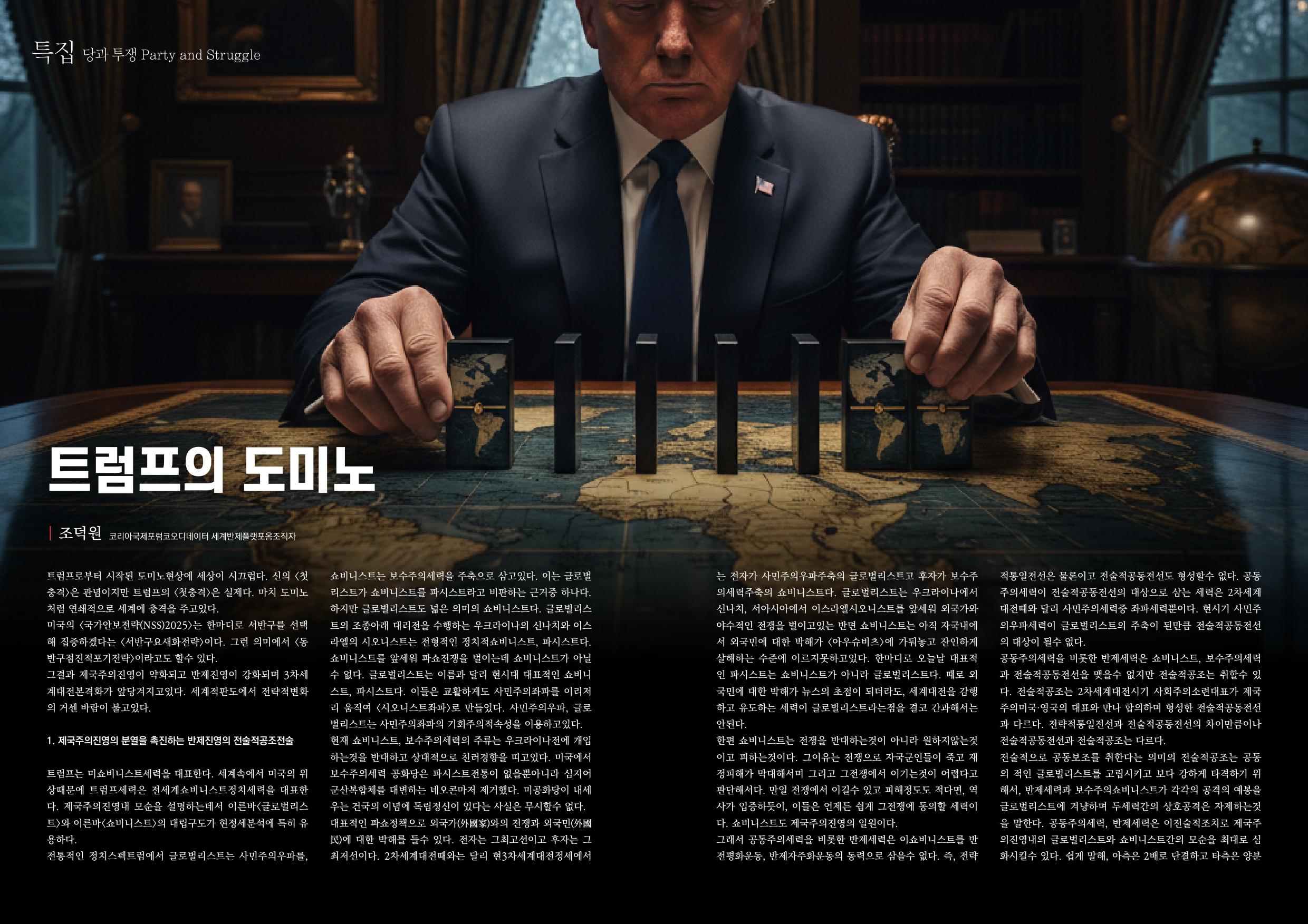 반면 트럼프는 8월 푸틴과 알래스카에서 회담하고 10월 시진핑과 <한국>에서 회담하면서 매우 우호적인 분위기로 일관했다. 제국주의진영내의 동맹국들과는 한껏 다투고 반제진영의 적수국들과는 오히려 친하게 지내려하는 이 2중적이고 모순적인 모습은 제국주의진영내의 트럼프세력, 미쇼비니스트의 정치적입장과 실용적판단을 잘 보여준다. 트럼프정부의 이모습이 1기때에 이어 2기때에도 내내 일관됐다. 트럼프세력, 미쇼비니스트에게 그존재를 위협하는 제1의 적, 주적은 글로벌리스트다.