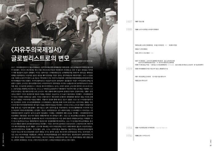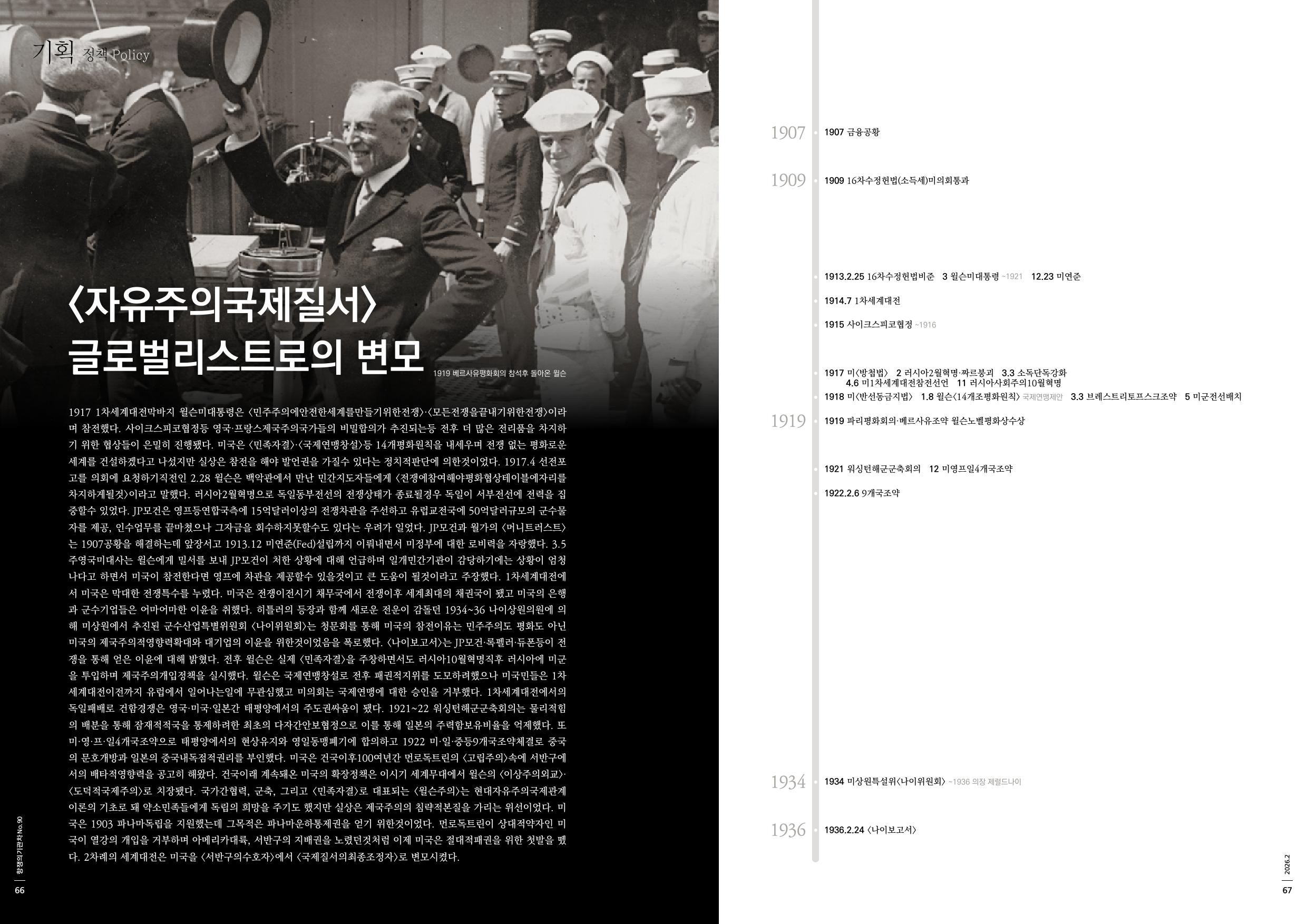 1917 1차세계대전막바지 윌슨미대통령은 <민주주의에안전한세계를만들기위한전쟁>·<모든전쟁을끝내기위한전쟁>이라며 참전했다. 사이크스피코협정등 영국·프랑스제국주의국가들의 비밀합의가 추진되는등 전후 더 많은 전리품을 차지하기 위한 협상들이 은밀히 진행됐다. 미국은 <민족자결>·<국제연맹창설>등 14개평화원칙을 내세우며 전쟁 없는 평화로운 세계를 건설하겠다고 나섰지만 실상은 참전을 해야 발언권을 가질수 있다는 정치적판단에 의한것이었다. 1917.4 선전포고를 의회에 요청하기직전인 2.28 윌슨은 백악관에서 만난 민간지도자들에게 <전쟁에참여해야평화협상테이블에자리를차지하게될것>이라고 말했다. 러시아2월혁명으로 독일동부전선의 전쟁상태가 종료될경우 독일이 서부전선에 전력을 집중할수 있었다. JP모건은 영프등연합국측에 15억달러이상의 전쟁차관을 주선하고 유럽교전국에 50억달러규모의 군수물자를 제공, 인수업무를 끝마쳤으나 그자금을 회수하지못할수도 있다는 우려가 일었다. JP모건과 월가의 <머니트러스트>는 1907공황을 해결하는데 앞장서고 1913.12 미연준(Fed)설립까지 이뤄내면서 미정부에 대한 로비력을 자랑했다. 3.5 주영국미대사는 윌슨에게 밀서를 보내 JP모건이 처한 상황에 대해 언급하며 일개민간기관이 감당하기에는 상황이 엄청나다고 하면서 미국이 참전한다면 영프에 차관을 제공할수 있을것이고 큰 도움이 될것이라고 주장했다. 1차세계대전에서 미국은 막대한 전쟁특수를 누렸다. 미국은 전쟁이전시기 채무국에서 전쟁이후 세계최대의 채권국이 됐고 미국의 은행과 군수기업들은 어마어마한 이윤을 취했다. 히틀러의 등장과 함께 새로운 전운이 감돌던 1934~36 나이상원의원에 의해 미상원에서 추진된 군수산업특별위원회 <나이위원회>는 청문회를 통해 미국의 참전이유는 민주주의도 평화도 아닌 미국의 제국주의적영향력확대와 대기업의 이윤을 위한것이었음을 폭로했다. <나이보고서>는 JP모건·록펠러·듀폰등이 전쟁을 통해 얻은 이윤에 대해 밝혔다. 전후 윌슨은 실제 <민족자결>을 주창하면서도 러시아10월혁명직후 러시아에 미군을 투입하며 제국주의개입정책을 실시했다. 윌슨은 국제연맹창설로 전후 패권적지위를 도모하려했으나 미국민들은 1차세계대전이전까지 유럽에서 일어나는일에 무관심했고 미의회는 국제연맹에 대한 승인을 거부했다. 1차세계대전에서의 독일패배로 건함경쟁은 영국·미국·일본간 태평양에서의 주도권싸움이 됐다. 1921~22 워싱턴해군군축회의는 물리적힘의 배분을 통해 잠재적적국을 통제하려한 최초의 다자간안보협정으로 이를 통해 일본의 주력함보유비율을 억제했다. 또 미·영·프·일4개국조약으로 태평양에서의 현상유지와 영일동맹폐기에 합의하고 1922 미·일·중등9개국조약체결로 중국의 문호개방과 일본의 중국내독점적권리를 부인했다. 미국은 건국이후100여년간 먼로독트린의 <고립주의>속에 서반구에서의 배타적영향력을 공고히 해왔다. 건국이래 계속돼온 미국의 확장정책은 이시기 세계무대에서 윌슨의 <이상주의외교>·<도덕적국제주의>로 치장됐다. 국가간협력, 군축, 그리고 <민족자결>로 대표되는 <윌슨주의>는 현대자유주의국제관계이론의 기초로 돼 약소민족들에게 독립의 희망을 주기도 했지만 실상은 제국주의의 침략적본질을 가리는 위선이었다. 미국은 1903 파나마독립을 지원했는데 그목적은 파나마운하통제권을 얻기 위한것이었다. 먼로독트린이 상대적약자인 미국이 열강의 개입을 거부하며 아메리카대륙, 서반구의 지배권을 노렸던것처럼 이제 미국은 절대적패권을 위한 첫발을 뗐다. 2차례의 세계대전은 미국을 <서반구의수호자>에서 <국제질서의최종조정자>로 변모시켰다.