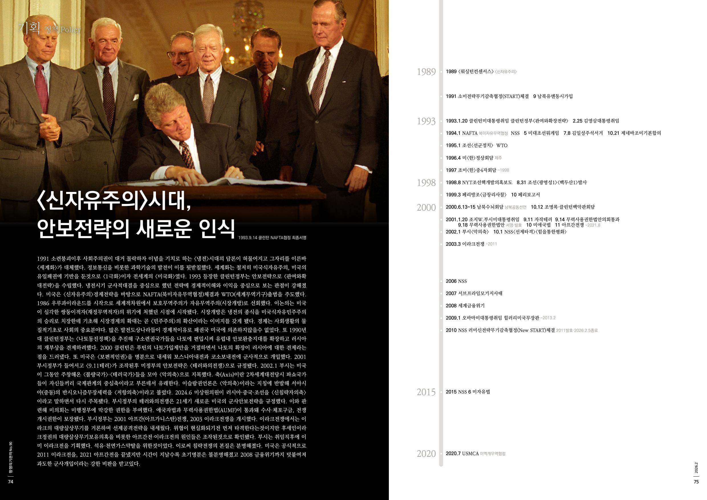 1991 소련붕괴이후 사회주의권이 대거 몰락하자 이념을 기치로 하는 <냉전>시대의 담론이 허물어지고 그자리를 이른바<세계화>가 대체했다. 정보통신을 비롯한 과학기술의 발전이 이를 뒷받침했다. 세계화는 철저히 미국식자유주의, 미국의 유일패권에 기반을 둔것으로 <1극화>이자 전세계의 <미국화>였다. 1993 등장한 클린턴정부는 안보전략으로 <관여와확대전략>을 수립했다. 냉전시기 군사적대결을 중심으로 했던 전략에 경제적이해와 이익을 중심으로 보는 관점이 강해졌다. 미국은 <신자유주의>경제전략을 바탕으로 NAFTA(북미자유무역협정)체결과 WTO(세계무역기구)출범을 주도했다. 1986 우루과이라운드를 시작으로 세계적차원에서 보호무역주의가 자유무역주의(시장개방)로 선회했다. 이논의는 미국이 심각한 쌍둥이적자(재정무역적자)의 위기에 처했던 시점에 시작됐다. 시장개방은 냉전의 종식을 미국식자유민주주의의 승리로 치장한데 기초해 시장경제의 확대는 곧 <민주주의>의 확산이라는 이미지를 갖게 됐다. 경제는 사회생활의 물질적기초로 사회의 중요분야다. 많은 발전도상나라들이 경제적이유로 패권국 미국에 의존하지않을수 없었다. 또 1990년대 클린턴정부는 <나토동진정책>을 추진해 구소련권국가들을 나토에 편입시켜 유럽내 안보완충지대를 확장하고 러시아의 재부상을 견제하려했다. 2000 클린턴은 푸틴의 나토가입제안을 거절하면서 나토의 확장이 러시아에 대한 견제라는점을 드러냈다. 또 미국은 <보편적인권>을 명분으로 내세워 보스니아내전과 코소보내전에 군사적으로 개입했다. 2001 부시정부가 들어서고 <9.11테러>가 조작된후 미정부의 안보전략은 <테러와의전쟁>으로 규정됐다. 2002.1 부시는 미국이 그동안 주창해온 <불량국가>·<테러국가>들을 모아 <악의축>으로 지목했다. 축(Axis)이란 2차세계대전당시 파쇼국가들이 자신들끼리 국제관계의 중심축이라고 부른데서 유래한다. 이슬람권언론은 <악의축>이라는 지칭에 반발해 서아시아(중동)의 반시오니즘무장세력을 <저항의축>이라고 불렀다. 2024.6 미상원의원이 러시아·중국·조선을 <신침략자의축>이라고 말하면서 다시 주목됐다. 부시정부의 테러와의전쟁은 21세기 새로운 미국의 군사안보전략을 규정했다. 이와 관련해 미의회는 미행정부에 막강한 권한을 부여했다. 애국자법과 무력사용권한법(AUMF)이 통과돼 수사·체포구금, 전쟁개시권한이 보장됐다. 부시정부는 2001 아프간(아프가니스탄)전쟁, 2003 이라크전쟁을 개시했다. 이라크전쟁에서는 이라크의 대량살상무기를 거론하며 선제공격전략을 내세웠다. 위협이 현실화되기전 먼저 타격한다는것이지만 후세인이라크정권의 대량살상무기보유의혹을 비롯한 아프간전·이라크전의 원인들은 조작된것으로 확인됐다. 부시는 취임직후에 이미 이라크전을 기획했다. 석유·천연가스약탈을 위한것이었다. 이로써 침략전쟁의 본질은 분명해졌다. 미국은 공식적으로 2011 이라크전을, 2021 아프간전을 끝냈지만 시간이 지날수록 초기명분은 불분명해졌고 2008 금융위기까지 덧붙여져 과도한 군사개입이라는 강한 비판을 받고있다.