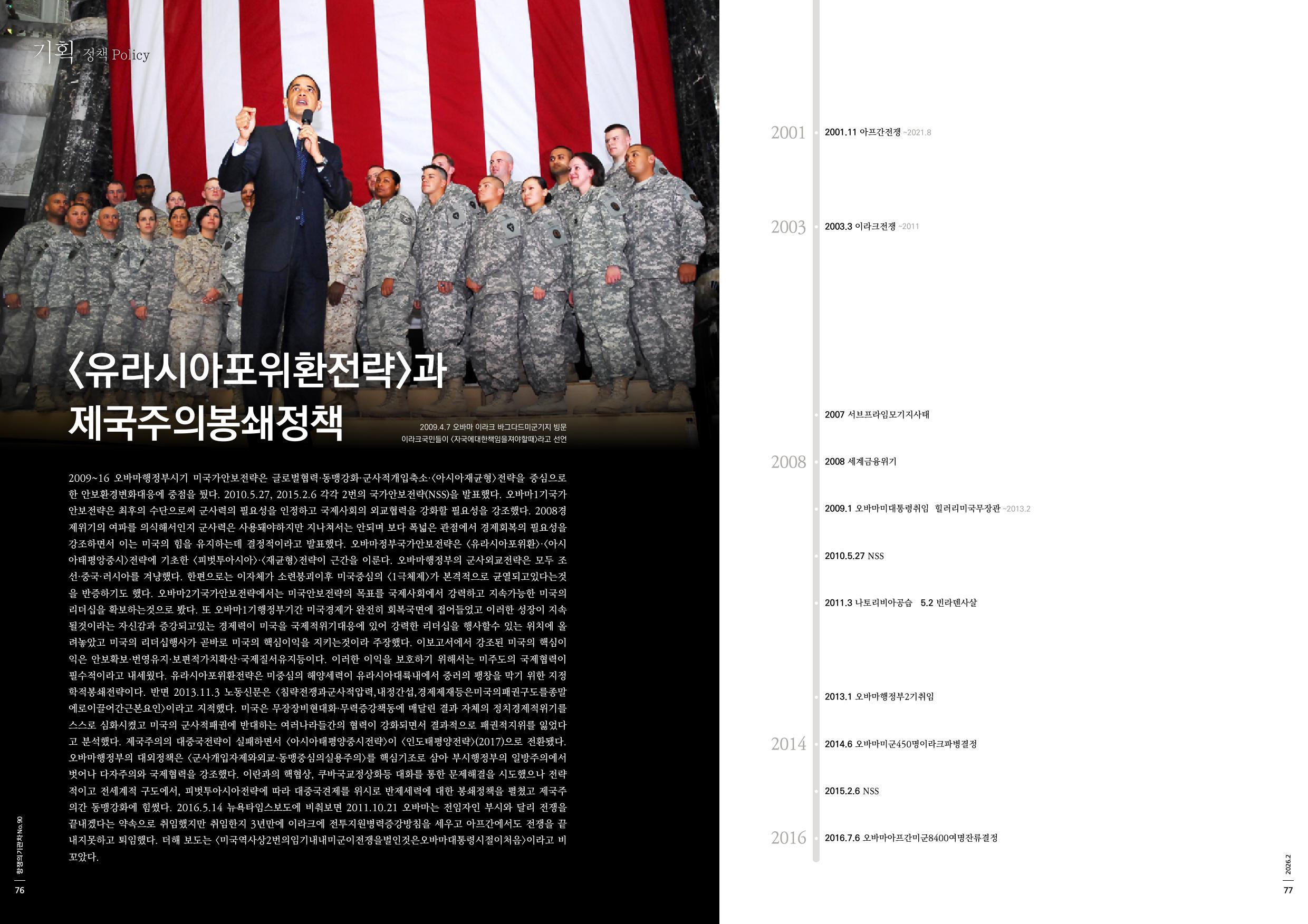 2009~16 오바마행정부시기 미국가안보전략은 글로벌협력·동맹강화·군사적개입축소·<아시아재균형>전략을 중심으로 한 안보환경변화대응에 중점을 뒀다. 2010.5.27, 2015.2.6 각각 2번의 국가안보전략(NSS)을 발표했다. 오바마1기국가안보전략은 최후의 수단으로써 군사력의 필요성을 인정하고 국제사회의 외교협력을 강화할 필요성을 강조했다. 2008경제위기의 여파를 의식해서인지 군사력은 사용돼야하지만 지나쳐서는 안되며 보다 폭넓은 관점에서 경제회복의 필요성을 강조하면서 이는 미국의 힘을 유지하는데 결정적이라고 발표했다. 오바마정부국가안보전략은 <유라시아포위환>·<아시아태평앙중시>전략에 기초한 <피벗투아시아>·<재균형>전략이 근간을 이룬다. 오바마행정부의 군사외교전략은 모두 조선·중국·러시아를 겨냥했다. 한편으로는 이자체가 소련붕괴이후 미국중심의 <1극체제>가 본격적으로 균열되고있다는것을 반증하기도 했다. 오바마2기국가안보전략에서는 미국안보전략의 목표를 국제사회에서 강력하고 지속가능한 미국의 리더십을 확보하는것으로 봤다. 또 오바마1기행정부기간 미국경제가 완전히 회복국면에 접어들었고 이러한 성장이 지속될것이라는 자신감과 증강되고있는 경제력이 미국을 국제적위기대응에 있어 강력한 리더십을 행사할수 있는 위치에 올려놓았고 미국의 리더십행사가 곧바로 미국의 핵심이익을 지키는것이라 주장했다. 이보고서에서 강조된 미국의 핵심이익은 안보확보·번영유지·보편적가치확산·국제질서유지등이다. 이러한 이익을 보호하기 위해서는 미주도의 국제협력이 필수적이라고 내세웠다. 유라시아포위환전략은 미중심의 해양세력이 유라시아대륙내에서 중러의 팽창을 막기 위한 지정학적봉쇄전략이다. 반면 2013.11.3 노동신문은 <침략전쟁과군사적압력,내정간섭,경제제재등은미국의패권구도를종말에로이끌어간근본요인>이라고 지적했다. 미국은 무장장비현대화·무력증강책동에 매달린 결과 자체의 정치경제적위기를 스스로 심화시켰고 미국의 군사적패권에 반대하는 여러나라들간의 협력이 강화되면서 결과적으로 패권적지위를 잃었다고 분석했다. 제국주의의 대중국전략이 실패하면서 <아시아태평양중시전략>이 <인도태평양전략>(2017)으로 전환됐다. 오바마행정부의 대외정책은 <군사개입자제와외교·동맹중심의실용주의>를 핵심기조로 삼아 부시행정부의 일방주의에서 벗어나 다자주의와 국제협력을 강조했다. 이란과의 핵협상, 쿠바국교정상화등 대화를 통한 문제해결을 시도했으나 전략적이고 전세계적 구도에서, 피벗투아시아전략에 따라 대중국견제를 위시로 반제세력에 대한 봉쇄정책을 펼쳤고 제국주의간 동맹강화에 힘썼다. 2016.5.14 뉴욕타임스보도에 비춰보면 2011.10.21 오바마는 전임자인 부시와 달리 전쟁을 끝내겠다는 약속으로 취임했지만 취임한지 3년만에 이라크에 전투지원병력증강방침을 세우고 아프간에서도 전쟁을 끝내지못하고 퇴임했다. 더해 보도는 <미국역사상2번의임기내내미군이전쟁을벌인것은오바마대통령시절이처음>이라고 비꼬았다.