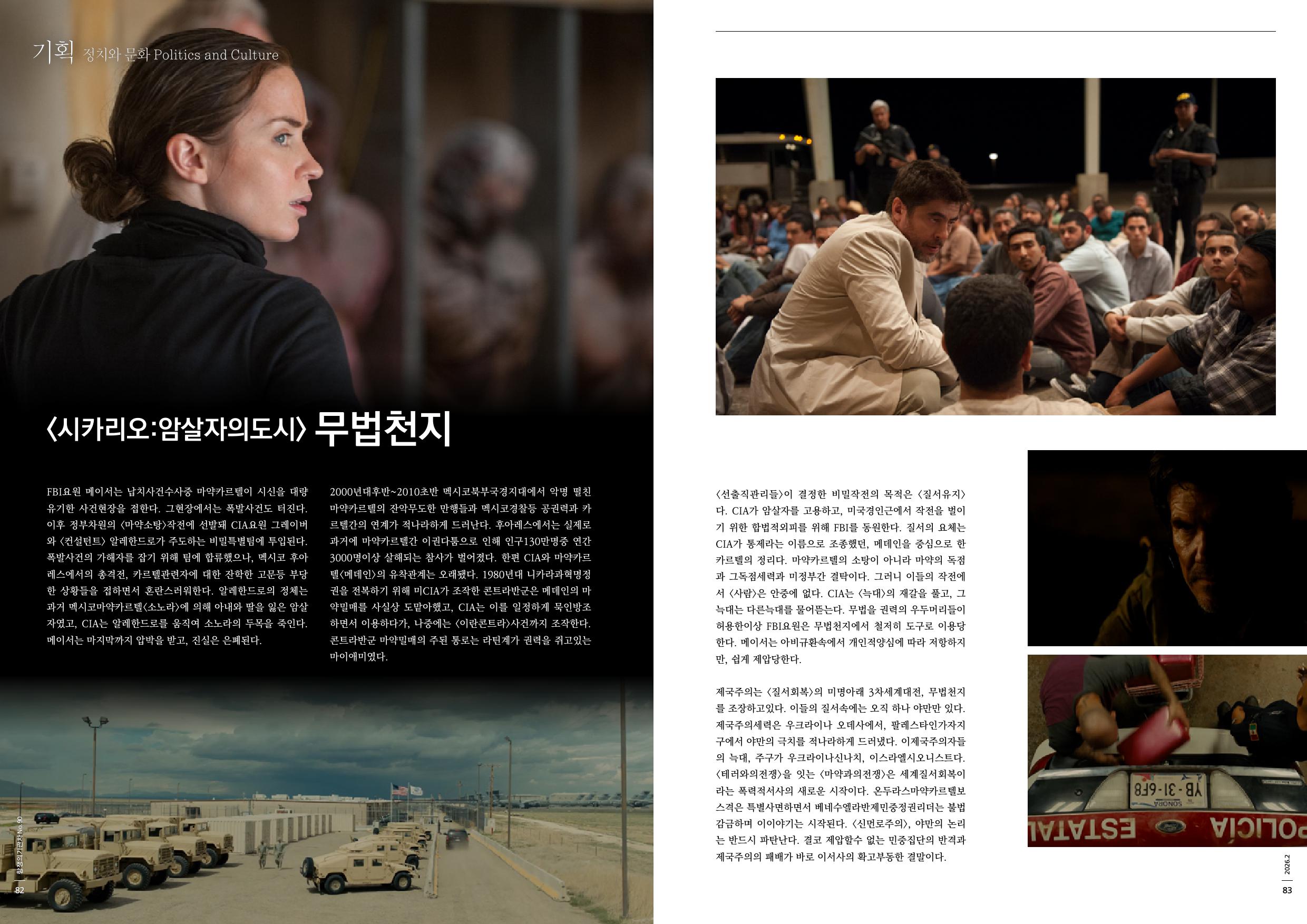 2000년대후반~2010초반 멕시코북부국경지대에서 악명 떨친 마약카르텔의 잔악무도한 만행들과 멕시코경찰등 공권력과 카르텔간의 연계가 적나라하게 드러난다. 후아레스에서는 실제로 과거에 마약카르텔간 이권다툼으로 인해 인구130만명중 연간3000명이상 살해되는 참사가 벌어졌다. 한편 CIA와 마약카르텔<메데인>의 유착관계는 오래됐다. 1980년대 니카라과혁명정권을 전복하기 위해 미CIA가 조작한 콘트라반군은 메데인의 마약밀매를 사실상 도맡아했고, CIA는 이를 일정하게 묵인방조하면서 이용하다가, 나중에는 <이란콘트라>사건까지 조작한다. 콘트라반군 마약밀매의 주된 통로는 라틴계가 권력을 쥐고있는 마이애미였다.