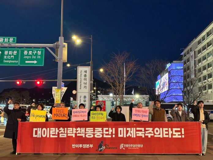 27일 반미투쟁본부·21세기체게바라(Defense Brigade)·민중민주당(민중당)은 미대사관앞에서 <대이란침략책동중단! 미제국주의타도!> 반제반파쇼정당연설회를 진행했다.