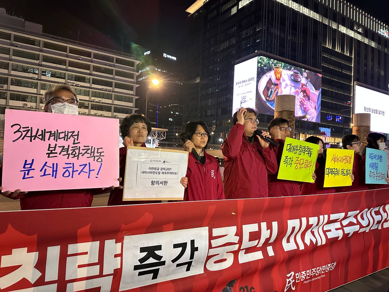 민중민주당서울시당위원장은 <오늘 우리는 기필코 세계를 전쟁의 참화에 밀어넣으려는 제국주의의 만행에 분노를 안고 이 거리에 섰다. 이것은 단순히 한 국가에 대한 공격이 아니다. 자국의 이익과 쇠락해 가는 패권을 연장하기 위해, 수많은 민중을 피비린내 나는 살육전으로 몰아넣는 극악무도한 범죄행위다. 지금 벌어지는 이란전은 단순한 국지적 분쟁이 아니다. 이스라엘의 선제타격과 미국의 비호는 서아시아전체를 불바다로 만드는 <서아시아전>이며, 종국에는 인류 전체를 파멸로 몰아넣을 <3차세계대전>의 서막이다. 우리는 미국과 이스라엘이 주도하는 이 참혹한 3차세계대전 본격화책동을 결단코 분쇄해야 한다.>고 힘줘 말했다.