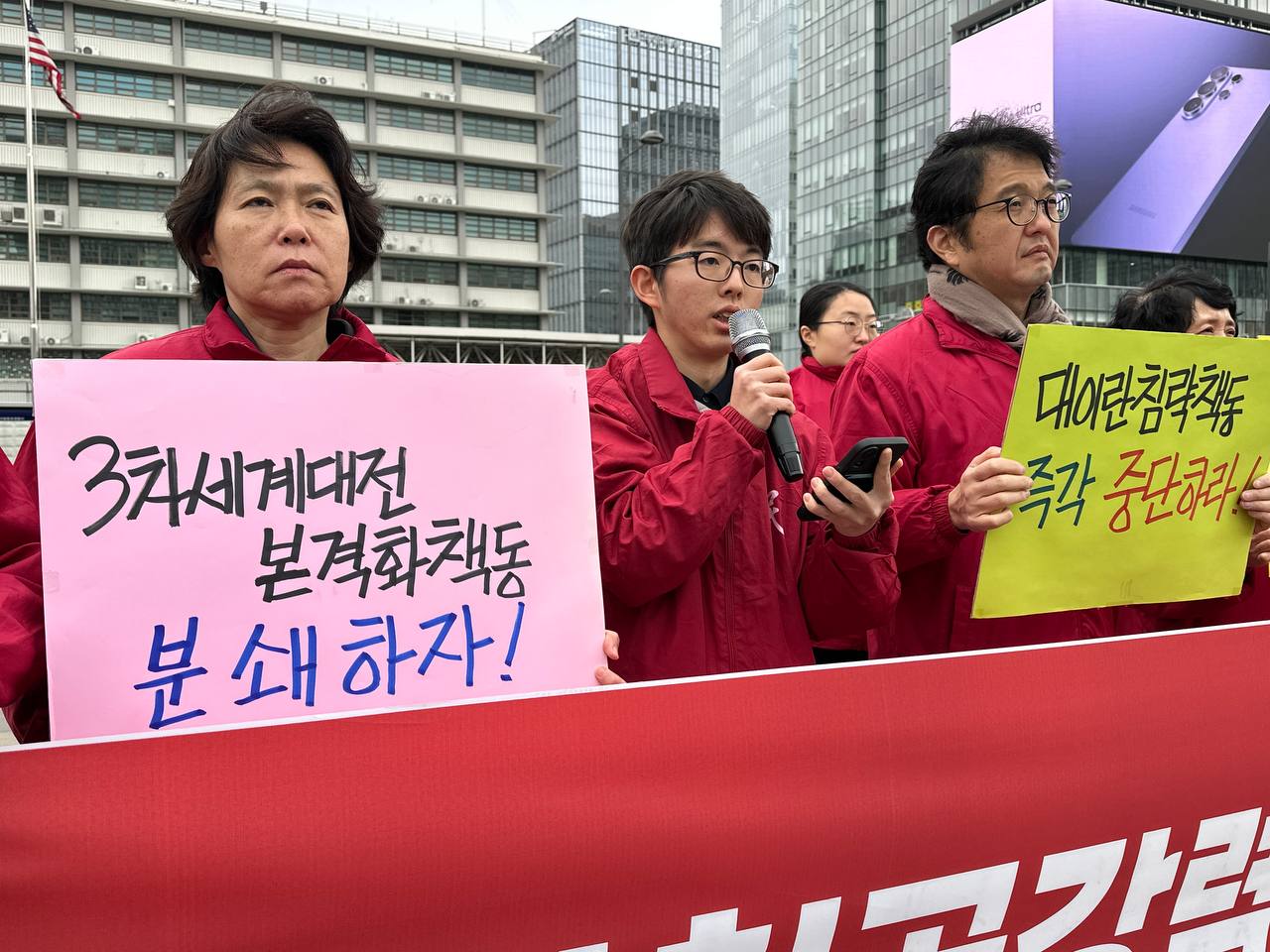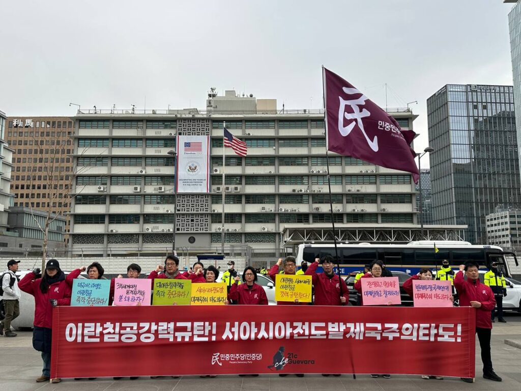 1일 민중민주당(민중당)은 미대사관앞에서 <이란침공강력규탄! 서아시아전도발제국주의타도!> 7차정당연설회를 진행했다.