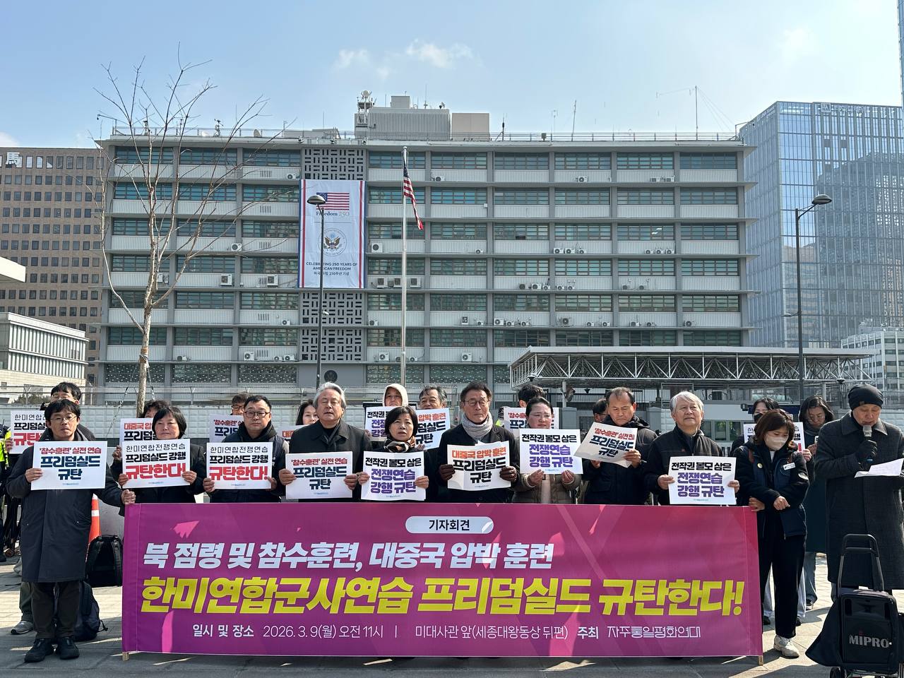 Home일반・기획・특집민생・사회민중민주당, 〈북점령및참수훈련, 대중국압박훈련 〈한〉미연합군사연습 〈프리덤실드〉 중단하라〉 기자회견 참가 민생・사회 민중민주당, 〈북점령및참수훈련, 대중국압박훈련 〈한〉미연합군사연습 〈프리덤실드〉 중단하라〉 기자회견 참가 2026-03-09 9일 민중민주당(민중당)은 미대사관앞에서 진행된 <북점령및참수훈련, 대중국압박훈련 <한>미연합군사연습 <프리덤실드> 중단하라> 기자회견에 참가했다. 이날 기자회견은 자주통일평화연대가 주최로, 전국 동시다발로 진행됐다. 참가자들은 3월9일부터 시작되는 <한>미연합군사연습 <프리덤실드>의 중단을 촉구했다. Previous article[노동신문] 3.8국제부녀절 116돌기념 중앙보고회 진행Next article위험한 시기에 벌이는 무모한 침략전쟁연습 관련기사 〈미국·이스라엘의 이란침략사태에 관한 각계공동시국선언〉 발표기자회견 개최 2026-03-18 〈국가보안법구속자석방과 수사·기소중단 국가보안법 철폐〉 석권호석방대책위·이정훈석방대책위 청와대앞 기자회견 2026-03-17 민중민주당반미반전특위, 〈미국의 호르무즈해협 파병요구규탄 및 파병반대〉 긴급기자회견 참가 2026-03-16 최신기사 이란 미·이스라엘에 대해 미사용무기배치 예정 국제 2026-03-19 이란외무장관, 휴전이 아닌 종전을 원한다 국제 2026-03-19 이란, 이스라엘4개도시와 서아시아미군기지 공습 최신기사 2026-03-19 이란, 이스라엘에 의한 고위직 사망 확인 국제 2026-03-19 사설 제국주의미국의 총알받이가 되기를 거부해야한다 2026-03-16 대미투자는 제국주의난파선에 올라타는 것 2026-03-14 위험한 시기에 벌이는 무모한 침략전쟁연습 2026-03-09 3차세계대전의 본격화를 불러오는 대이란전면전도발 2026-03-01 글 〈왝더독〉 영화와 현실 2026-03-18 발악하는 트럼프, 지상군 투입하나 2026-03-16 불 좋아하다가 그불에 타죽는다 2026-03-12 비호전에서 호전을 넘어 호전광으로 2026-03-10 검색 - Advertisement -