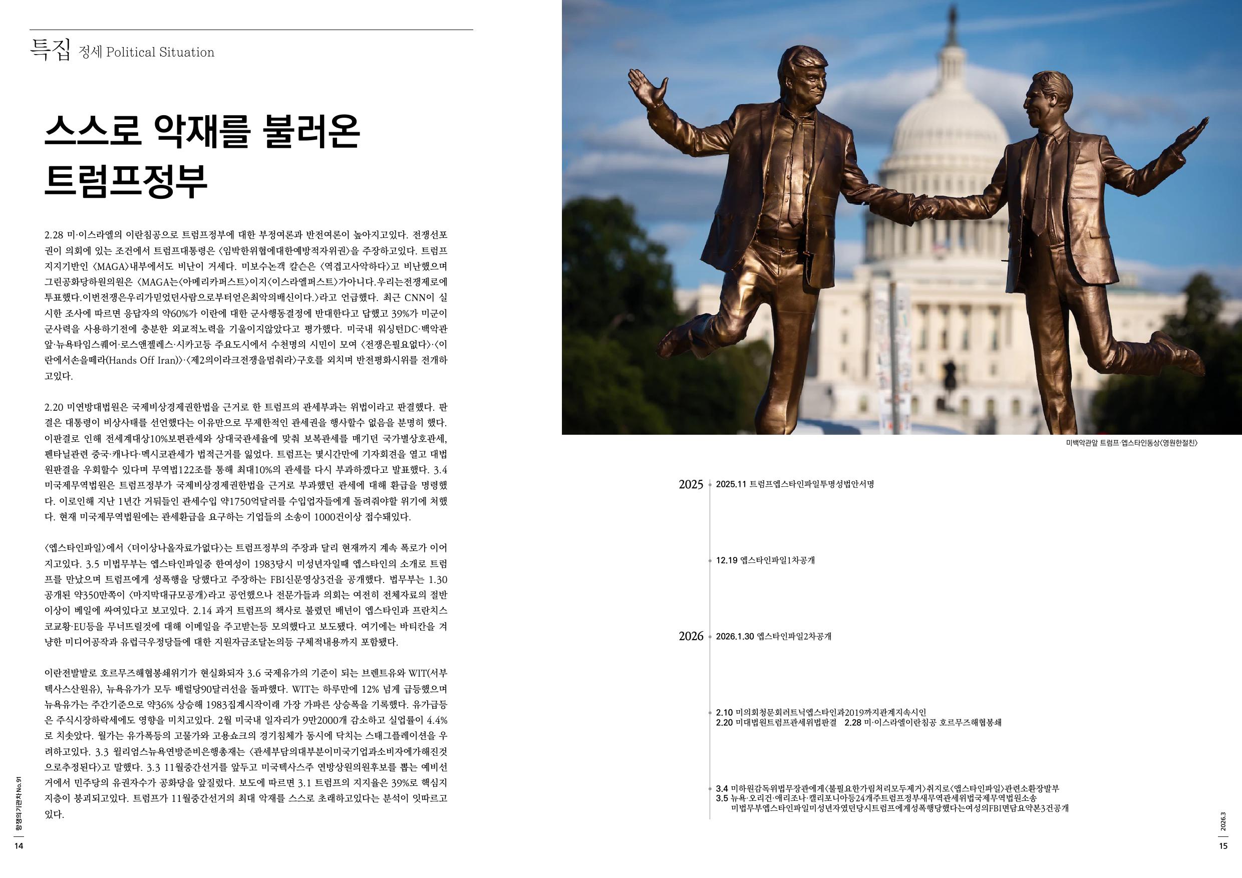 2.20 미연방대법원은 국제비상경제권한법을 근거로 한 트럼프의 관세부과는 위법이라고 판결했다. 판결은 대통령이 비상사태를 선언했다는 이유만으로 무제한적인 관세권을 행사할수 없음을 분명히 했다. 이판결로 인해 전세계대상10%보편관세와 상대국관세율에 맞춰 보복관세를 매기던 국가별상호관세, 펜타닐관련 중국·캐나다·멕시코관세가 법적근거를 잃었다. 트럼프는 몇시간만에 기자회견을 열고 대법원판결을 우회할수 있다며 무역법122조를 통해 최대10%의 관세를 다시 부과하겠다고 발표했다. 3.4 미국제무역법원은 트럼프정부가 국제비상경제권한법을 근거로 부과했던 관세에 대해 환급을 명령했다. 이로인해 지난 1년간 거둬들인 관세수입 약1750억달러를 수입업자들에게 돌려줘야할 위기에 처했다. 현재 미국제무역법원에는 관세환급을 요구하는 기업들의 소송이 1000건이상 접수돼있다.