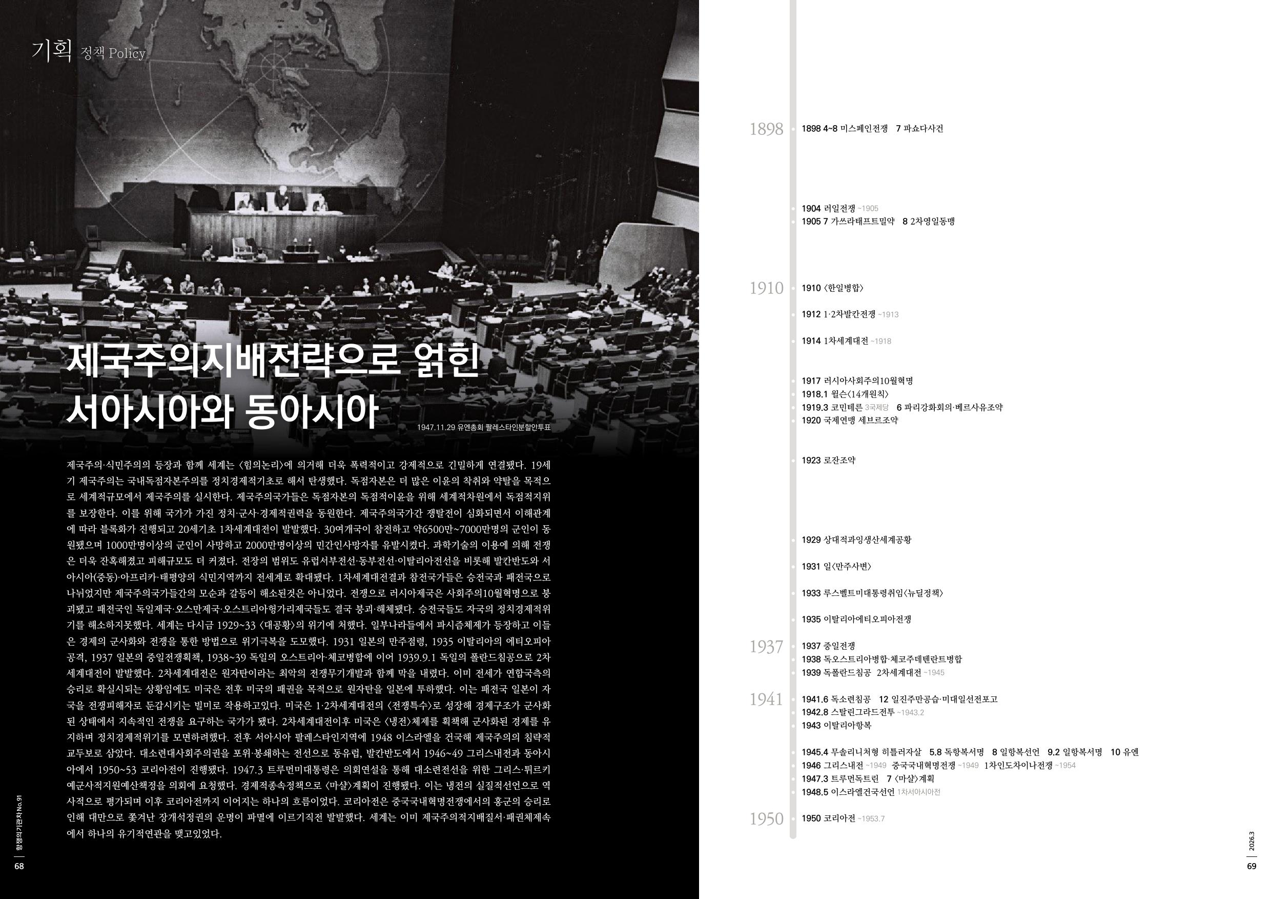 제국주의·식민주의의 등장과 함께 세계는 <힘의논리>에 의거해 더욱 폭력적이고 강제적으로 긴밀하게 연결됐다. 19세기 제국주의는 국내독점자본주의를 정치경제적기초로 해서 탄생했다. 독점자본은 더 많은 이윤의 착취와 약탈을 목적으로 세계적규모에서 제국주의를 실시한다. 제국주의국가들은 독점자본의 독점적이윤을 위해 세계적차원에서 독점적지위를 보장한다. 이를 위해 국가가 가진 정치·군사·경제적권력을 동원한다. 제국주의국가간 쟁탈전이 심화되면서 이해관계에 따라 블록화가 진행되고 20세기초 1차세계대전이 발발했다. 30여개국이 참전하고 약6500만~7000만명의 군인이 동원됐으며 1000만명이상의 군인이 사망하고 2000만명이상의 민간인사망자를 유발시켰다. 과학기술의 이용에 의해 전쟁은 더욱 잔혹해졌고 피해규모도 더 커졌다. 전장의 범위도 유럽서부전선·동부전선·이탈리아전선을 비롯해 발칸반도와 서아시아(중동)·아프리카·태평양의 식민지역까지 전세계로 확대됐다. 1차세계대전결과 참전국가들은 승전국과 패전국으로 나뉘었지만 제국주의국가들간의 모순과 갈등이 해소된것은 아니었다. 전쟁으로 러시아제국은 사회주의10월혁명으로 붕괴됐고 패전국인 독일제국·오스만제국·오스트리아헝가리제국들도 결국 붕괴·해체됐다. 승전국들도 자국의 정치경제적위기를 해소하지못했다. 세계는 다시금 1929~33 <대공황>의 위기에 처했다. 일부나라들에서 파시즘체제가 등장하고 이들은 경제의 군사화와 전쟁을 통한 방법으로 위기극복을 도모했다. 1931 일본의 만주점령, 1935 이탈리아의 에티오피아공격, 1937 일본의 중일전쟁획책, 1938~39 독일의 오스트리아·체코병합에 이어 1939.9.1 독일의 폴란드침공으로 2차세계대전이 발발했다. 2차세계대전은 원자탄이라는 최악의 전쟁무기개발과 함께 막을 내렸다. 이미 전세가 연합국측의 승리로 확실시되는 상황임에도 미국은 전후 미국의 패권을 목적으로 원자탄을 일본에 투하했다. 이는 패전국 일본이 자국을 전쟁피해자로 둔갑시키는 빌미로 작용하고있다. 미국은 1·2차세계대전의 <전쟁특수>로 성장해 경제구조가 군사화된 상태에서 지속적인 전쟁을 요구하는 국가가 됐다. 2차세계대전이후 미국은 <냉전>체제를 획책해 군사화된 경제를 유지하며 정치경제적위기를 모면하려했다. 전후 서아시아 팔레스타인지역에 1948 이스라엘을 건국해 제국주의의 침략적교두보로 삼았다. 대소련대사회주의권을 포위·봉쇄하는 전선으로 동유럽, 발칸반도에서 1946~49 그리스내전과 동아시아에서 1950~53 코리아전이 진행됐다. 1947.3 트루먼미대통령은 의회연설을 통해 대소련전선을 위한 그리스·튀르키예군사적지원예산책정을 의회에 요청했다. 경제적종속정책으로 <마샬>계획이 진행됐다. 이는 냉전의 실질적선언으로 역사적으로 평가되며 이후 코리아전까지 이어지는 하나의 흐름이었다. 코리아전은 중국국내혁명전쟁에서의 홍군의 승리로 인해 대만으로 쫓겨난 장개석정권의 운명이 파멸에 이르기직전 발발했다. 세계는 이미 제국주의적지배질서·패권체제속에서 하나의 유기적연관을 맺고있었다.
