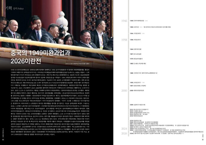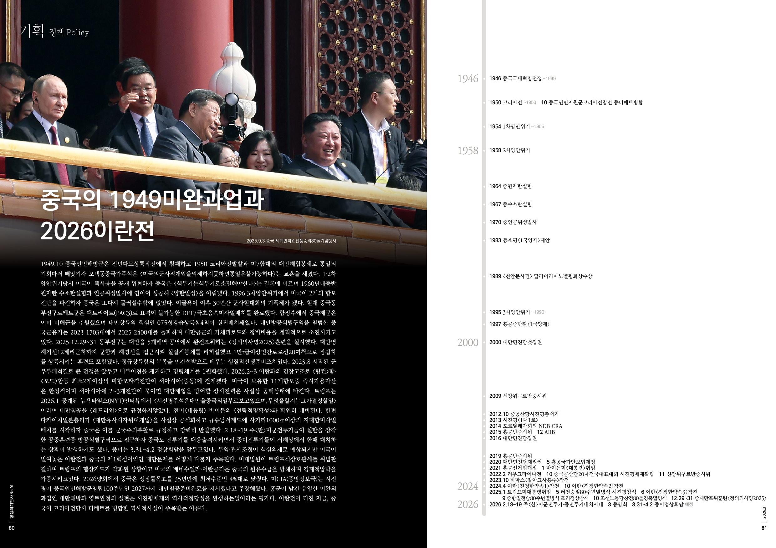 1949.10 중국인민해방군은 진먼다오상륙작전에서 참패하고 1950 코리아전발발과 미7함대의 대만해협봉쇄로 통일의 기회마저 빼앗기자 모택동중국가주석은 <미국의군사적개입을억제하지못하면통일은불가능하다>는 교훈을 새겼다. 1·2차양안위기당시 미국이 핵사용을 공개 위협하자 중국은 <핵무기는핵무기로소멸해야한다>는 결론에 이르며 1960년대중반 원자탄·수소탄실험과 인공위성발사에 연이어 성공해 <양탄일성>을 이뤄냈다. 1996 3차양안위기에서 미국이 2개의 항모전단을 파견하자 중국은 또다시 물러설수밖에 없었다. 이굴욕이 이후 30년간 군사현대화의 기폭제가 됐다. 현재 중국동부전구로케트군은 패트리어트(PAC3)로 요격이 불가능한 DF17극초음속미사일배치를 완료했다. 함정수에서 중국해군은 이미 미해군을 추월했으며 대만상륙의 핵심인 075형강습상륙함4척이 실전배치돼있다. 대만방공식별구역을 침범한 중국군용기는 2023 1703대에서 2025 2400대를 돌파하며 대만공군의 기체피로도와 정비비용을 계획적으로 소진시키고있다. 2025.12.29~31 동부전구는 대만을 5개해역·공역에서 완전포위하는 <정의의사명2025>훈련을 실시했다. 대만영해기선12해리근처까지 군함과 해경선을 접근시켜 실질적봉쇄를 리허설했고 1만t급이상민간로로선20여척으로 장갑차를 상륙시키는 훈련도 포함됐다. 정규상륙함의 부족을 민간선박으로 메우는 실질적전쟁준비조치였다. 2023.8 시작된 군부부패척결로 큰 전쟁을 앞두고 내부이견을 제거하고 명령체계를 1원화했다. 2026.2~3 이란과의 긴장고조로 <링컨>함·<포드>함등 최소2개이상의 미항모타격전단이 서아시아(중동)에 전개됐다. 미국이 보유한 11개항모중 즉시가용자산은 한정적이며 서아시아에 2~3개전단이 묶이면 대만해협을 방어할 상시전력은 사실상 공백상태에 빠진다. 트럼프는 2026.1 공개된 뉴욕타임스(NYT)인터뷰에서 <시진핑주석은대만을중국의일부로보고있으며,무엇을할지는그가결정할일>이라며 대만침공을 <레드라인>으로 규정하지않았다. 전미<대통령> 바이든의 <전략적명확성>과 확연히 대비된다. 한편 다카이치일본총리가 <대만유사시자위대개입>을 사실상 공식화하고 규슈남서제도에 사거리1000㎞이상의 지대함미사일배치를 시작하자 중국은 이를 군국주의부활로 규정하고 강력히 반발했다. 2.18~19 주<한>미군전투기들이 실탄을 장착한 공중훈련중 방공식별구역으로 접근하자 중국도 전투기를 대응출격시키면서 중미전투기들이 서해상에서 한때 대치하는 상황이 발생하기도 했다. 중미는 3.31~4.2 정상회담을 앞두고있다. 무역·관세조정이 핵심의제로 예상되지만 미국이 벌여놓은 이란전과 중국의 제1핵심이익인 대만문제를 어떻게 다룰지 주목된다. 미대법원이 트럼프식상호관세를 위법판결하며 트럼프의 협상카드가 약화된 상황이고 미국의 베네수엘라·이란공격은 중국의 원유수급을 방해하며 경제적압박을 가중시키고있다. 2026양회에서 중국은 성장률목표를 35년만에 최저수준인 4%대로 낮췄다. 미CIA(중앙정보국)는 시진핑이 중국인민해방군창립100주년인 2027까지 대만침공준비완료를 지시했다고 주장해왔다. 홍군이 남긴 유일한 미완의 과업인 대만해방과 영토완정의 실현은 시진핑체제의 역사적정당성을 완성하는일이라는 평가다. 이란전이 터진 지금, 중국이 코리아전당시 티베트를 병합한 역사적사실이 주목받는 이유다.